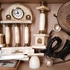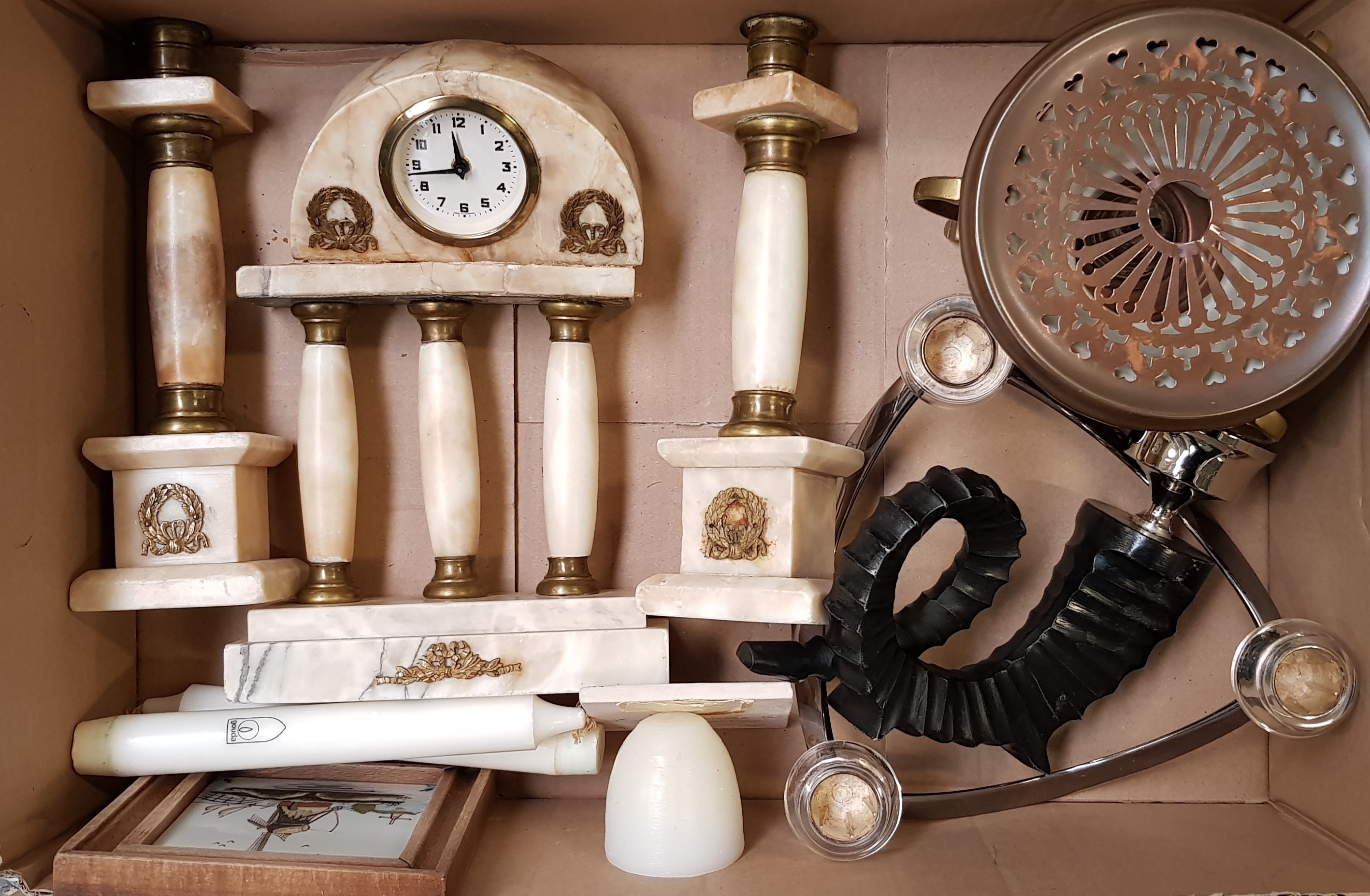 Lot curiosa met albasten klok ensemble met twee kandelaars gemerkt Germany, een koperen-messing theelicht met porseleinen inzet, een verzilverde Stelton kandelaar, een houten hoornvormige kandelaar en twee oud-Hollandse tegeltjes. 20e eeuw. |
