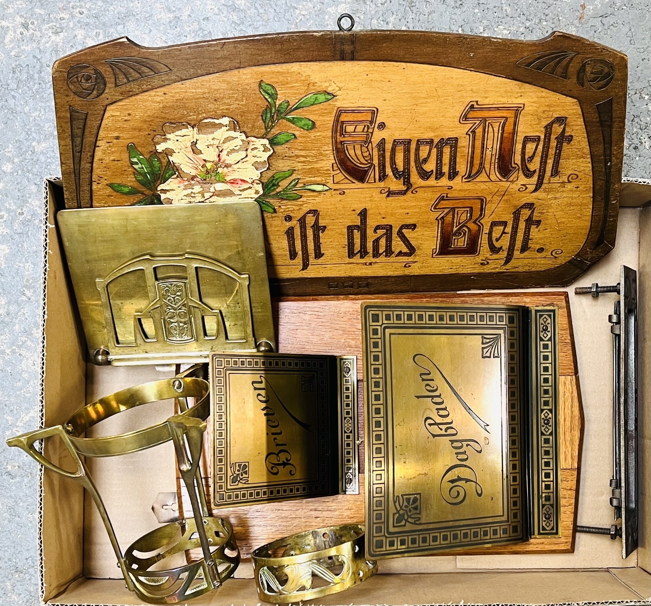 Lot curiosa met een messing Jugendstil boekensteun, een messing Jugendstil vaashouder, gietijzeren brievenbus met opschrift, brieven-en dagbladen wandhouder en een houten wandplaat met Duits opschrift. 20e eeuw. |