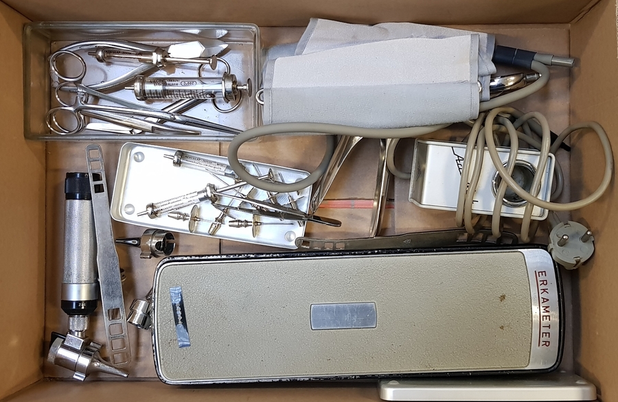 Lot medische curiosa met een otoscoop, injectiespuiten, pincetten en een erkameter. Tweede helft 20ste eeuw. |