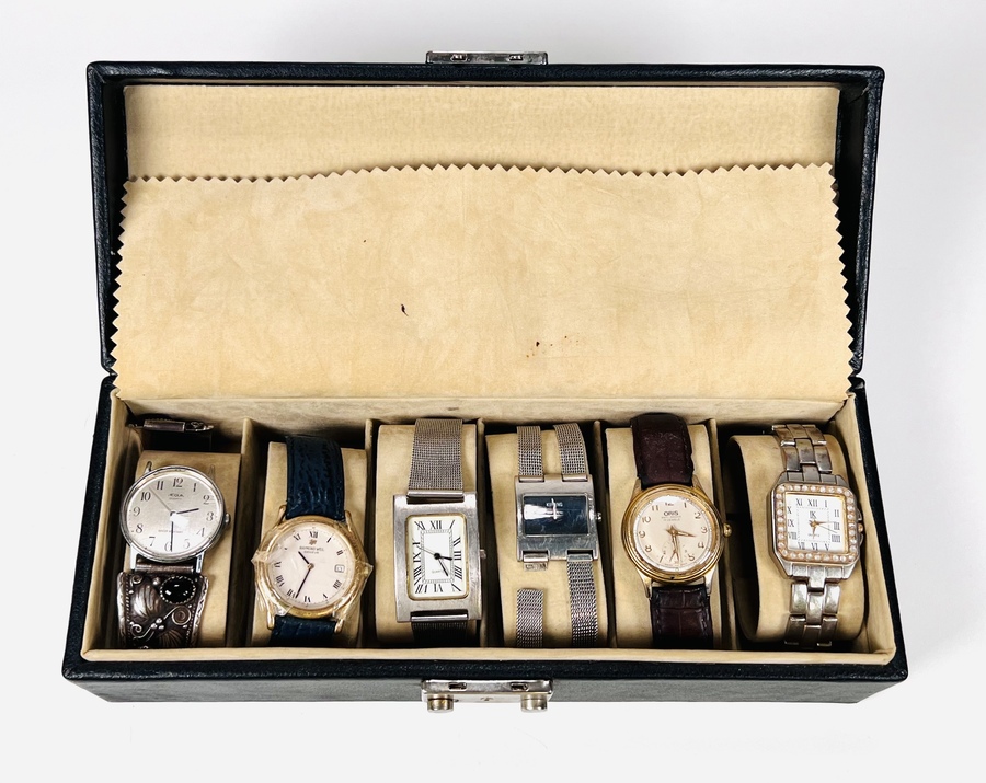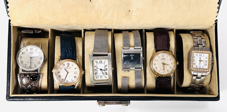 Lot met zes quartz dames horloges in horloge doos van de merken; Aqua, Raymond Weil, Oris, IK en Kipling. Eind 20e eeuw. |