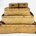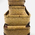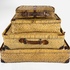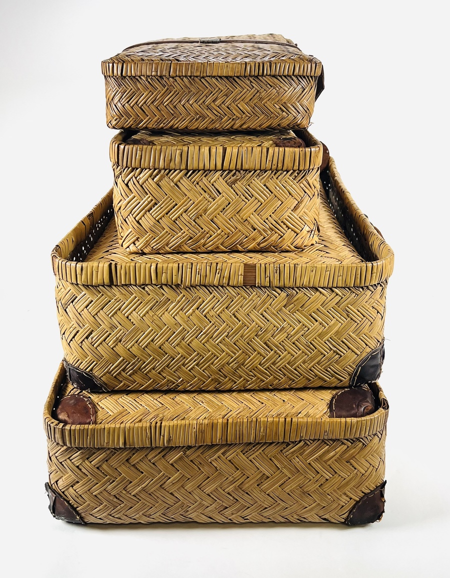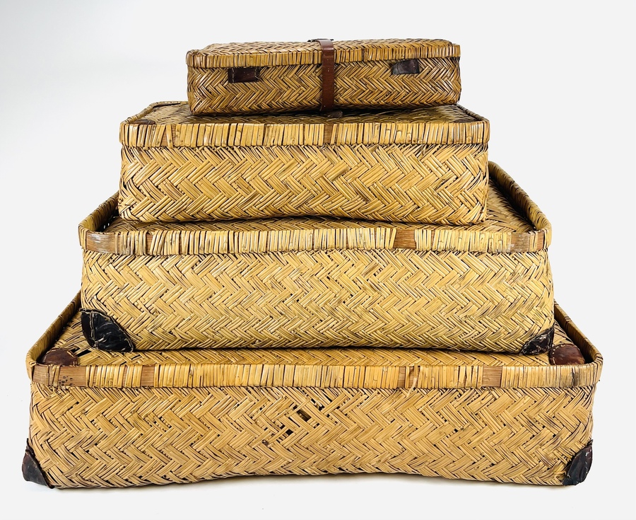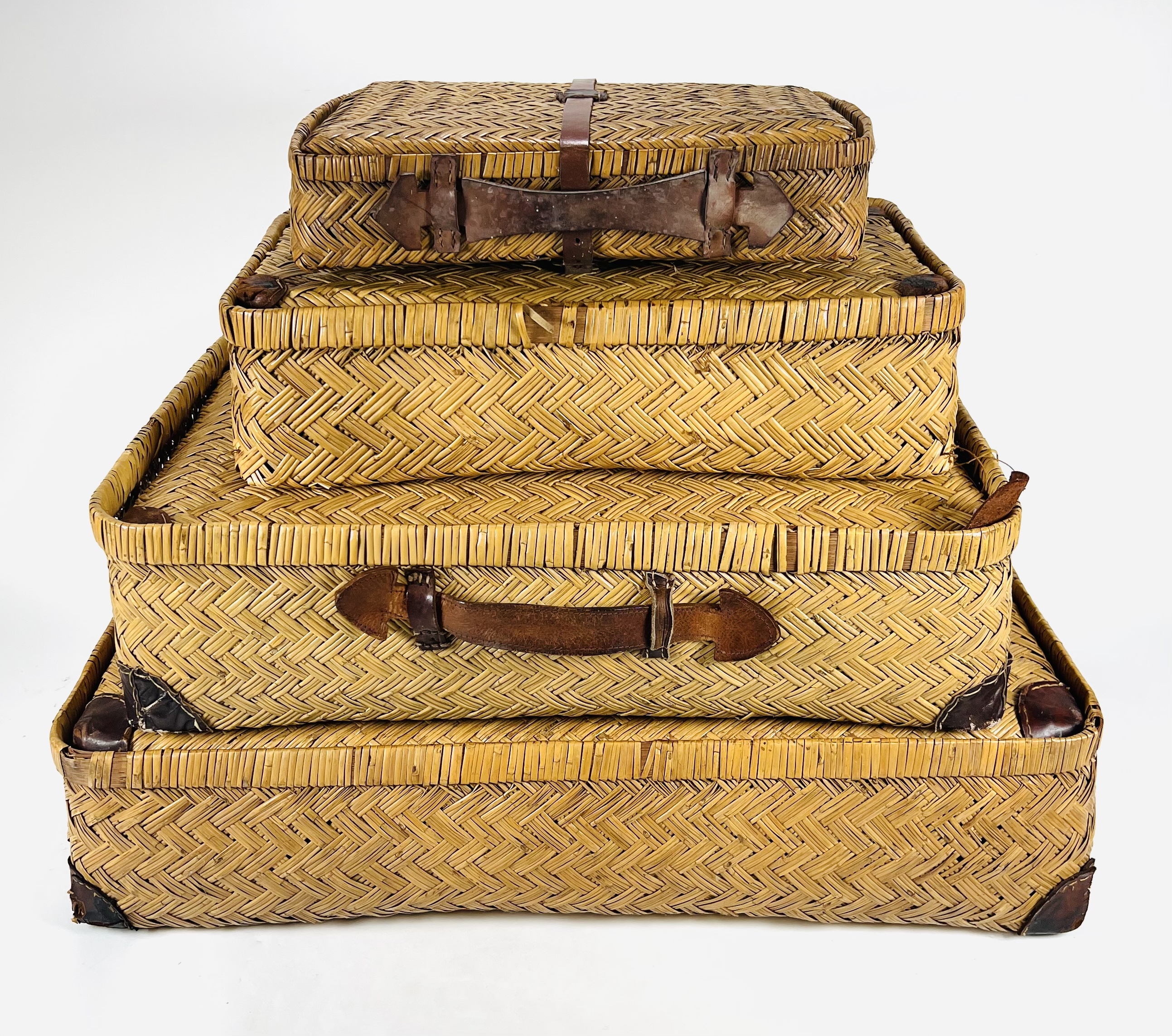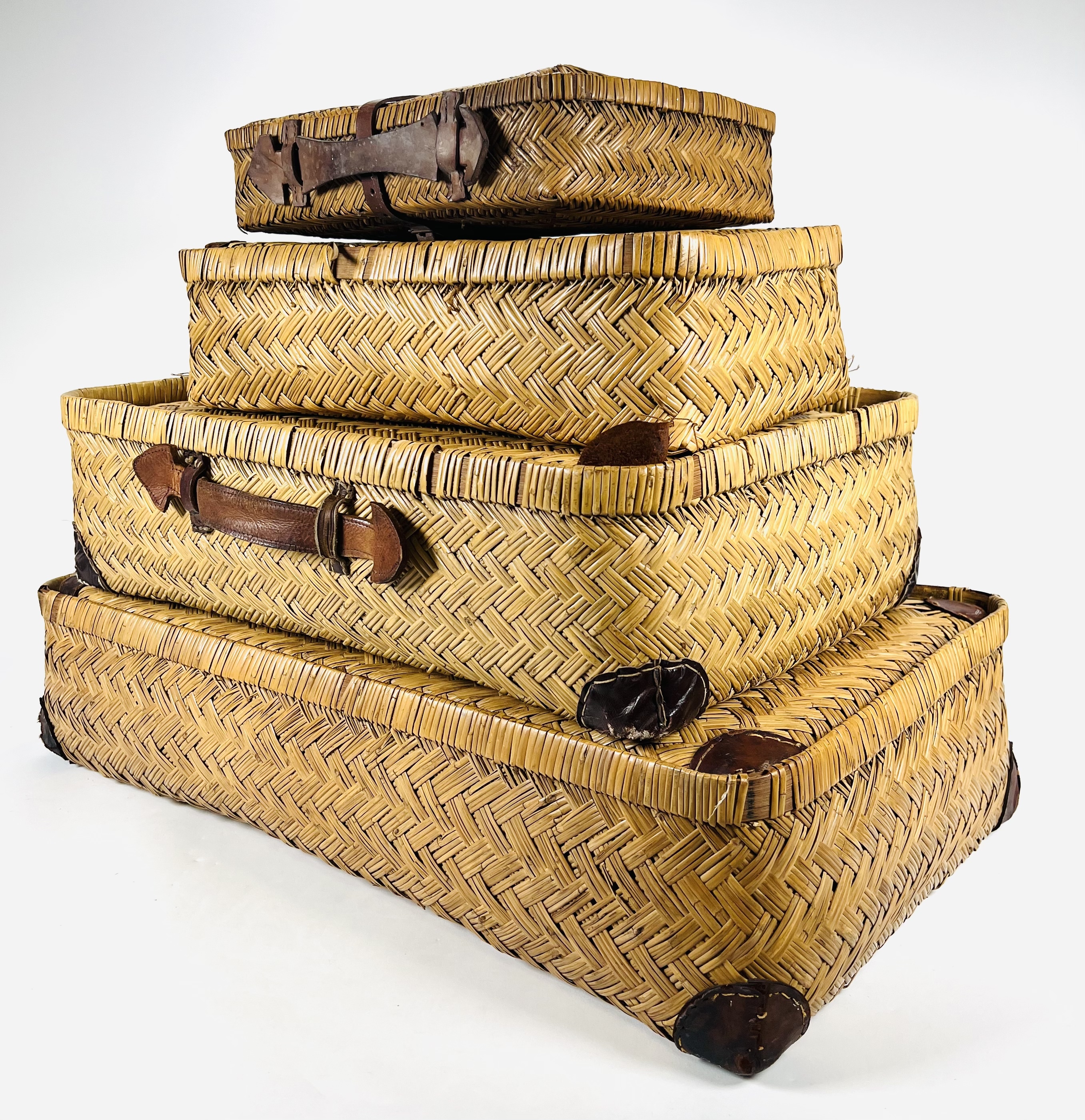 Vier gevlochten rieten manden met visgraat vlechtpatroon, twee lederen handvatten en diverse lederen hoekstukken ontbreken. Tweede kwart 20e eeuw. |