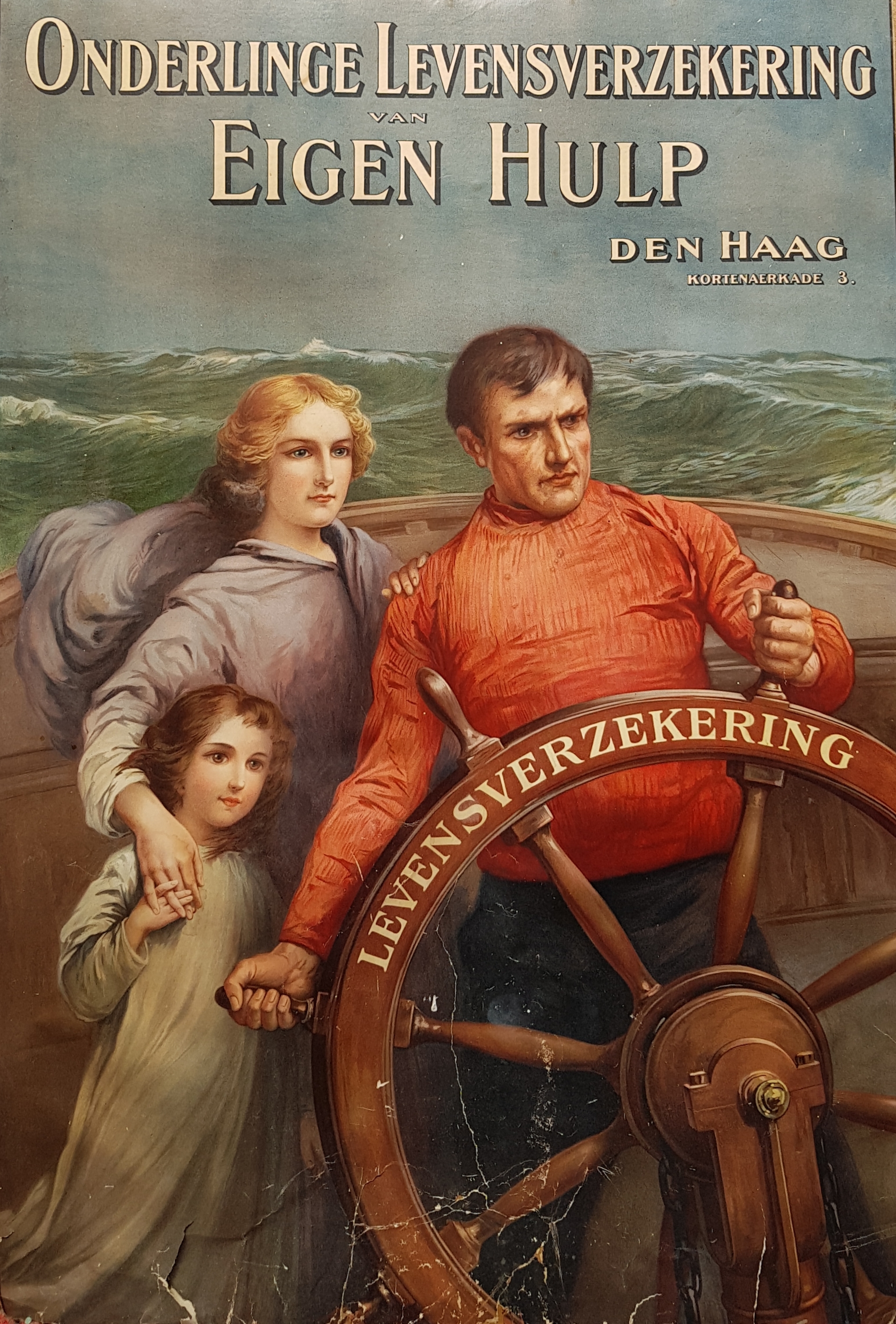 Reclame affiche op groot formaat van de Onderlinge Levensverzekering Eigen Hulp te Den Haag met de titel “Een goed stuurman”. Omstreeks 1912. |