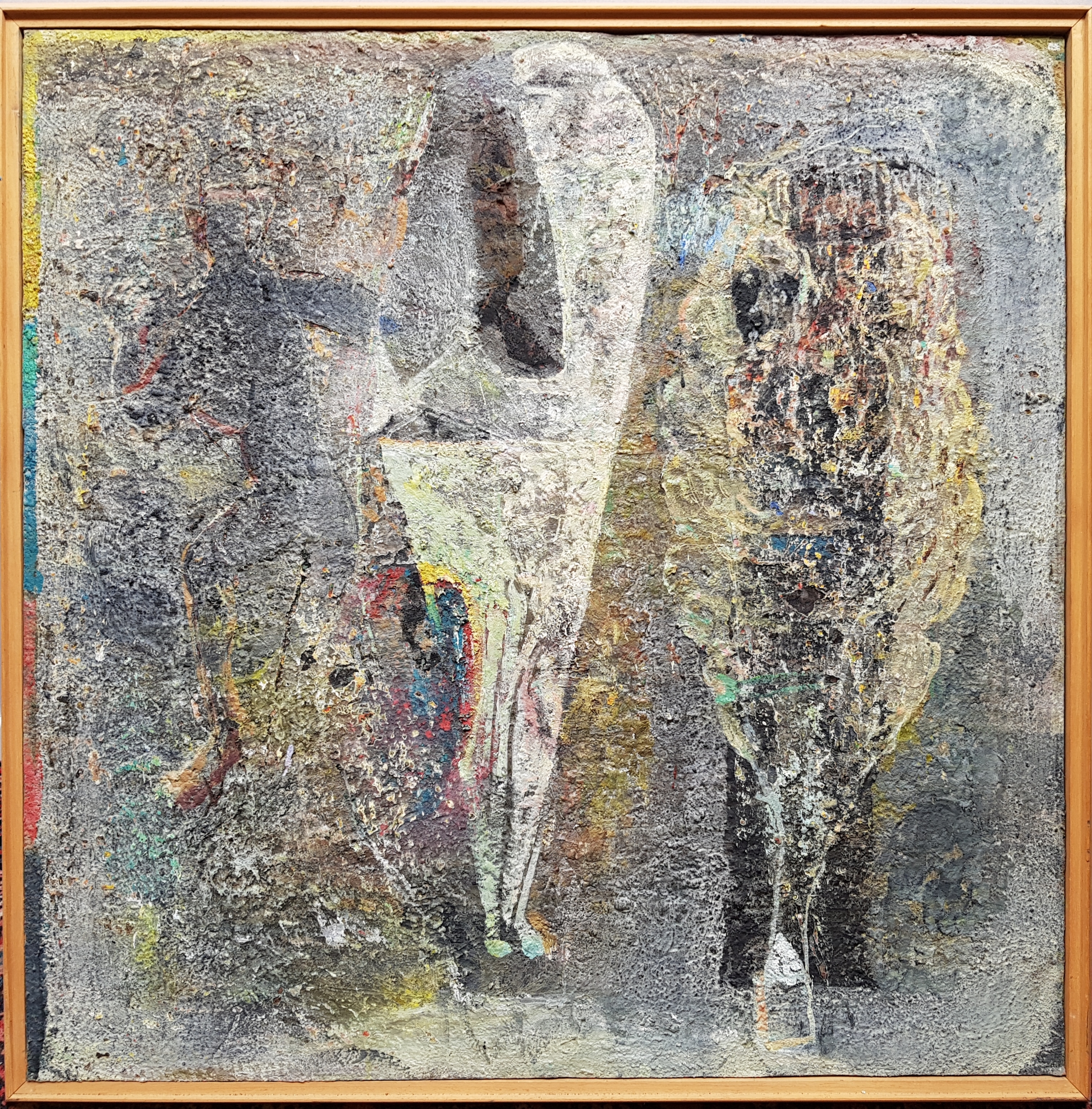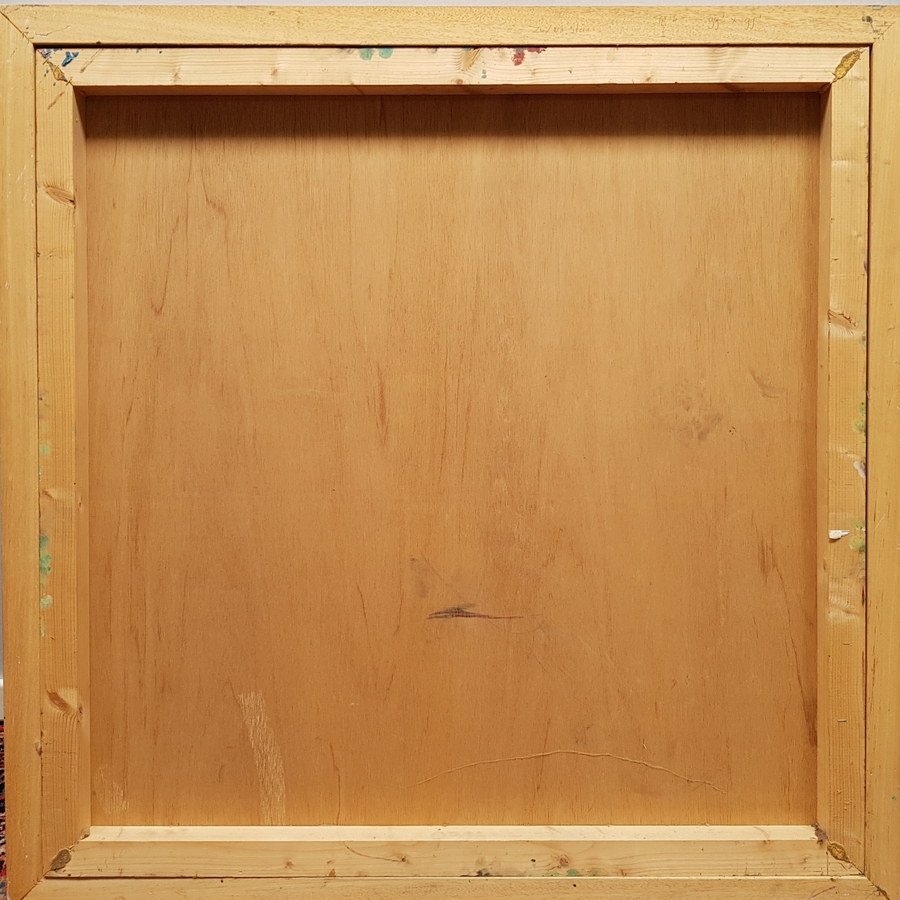 Abstract schilderij met symbolistische objecten, uitgevoerd in gemengde techniek. Anoniem, jaren 90. |