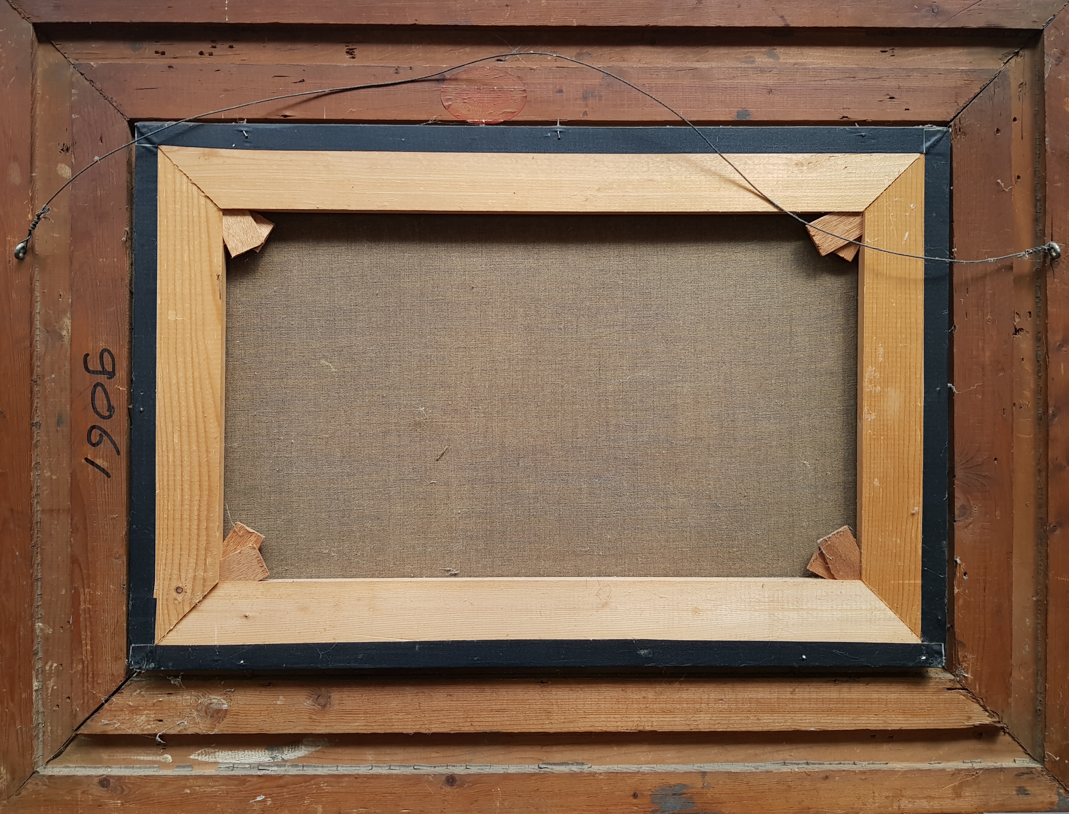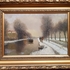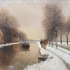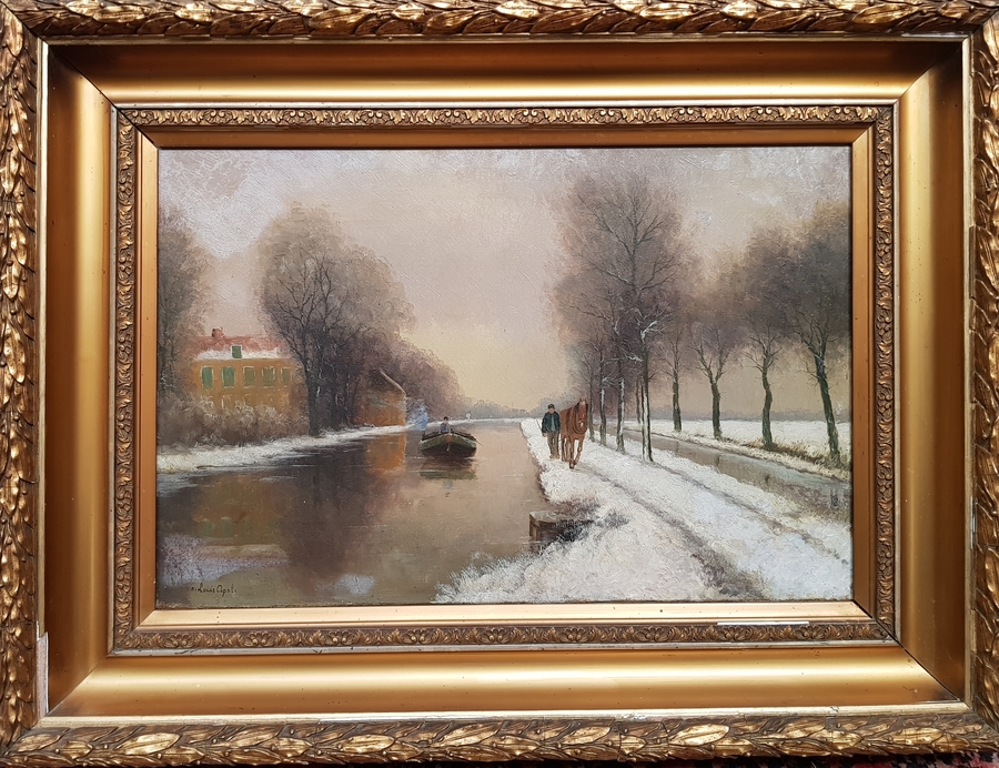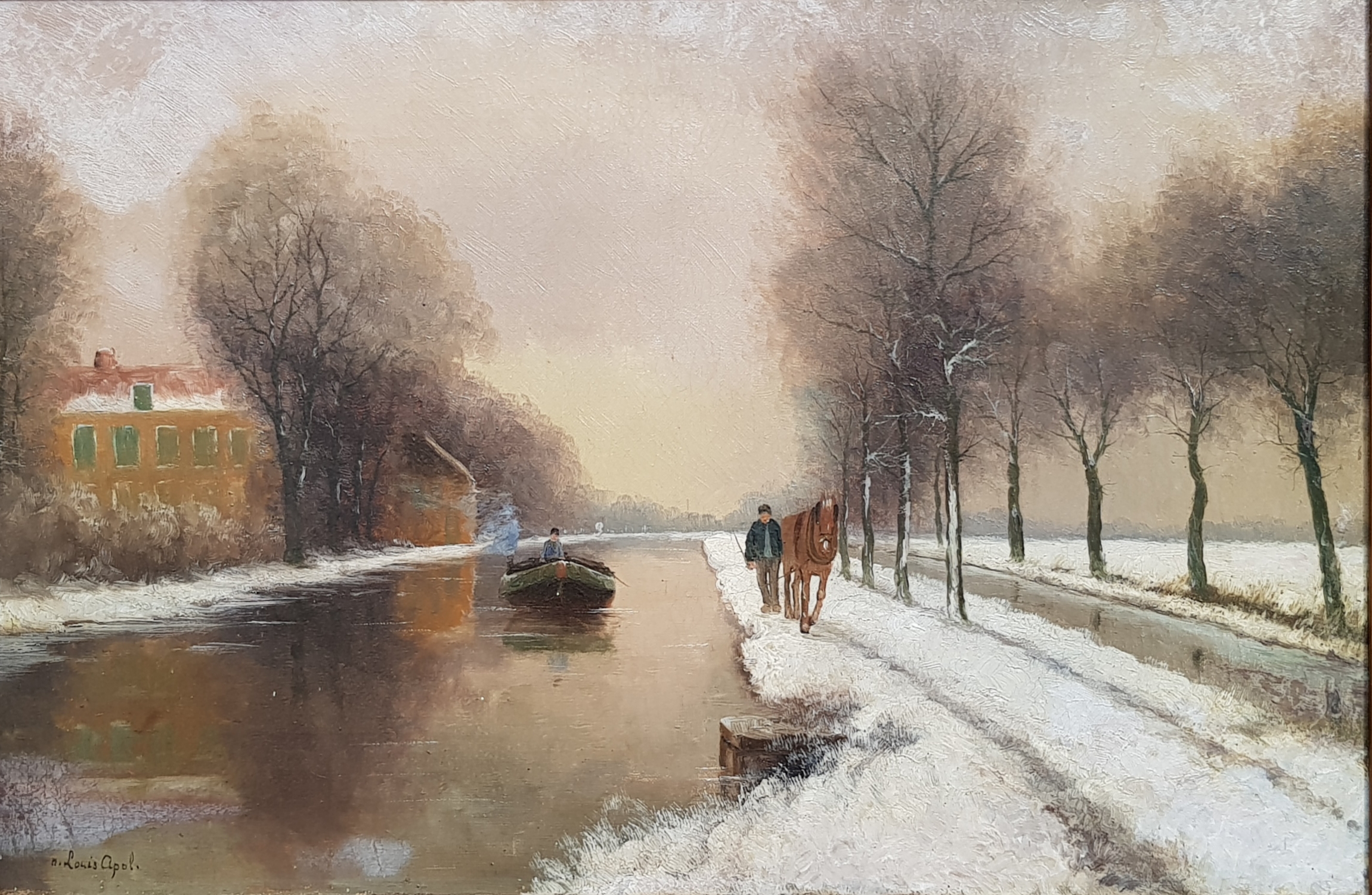 Schilderij, olieverf op linnen, van een winterlandschap met trekschuit en man en paard naar Louis Apol. 20e eeuw. |
