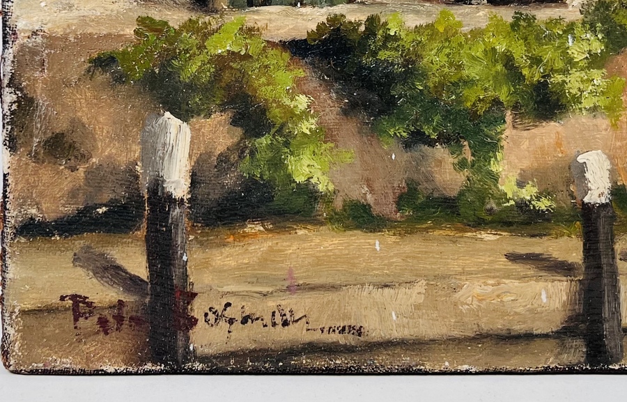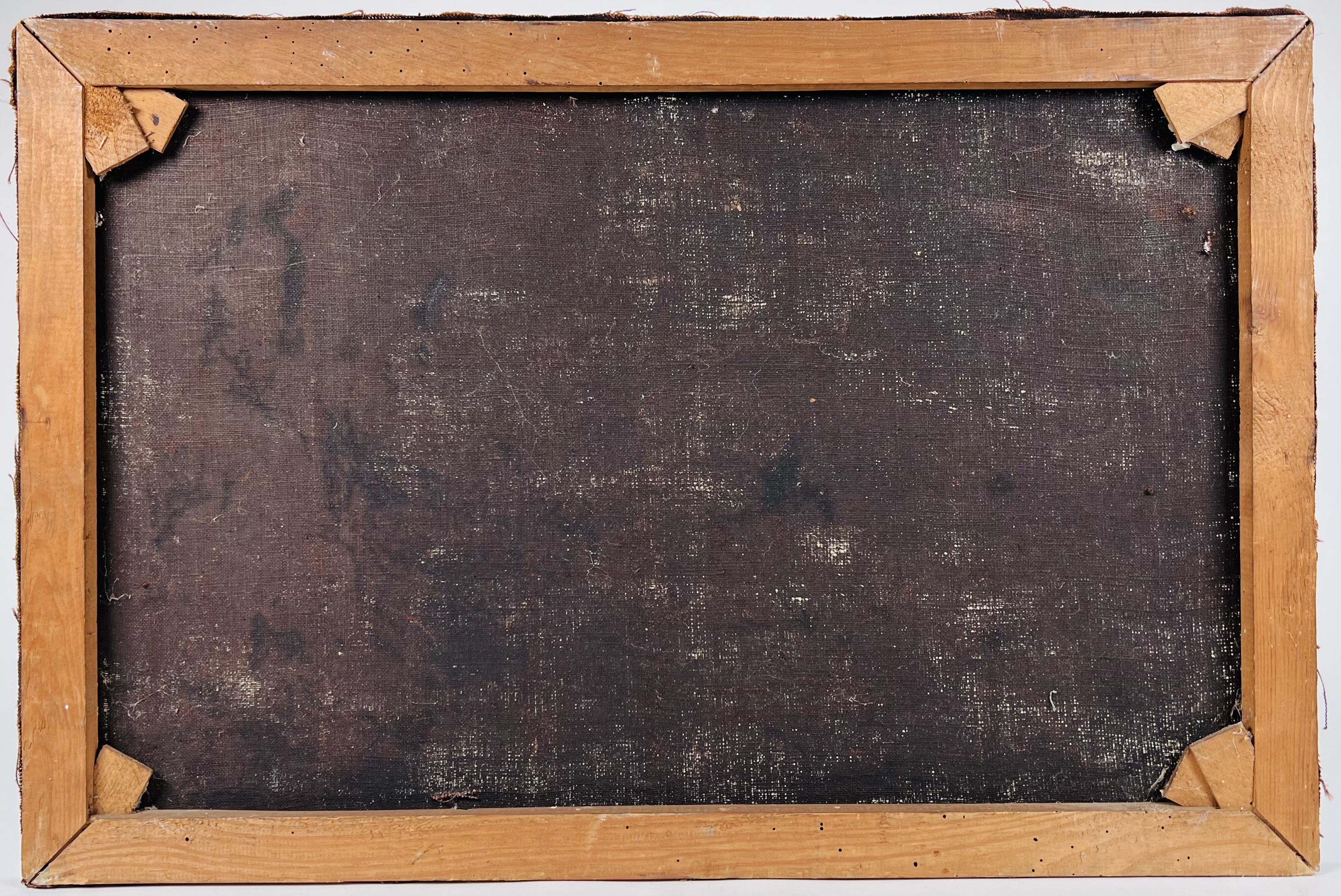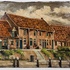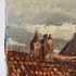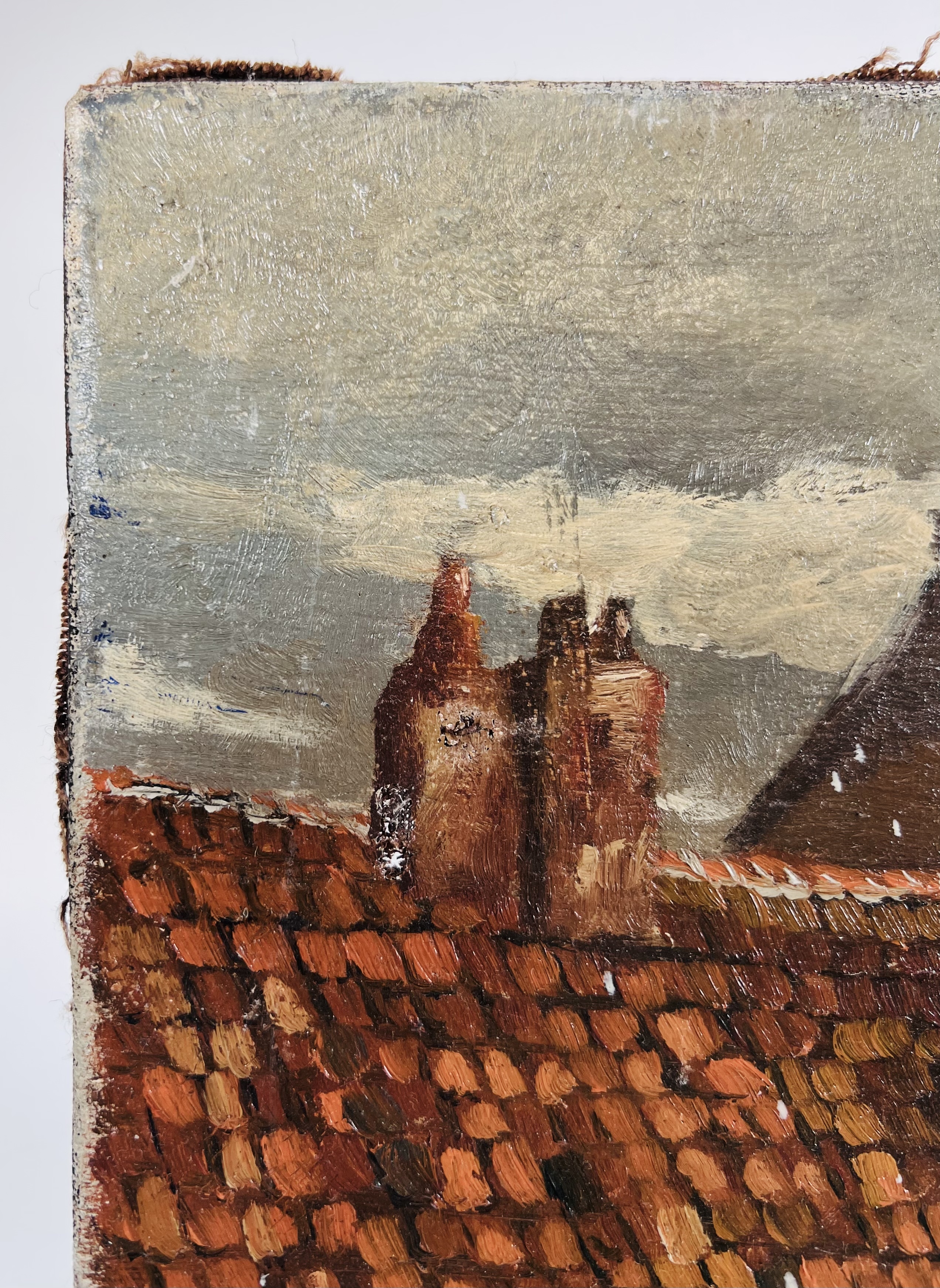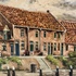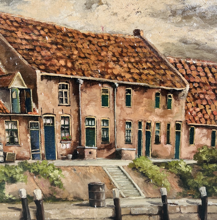 Schilderij van een huizenrij aan het water door Peter Bosman. Olieverf op linnen, linksonder gesigneerd Peter Bosman. Derde kwart 20e eeuw. |