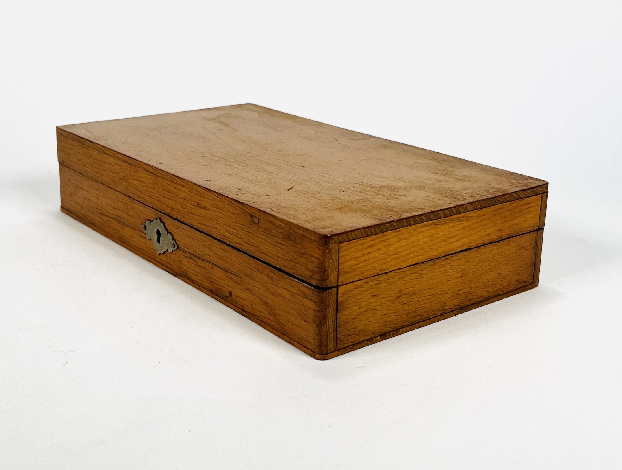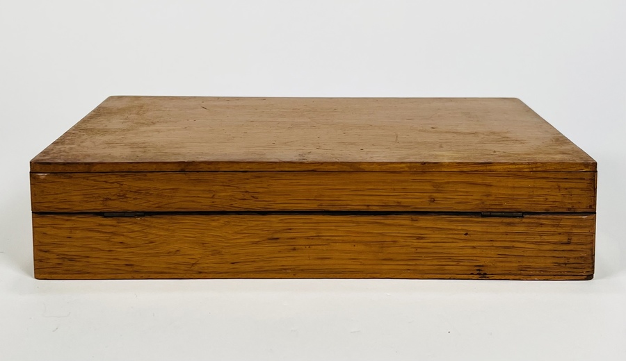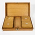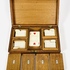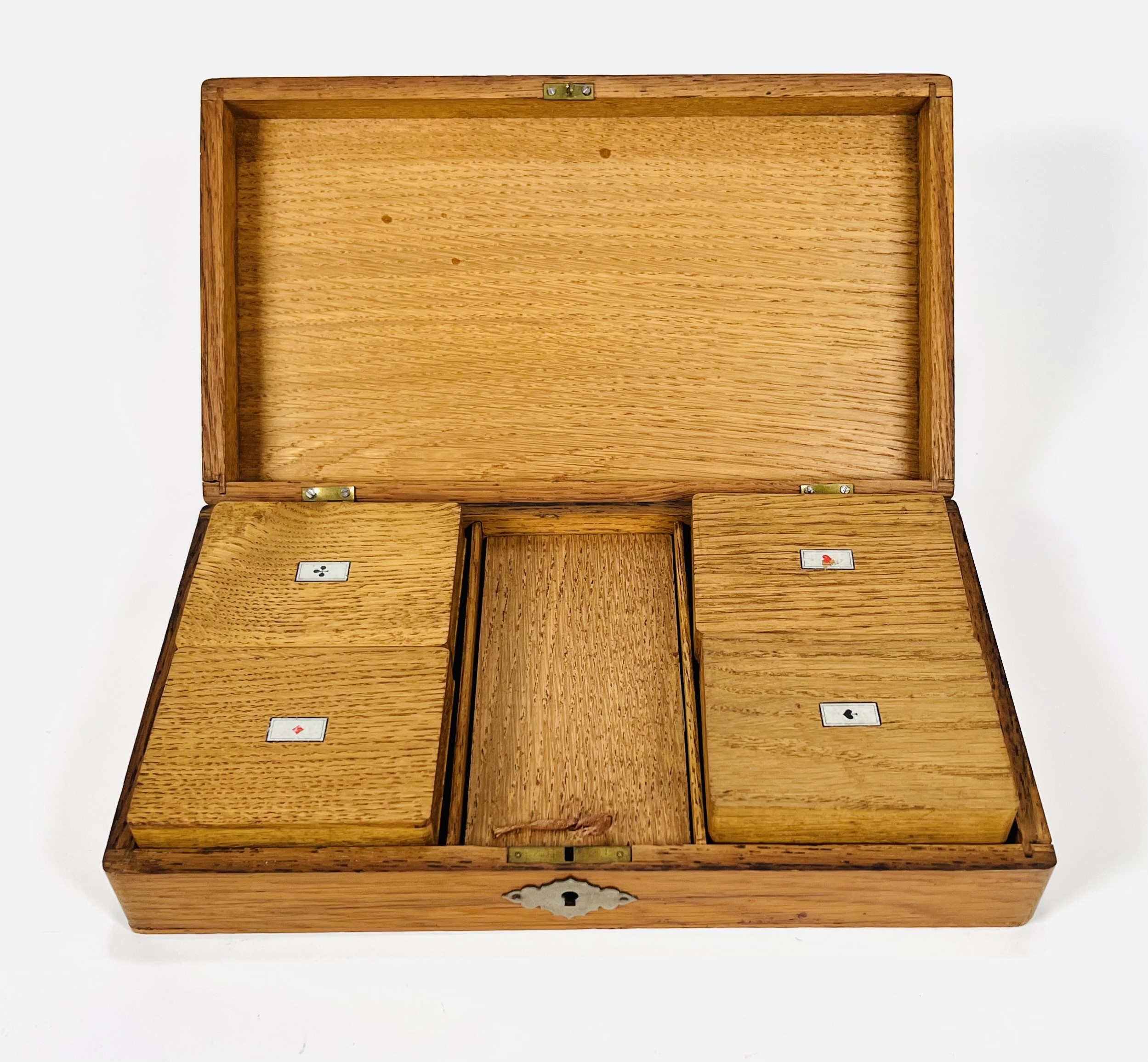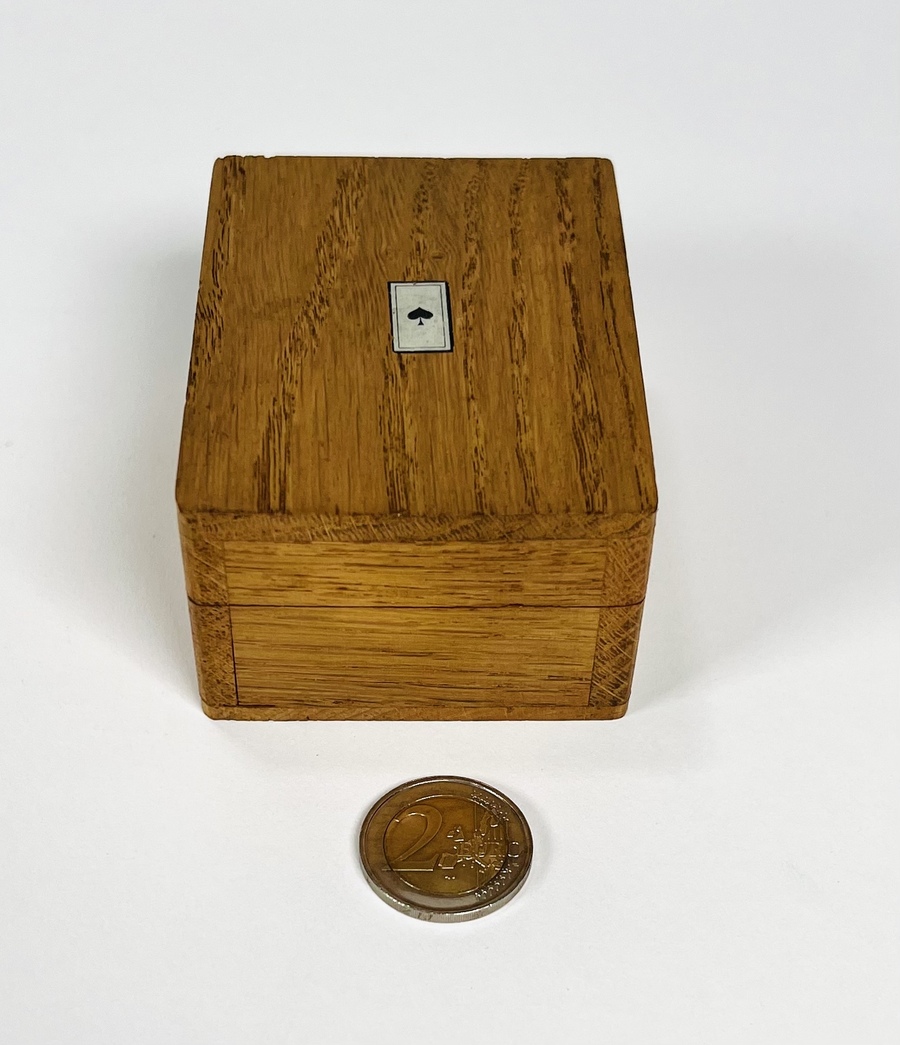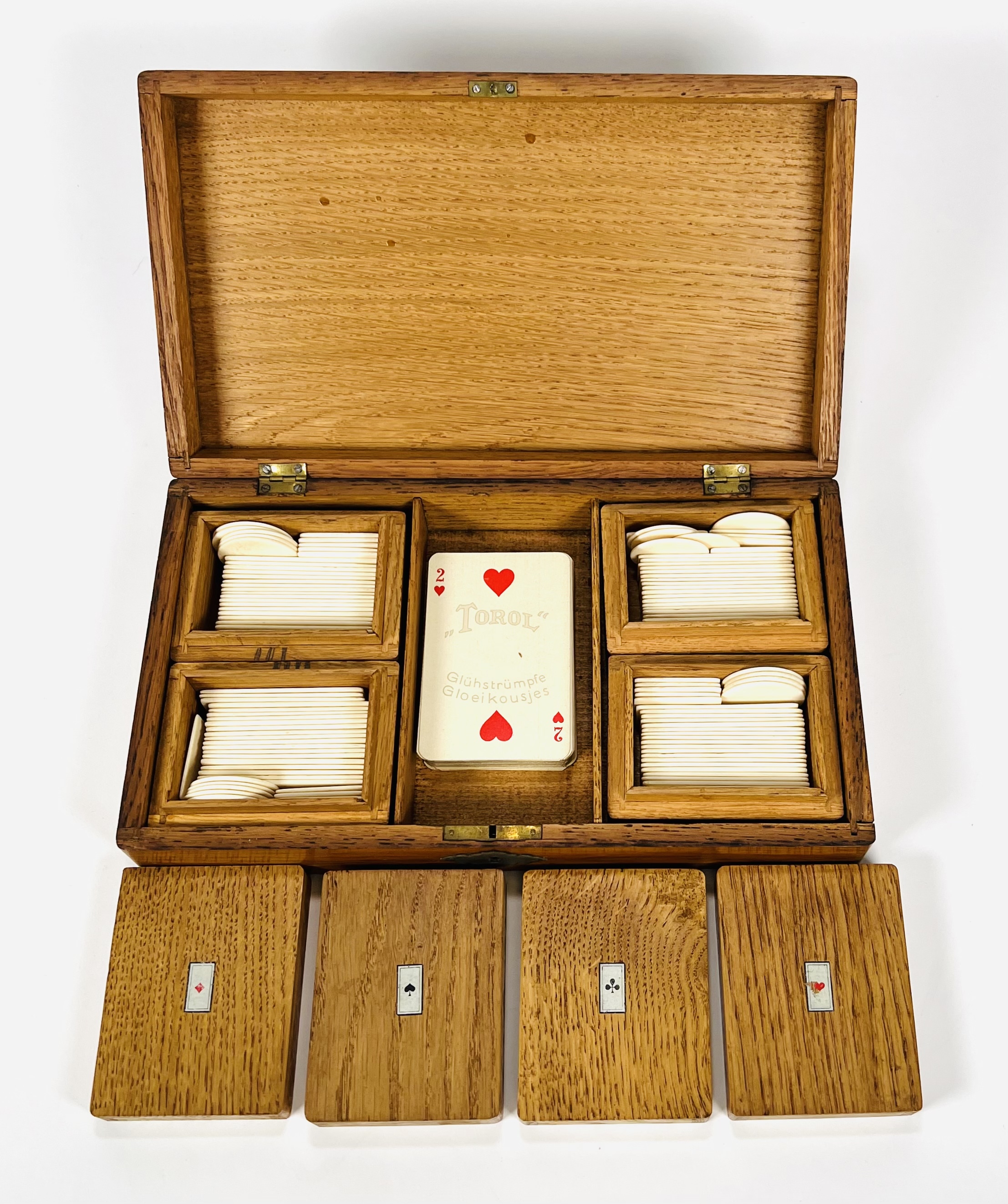 Houten kaartendoos met benen fiches met Torol kaarten, jaren 50. |