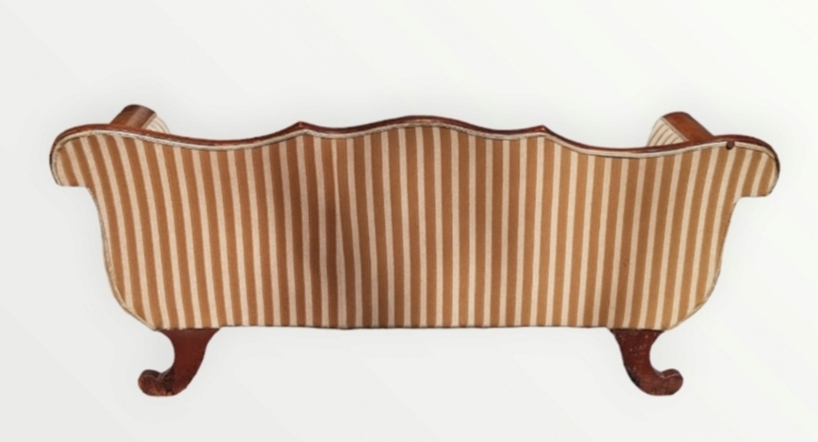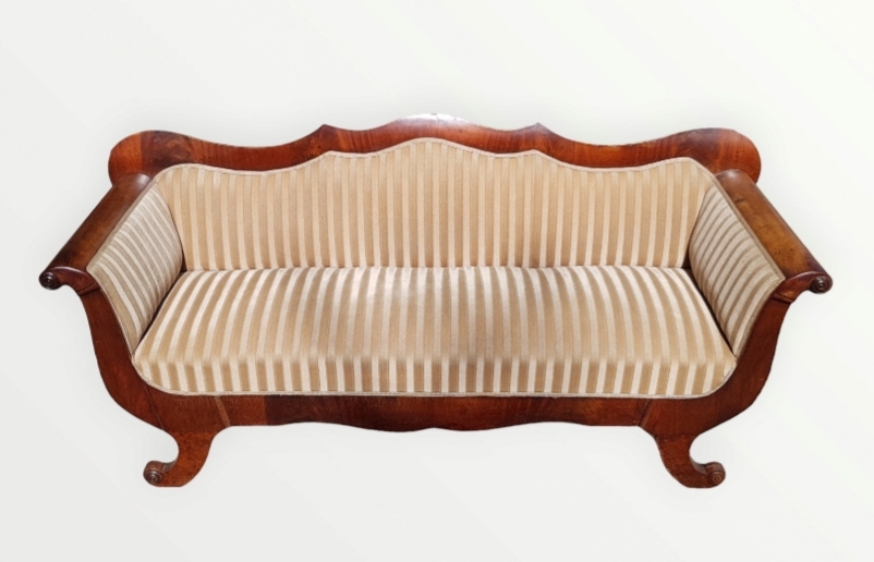 Biedermeier mahoniehouten bank met beige gestreepte velours bekleding, 19e eeuw. |