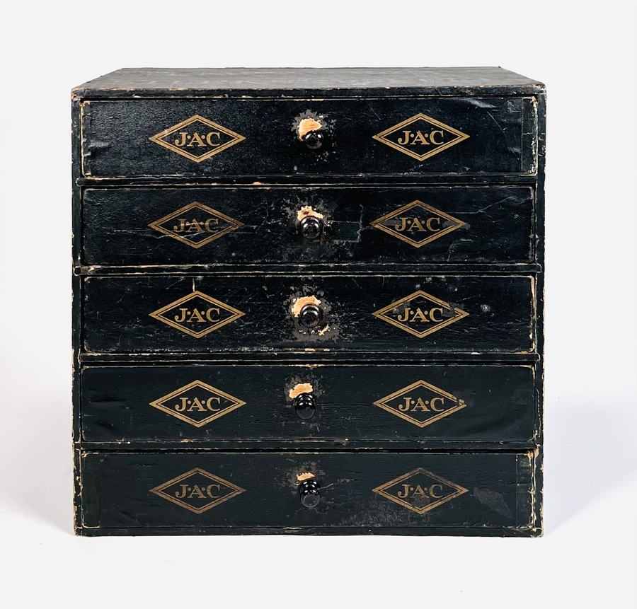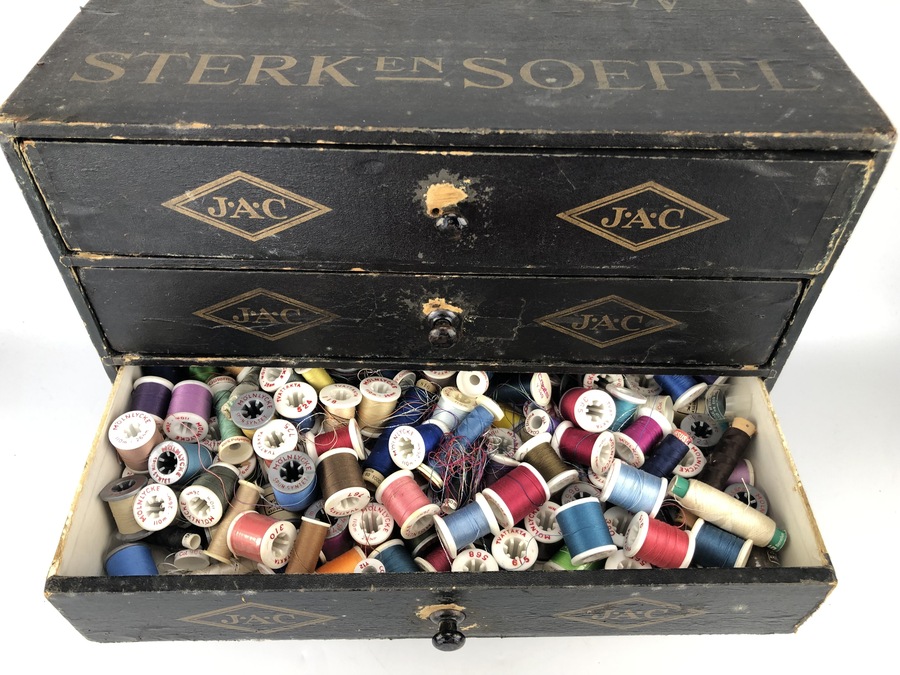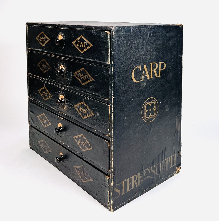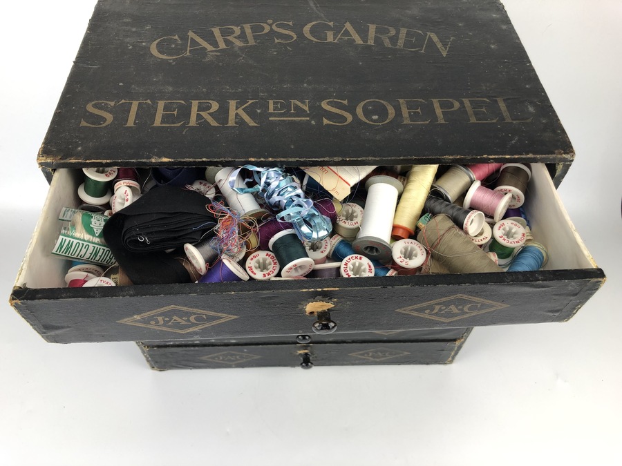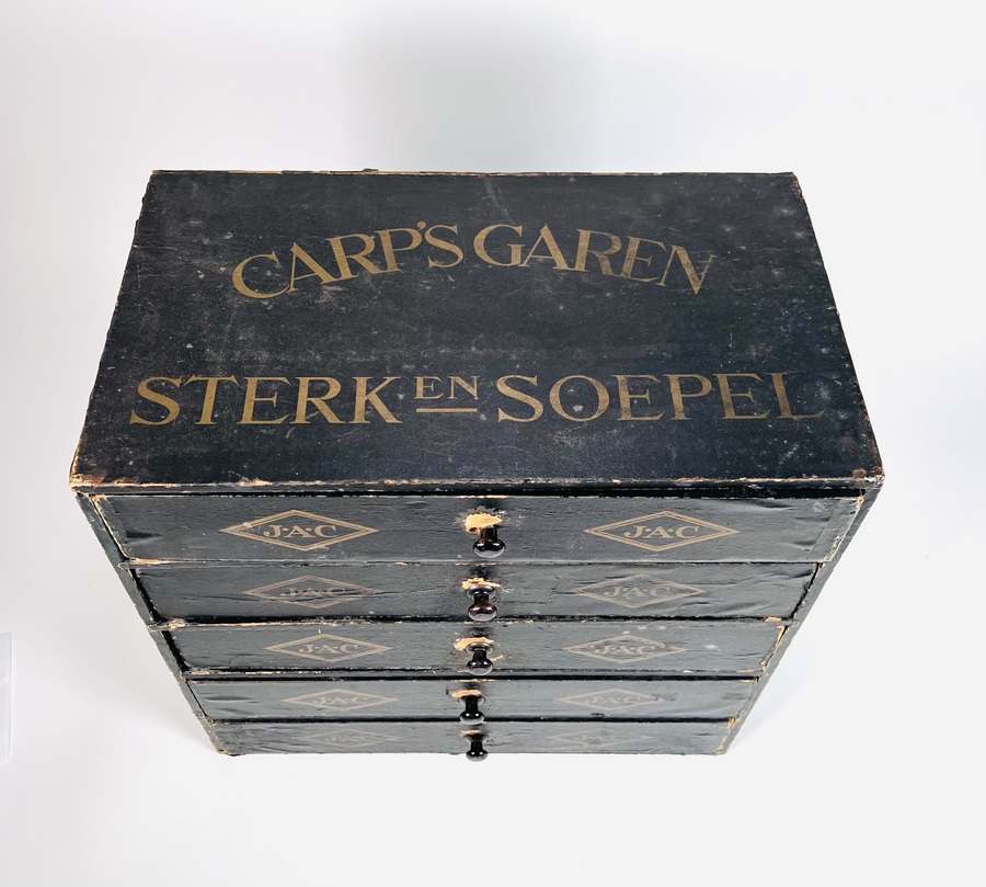 Carp's Garen winkel voorraadkastje met vijf laden met inhoud. Elke lade vermeld J.A.C. oftewel J.A. Carp, de eigenaar van de garenfabriek. Voorraadkastje stamt uit de jaren 30. |