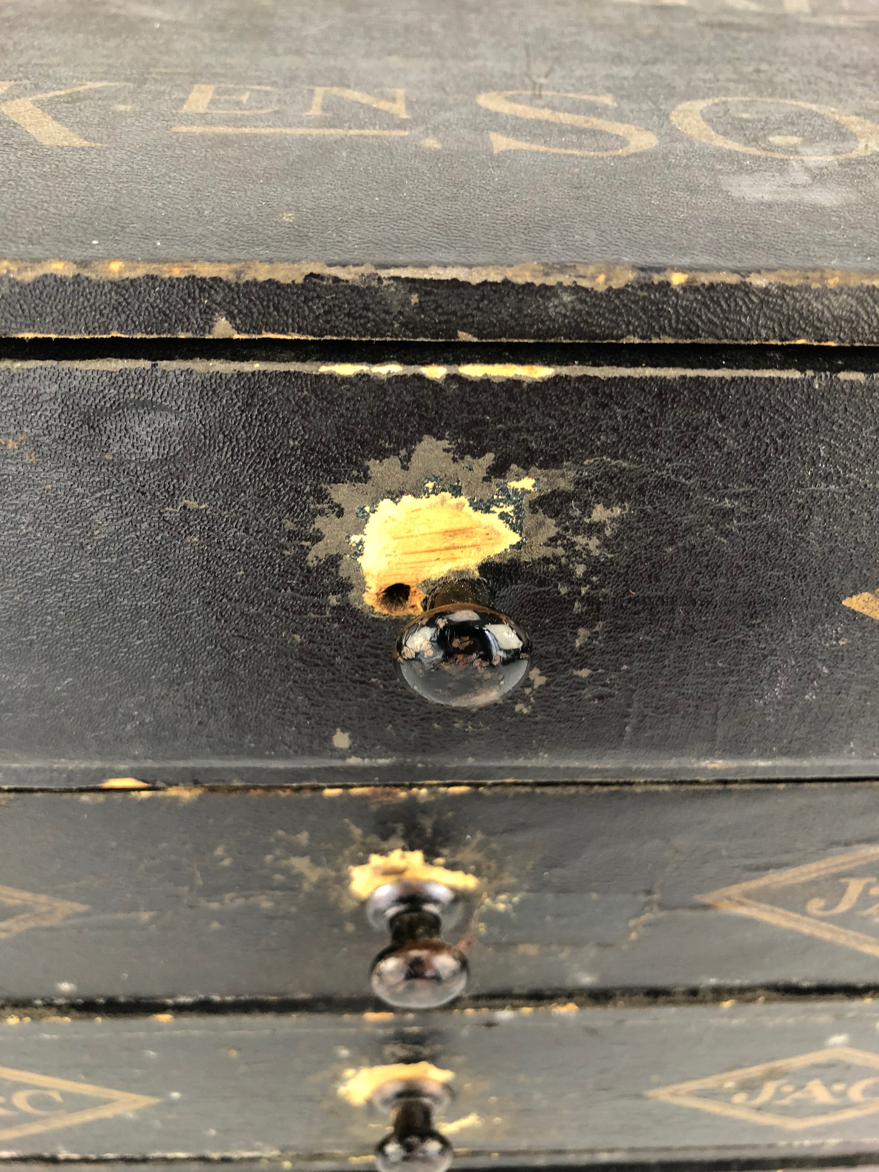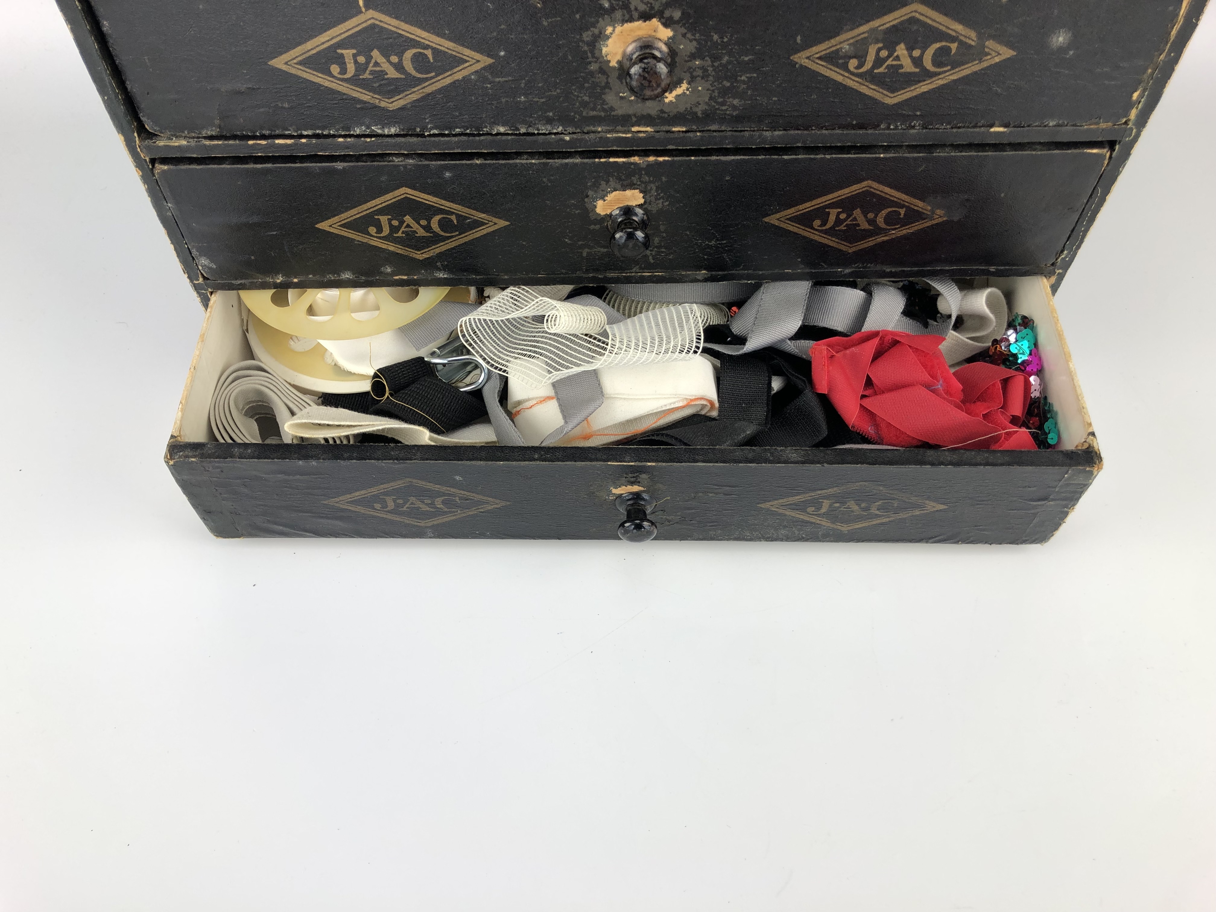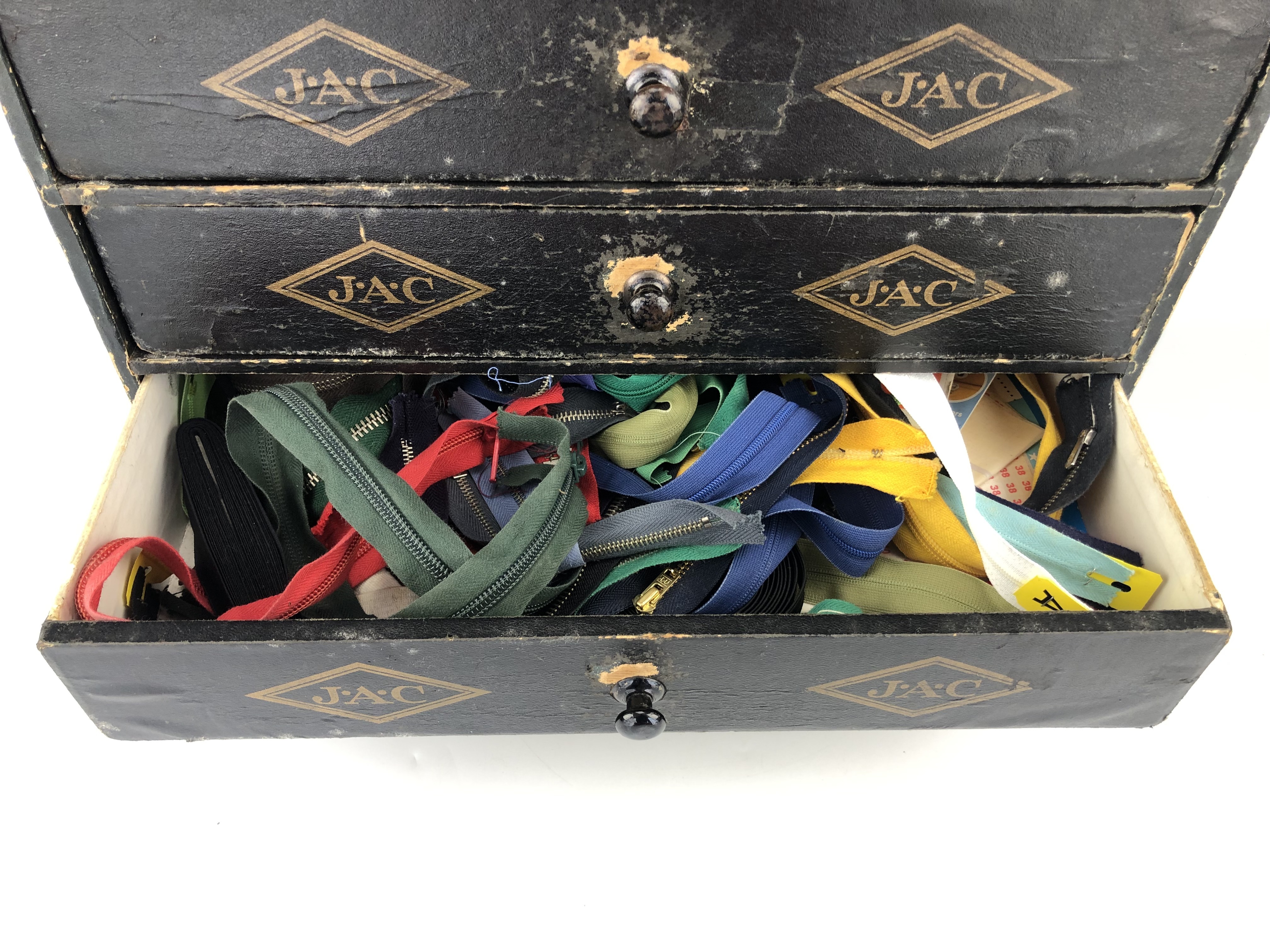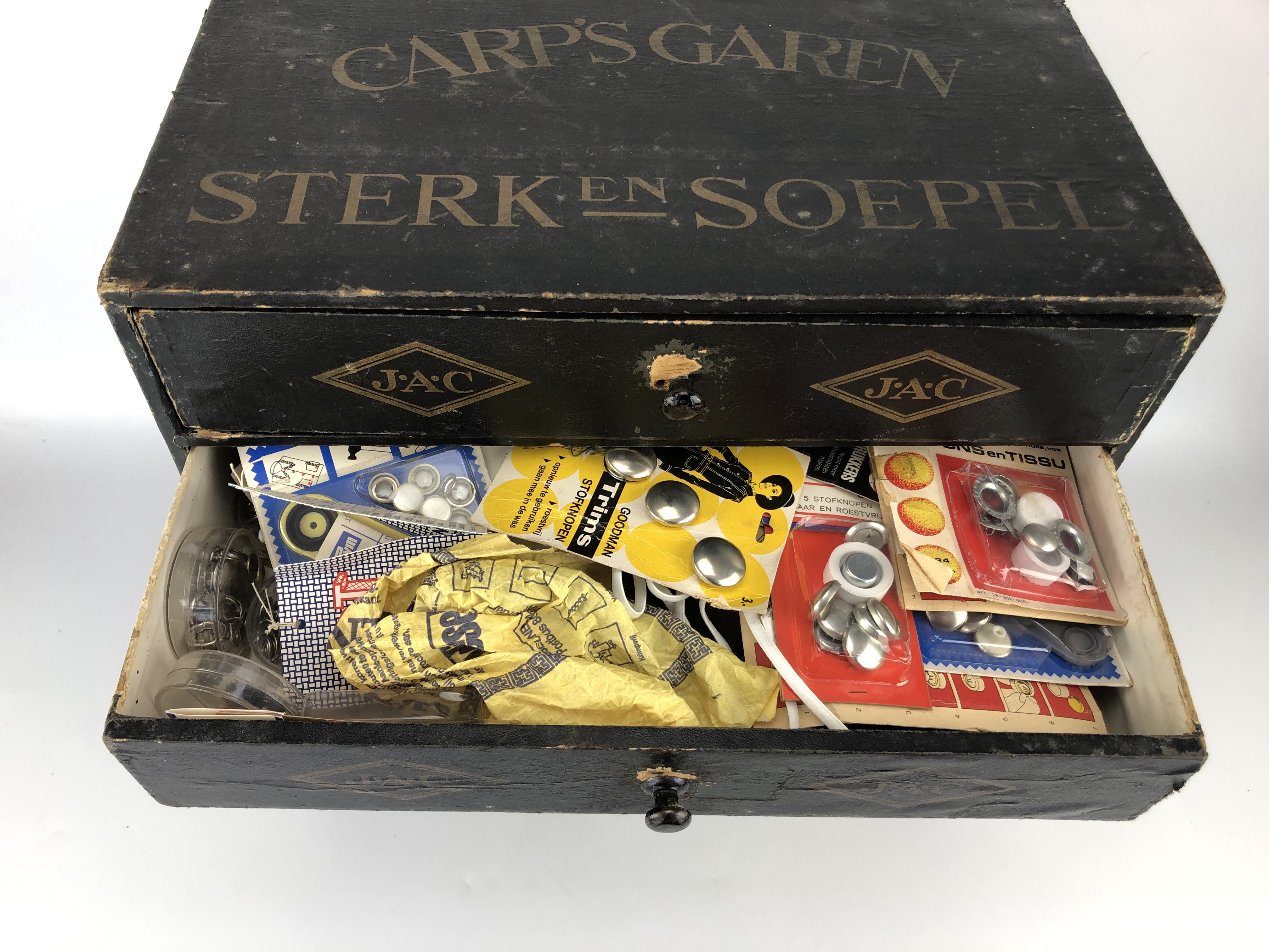 Carp's Garen winkel voorraadkastje met vijf laden met inhoud. Elke lade vermeld J.A.C. oftewel J.A. Carp, de eigenaar van de garenfabriek. Voorraadkastje stamt uit de jaren 30. |
