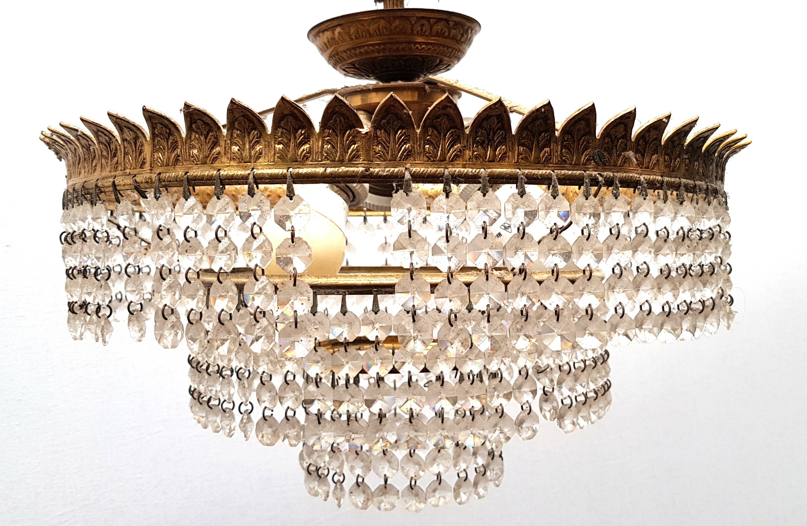 Franse kroonluchter met glazen octogonale glasstukken, voorzien van drie luchtpunten. Jaren 50/60. |