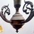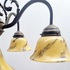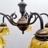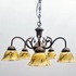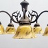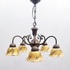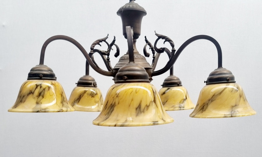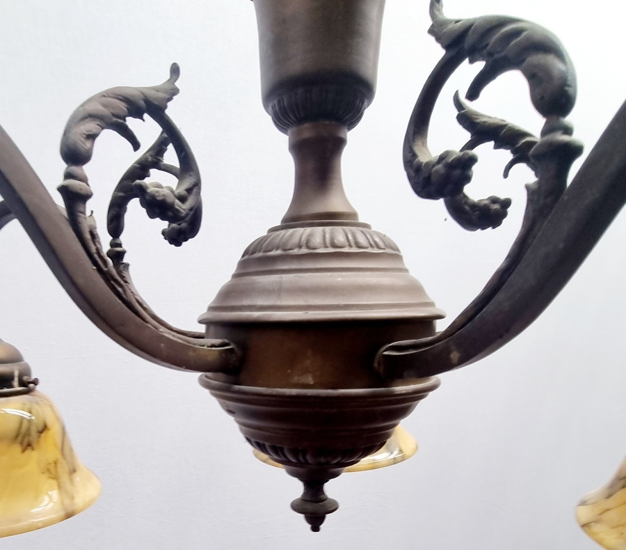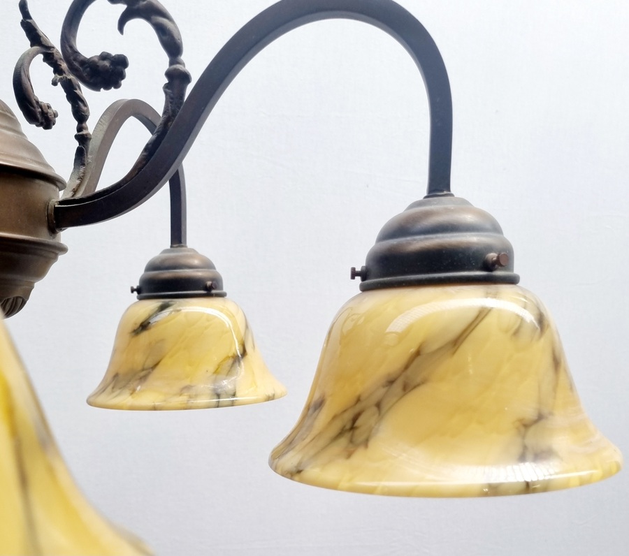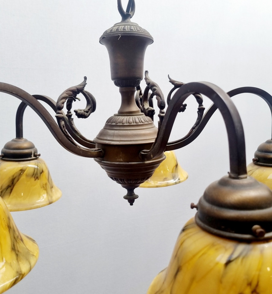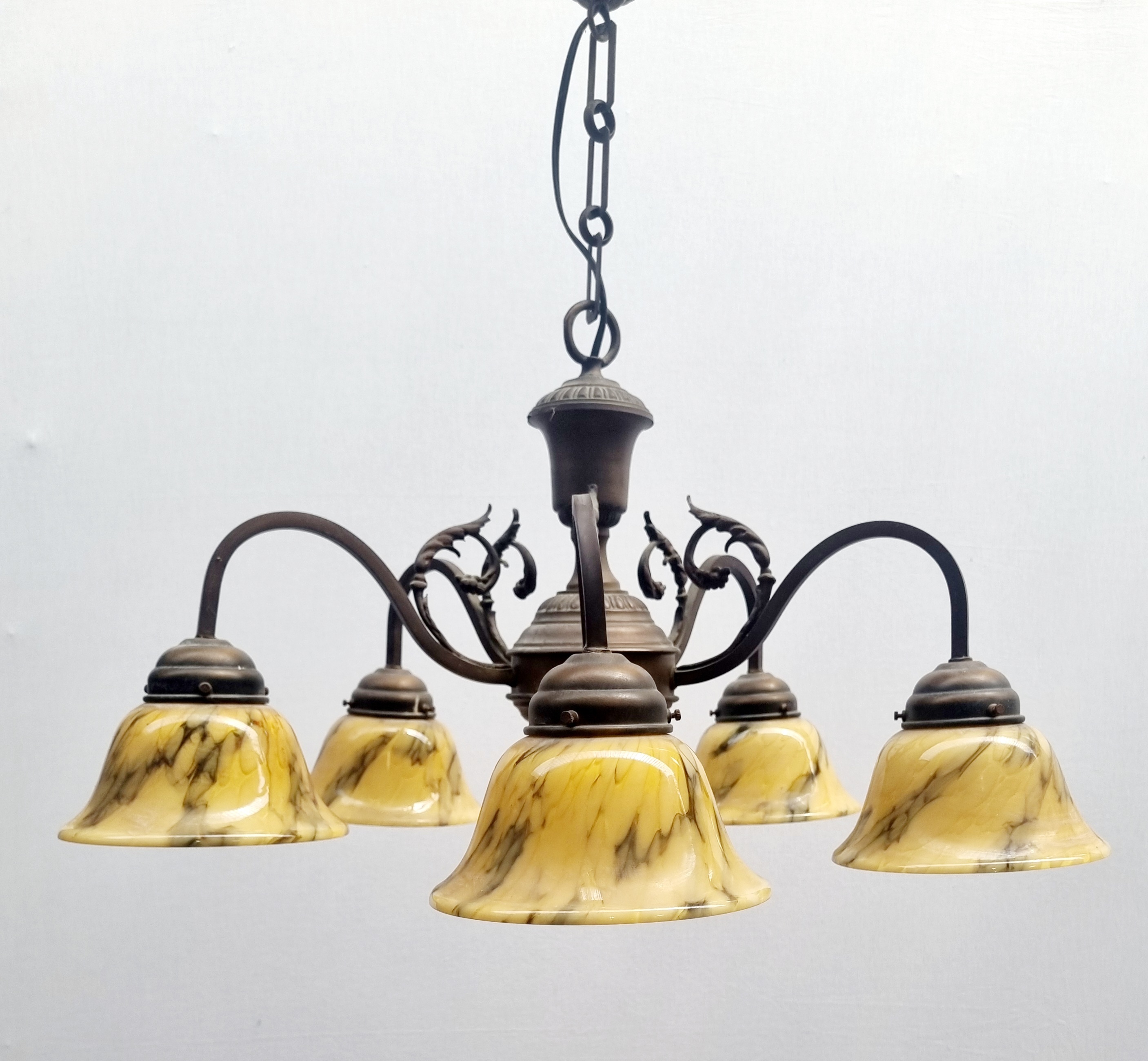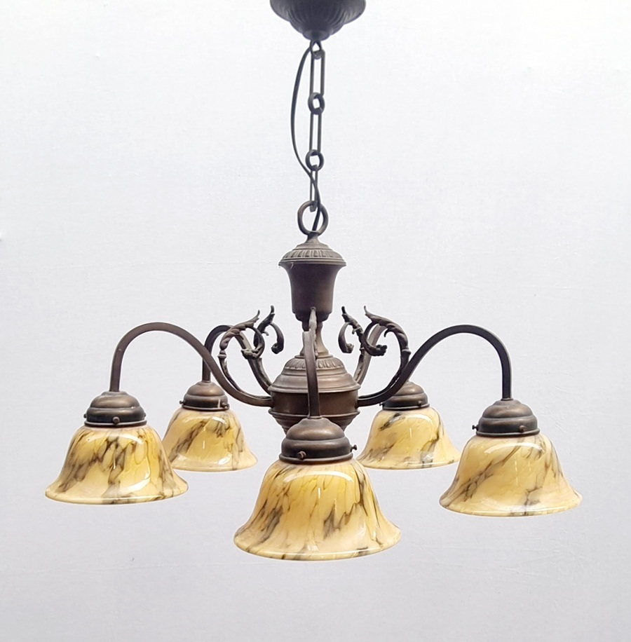 Bronskleurige hanglamp met vijf gemarmerde lampenkapjes en gedecoreerd met acanthusbladeren. Tweede kwart 20e eeuw. |