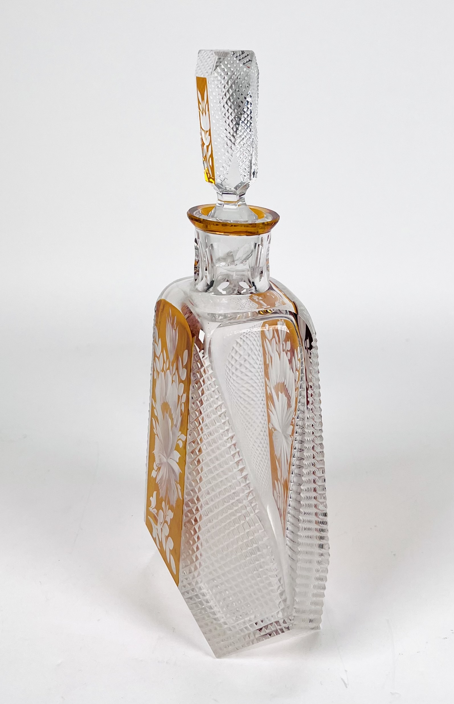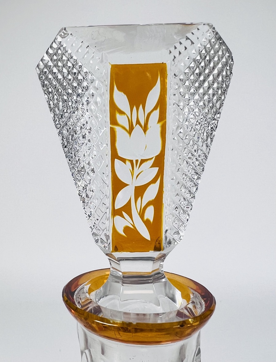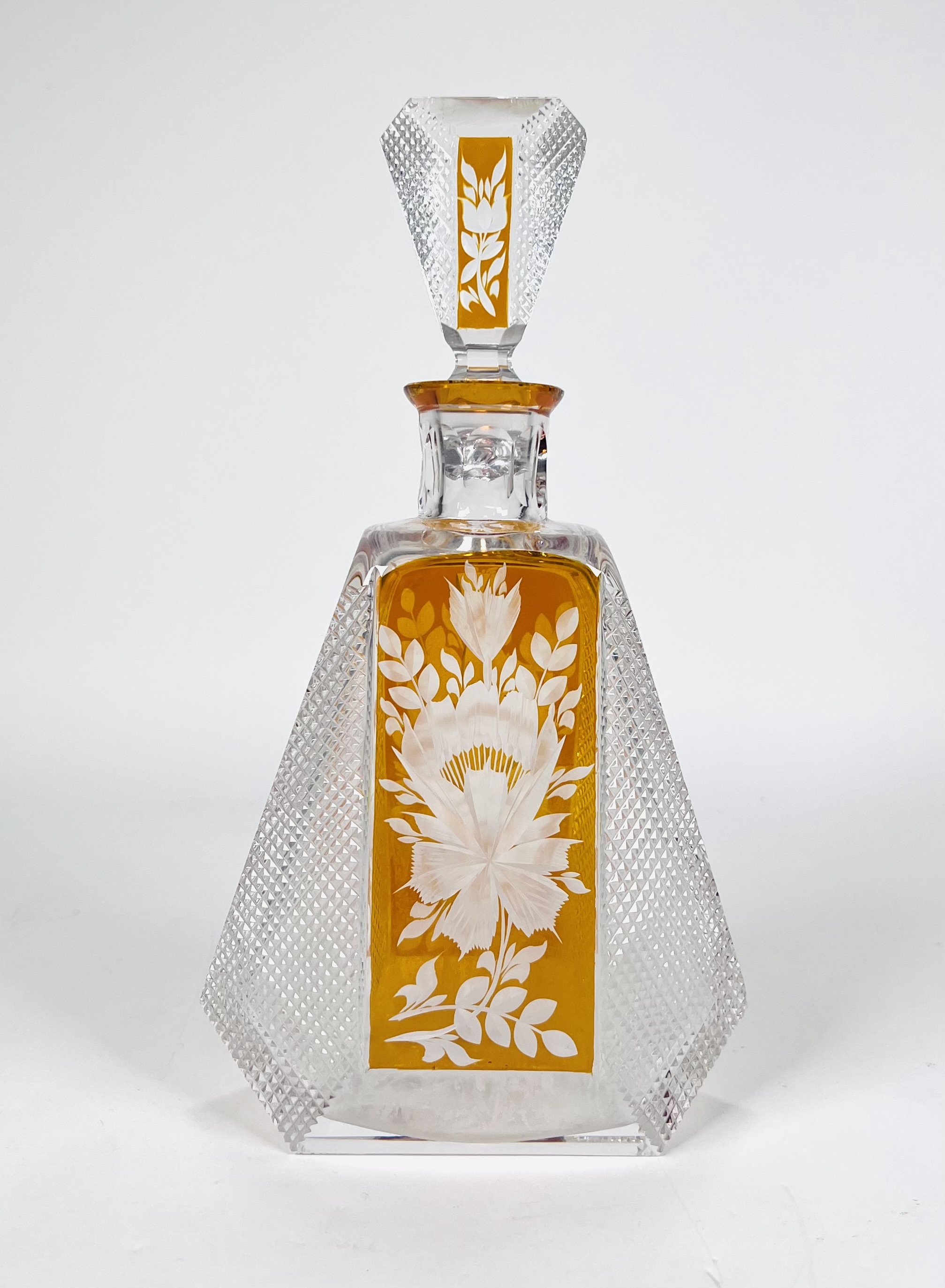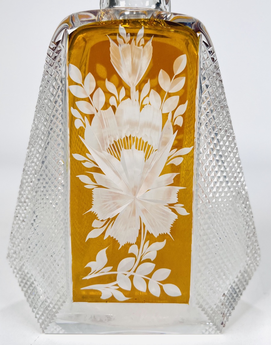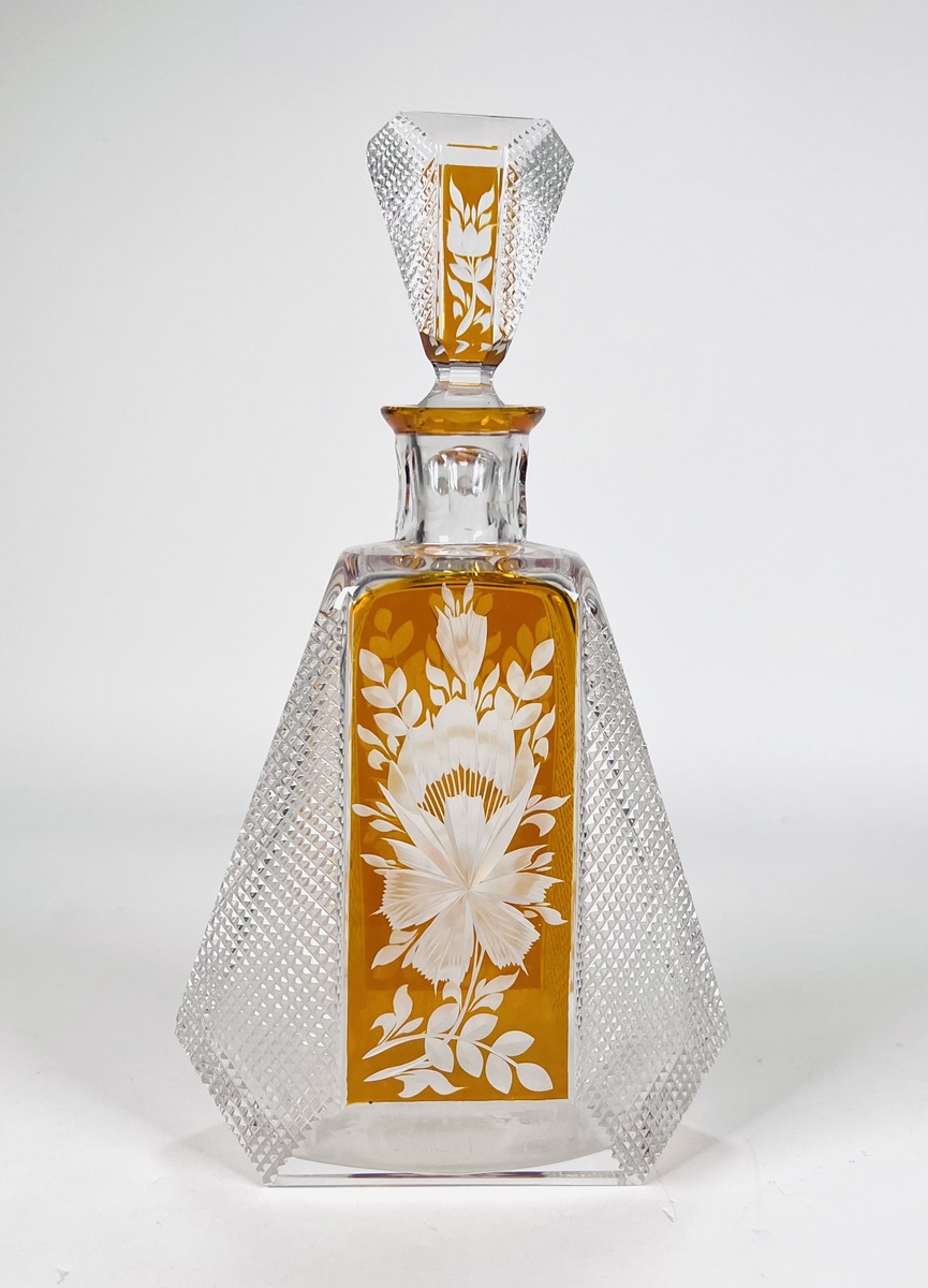 Boheems kristallen karaf in cognackleur met geslepen floraal decor. Tsjechië, jaren 60/70. |