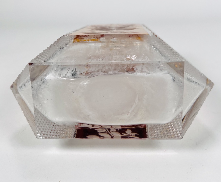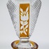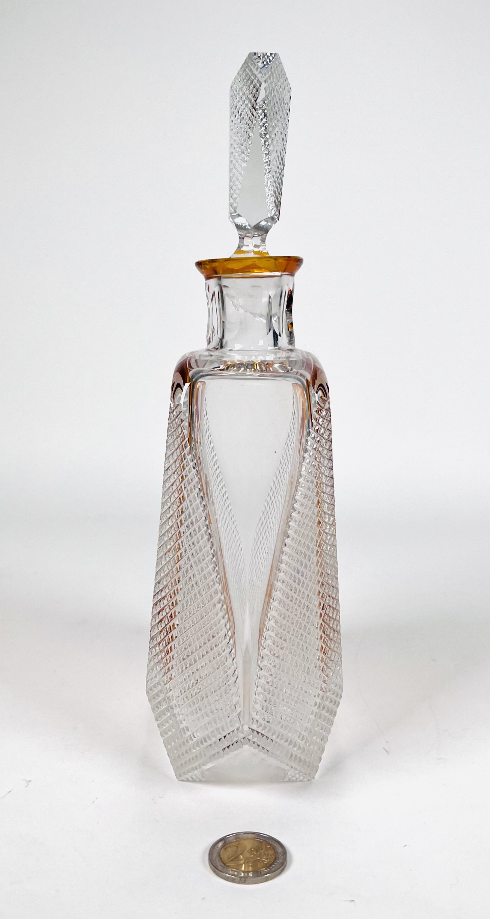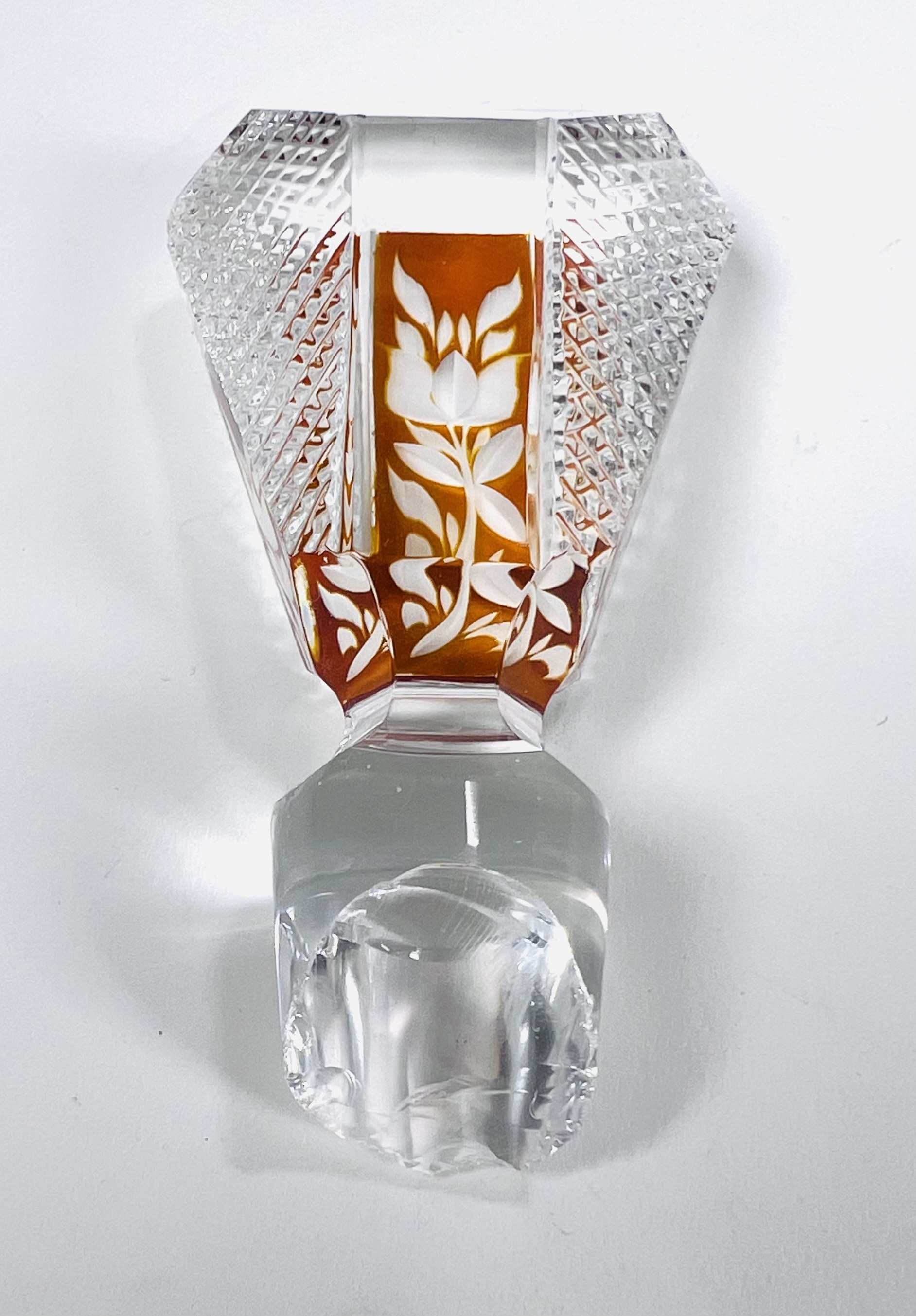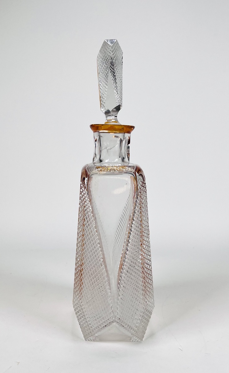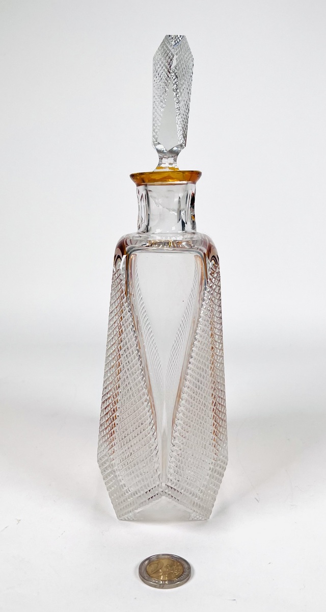Boheems kristallen karaf in cognackleur met geslepen floraal decor. Tsjechië, jaren 60/70. |