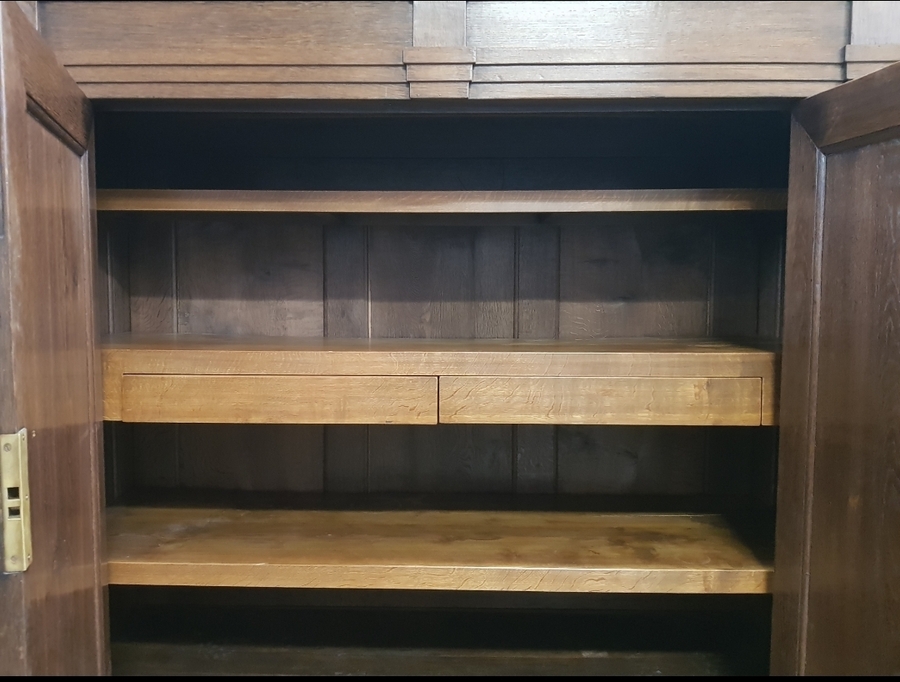 Eikenhouten notariskast met pilaren voorzien van meander motief opleg, het geheel op bolpoten. 20e eeuw. |