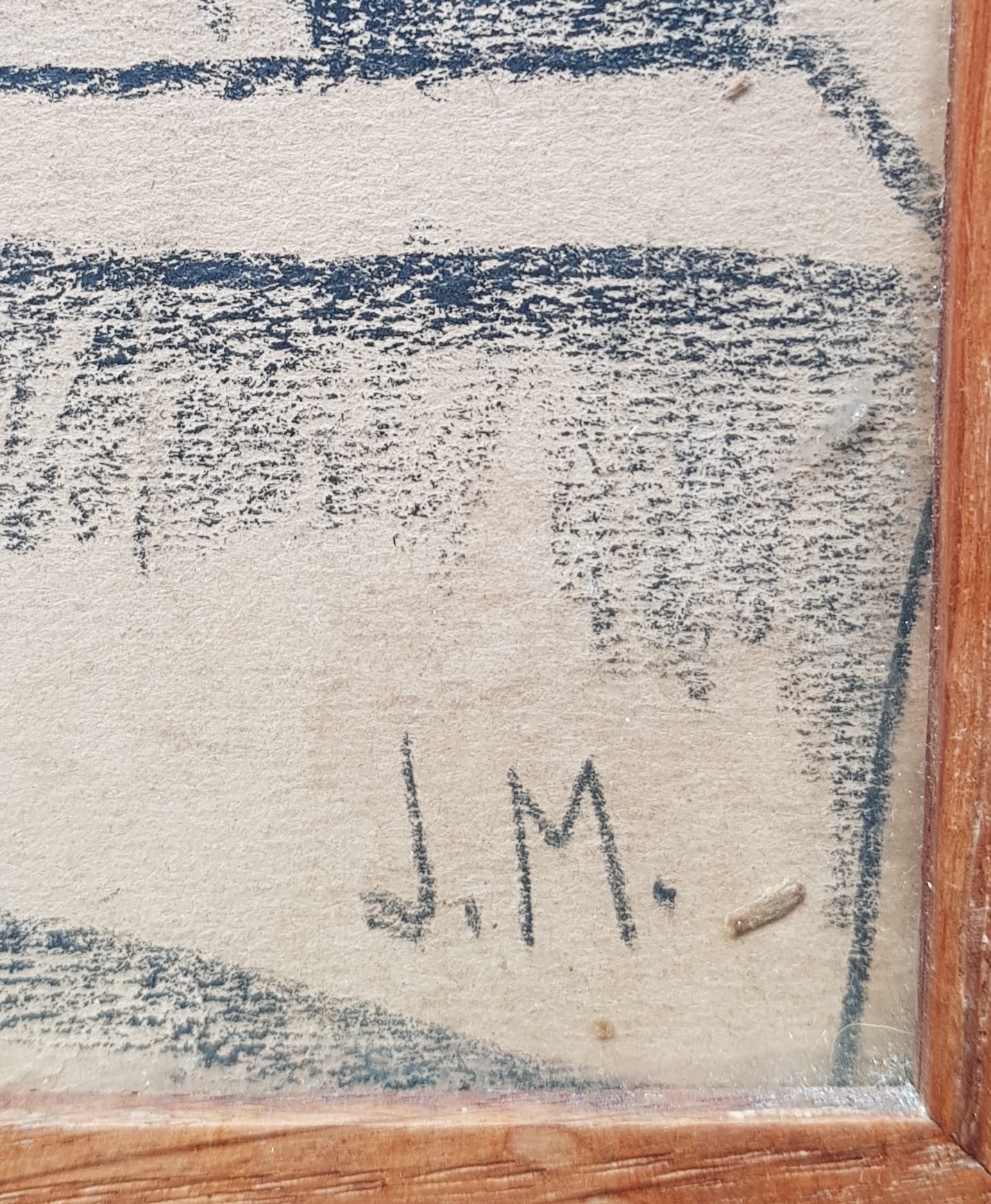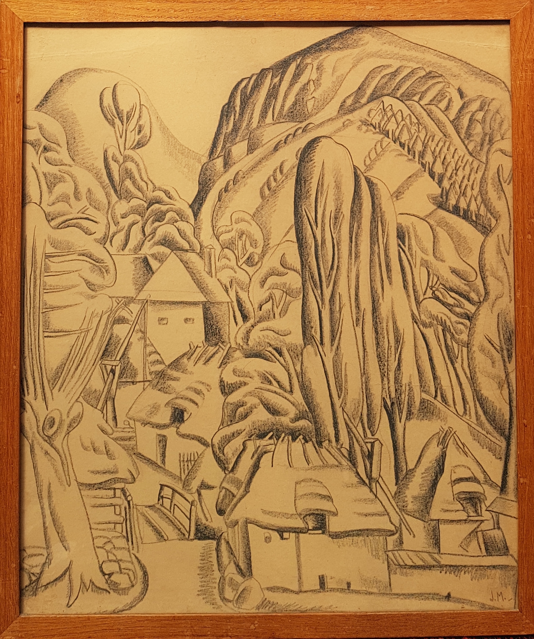 Krijttekening van een berglandschap met dorp. Rechtsonder gemonogrammeerd met J.M, midden 20e eeuw. |