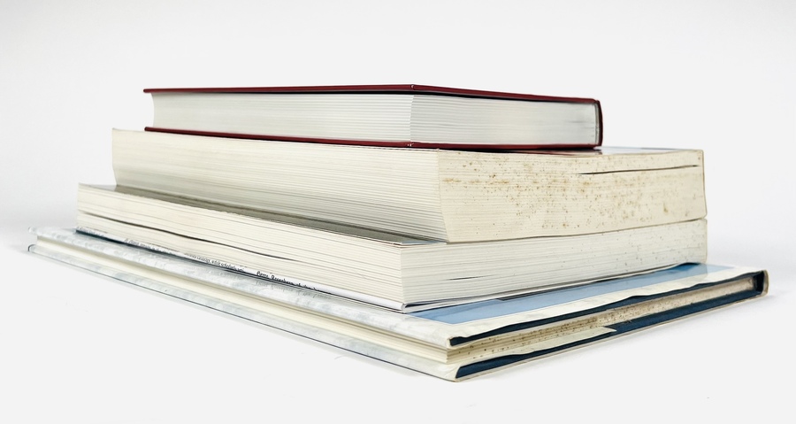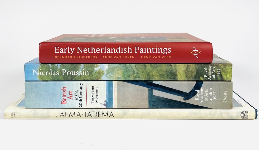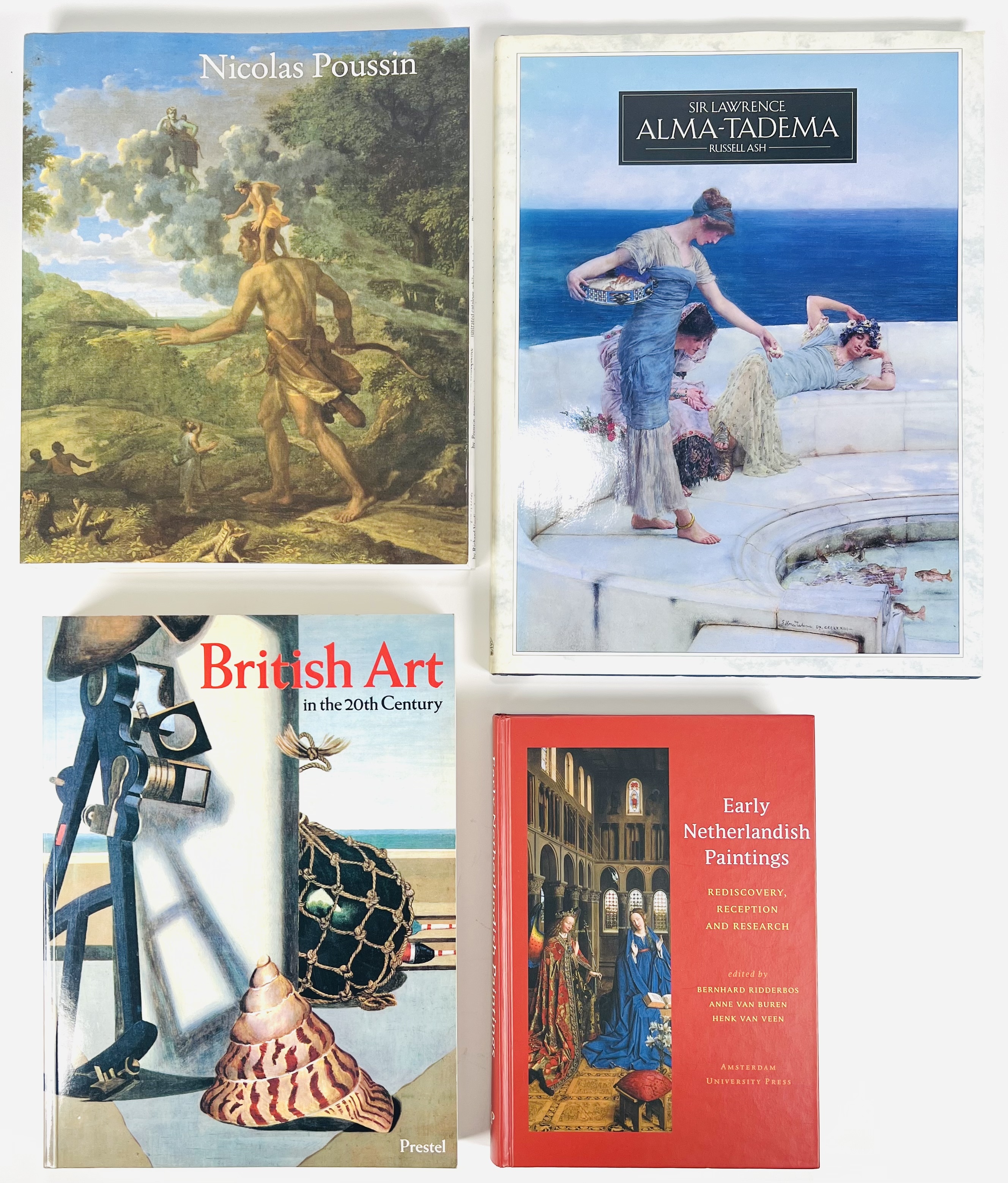 Vier Engelstalige kunstboeken betreffende de kunstschilders Nicolas Poussin en Sir Lawrence Alma Tadema (hardcover) en twee algemene Engelstalige kunstboeken betreffende British Art in the 20th Century en Early Dutch Paintings (hardcover). Kunstboeken uit de derde kwart 20e eeuw. |