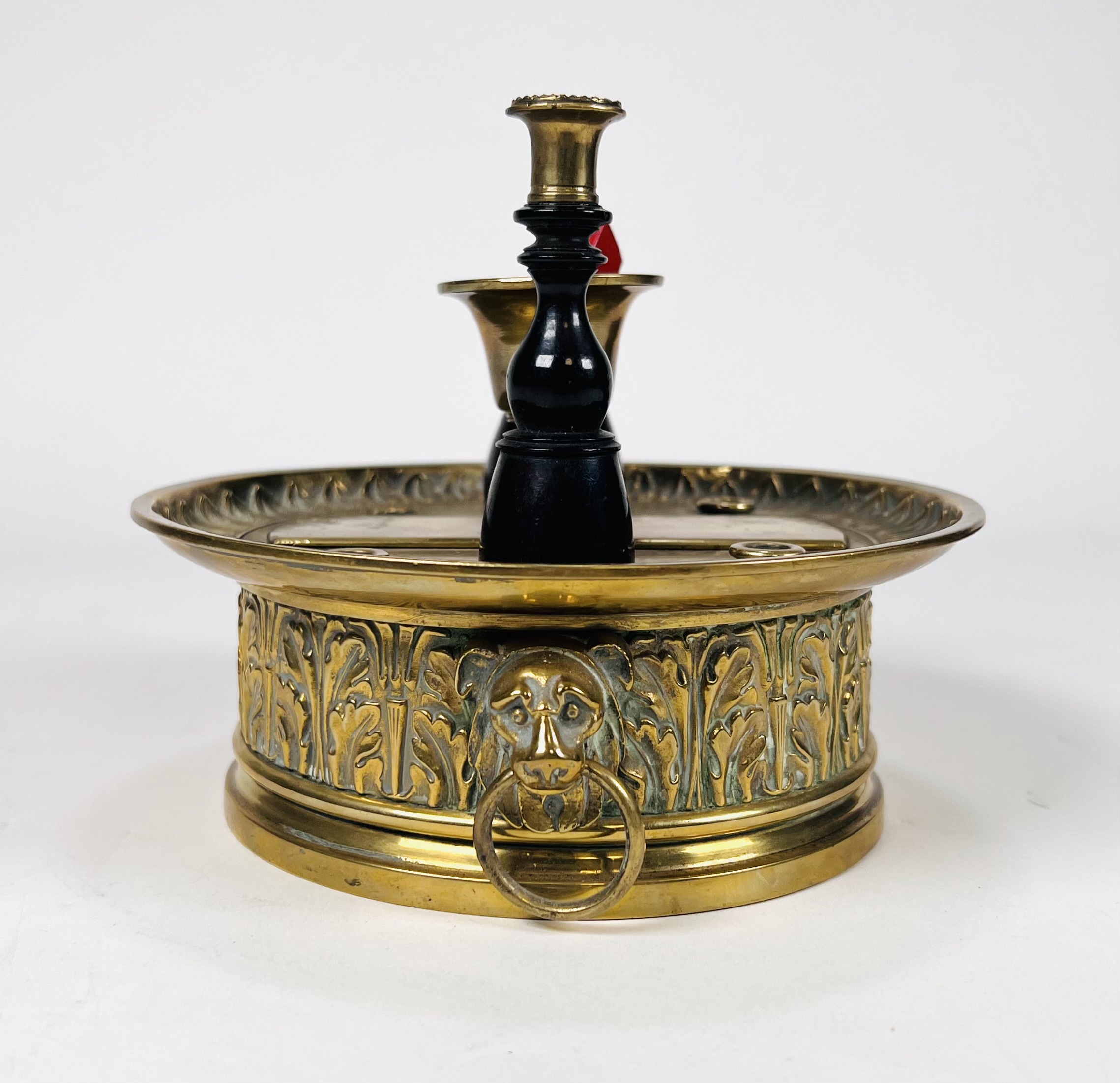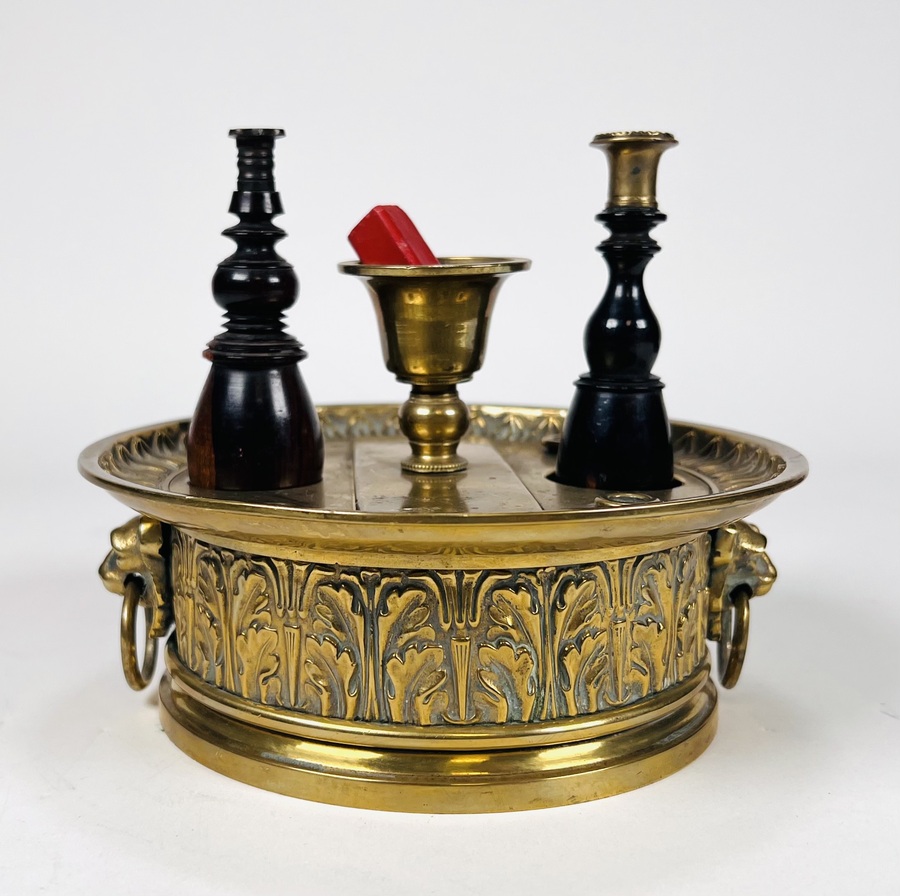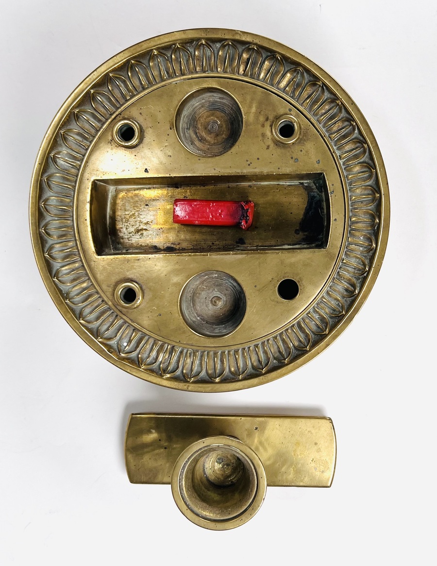 Messing lakstempelhouder voorzien van acanthusbladeren decoratie met afneembare kaarsenstandaard, inclusief twee lakstempels en rode lakstift. Daarbij een wandbord met verschillende lakstempels. 20e eeuw. |