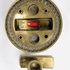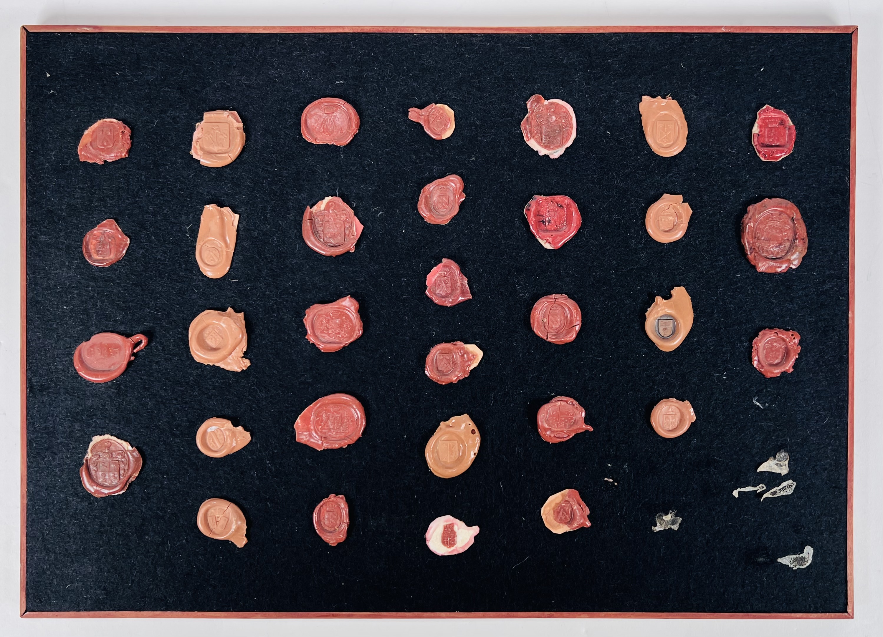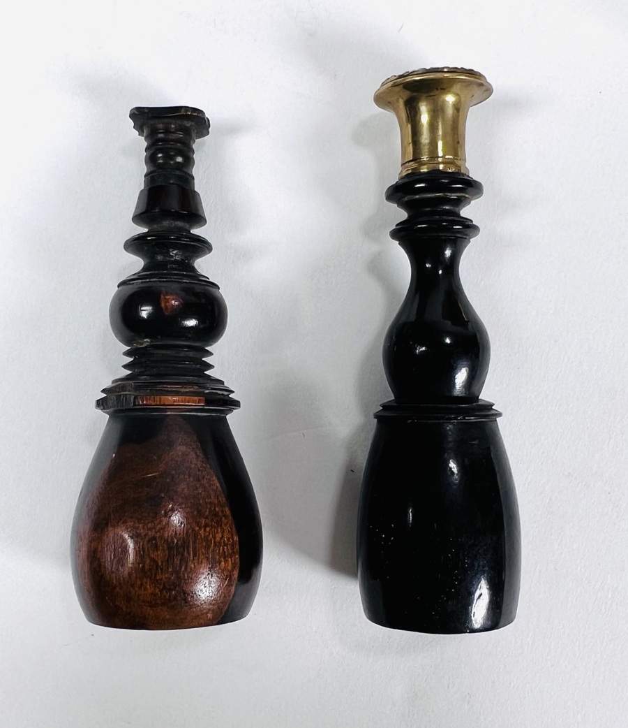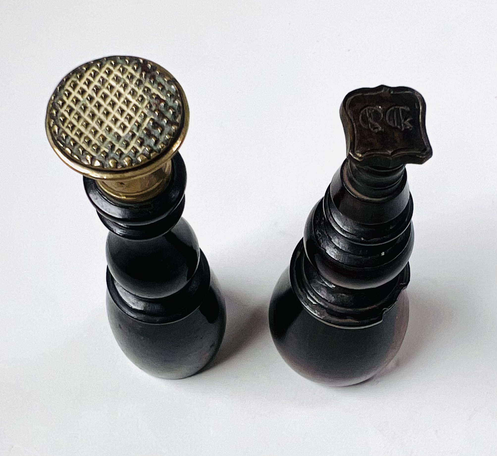 Messing lakstempelhouder voorzien van acanthusbladeren decoratie met afneembare kaarsenstandaard, inclusief twee lakstempels en rode lakstift. Daarbij een wandbord met verschillende lakstempels. 20e eeuw. |