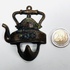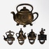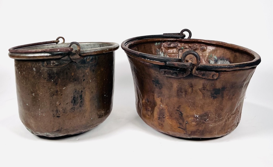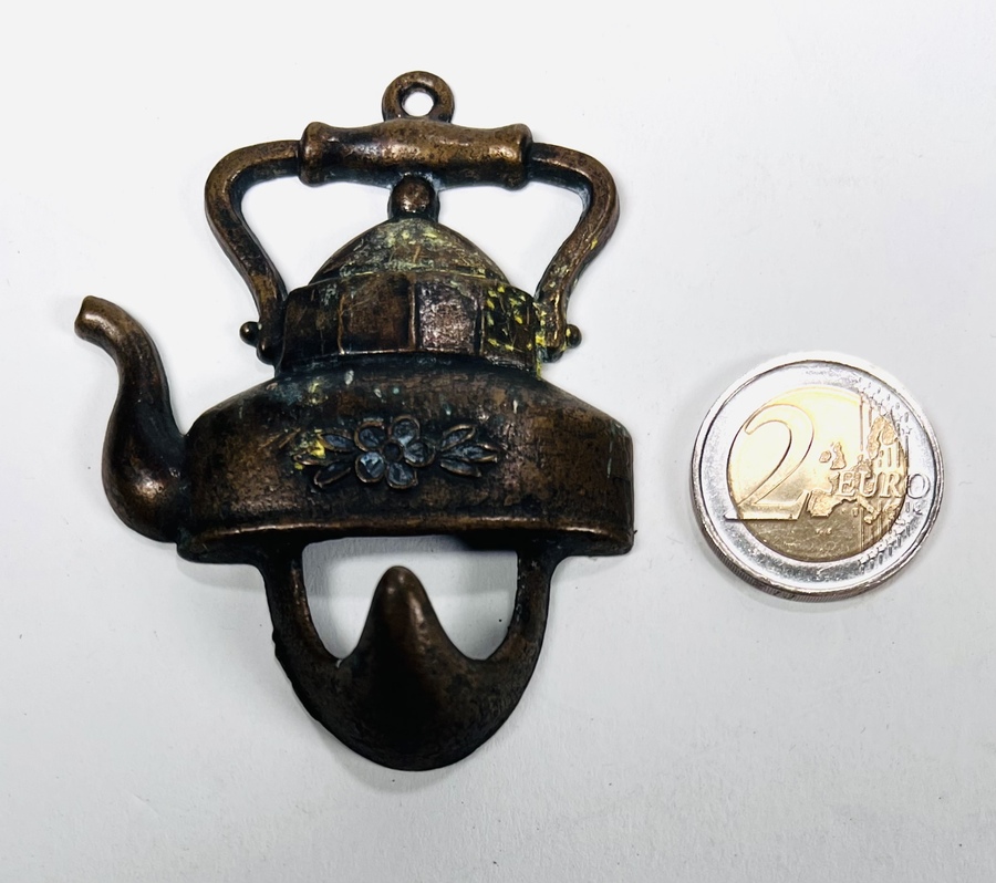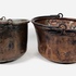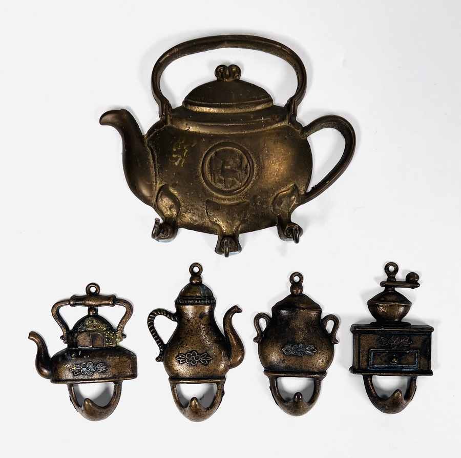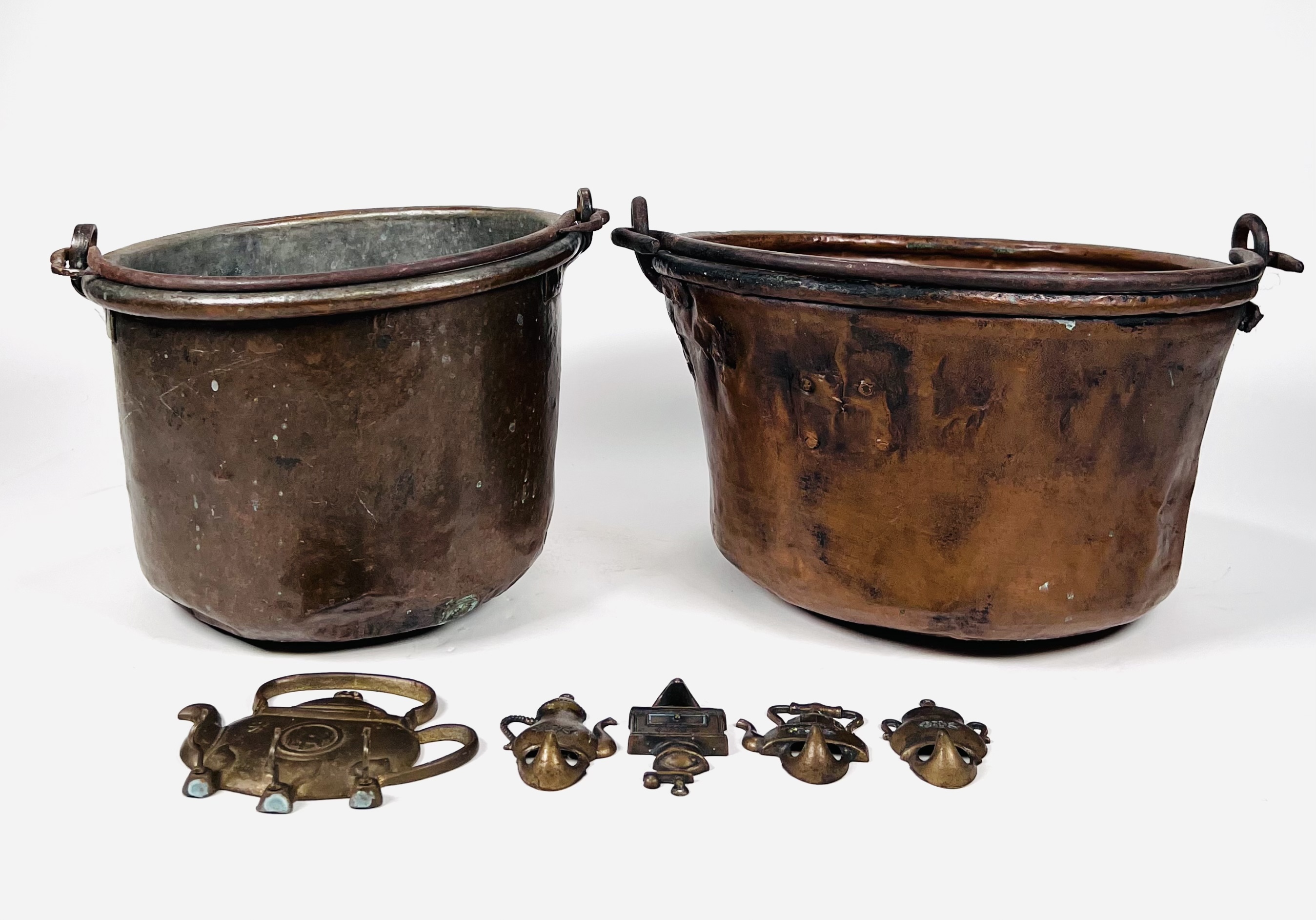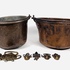 Twee antieke koperen akers met hengsel en een set van vijf keukenhaakjes in de vorm van een koffiemolen, fluitketel en theepot. 20e eeuw. |