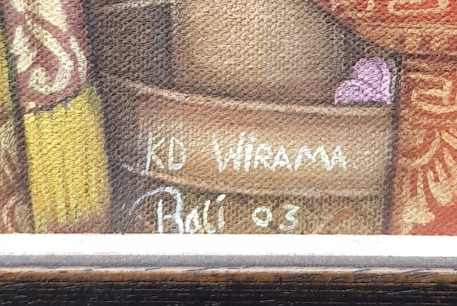 Schilderij van een Balinese danseres van K.D. Wirama. Olieverfschilderij op linnen, rechtsonder gesigneerd en gedateerd Bali 2003. |