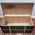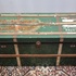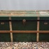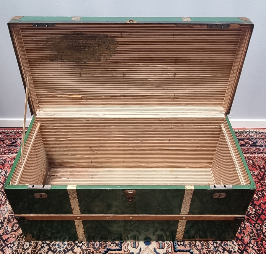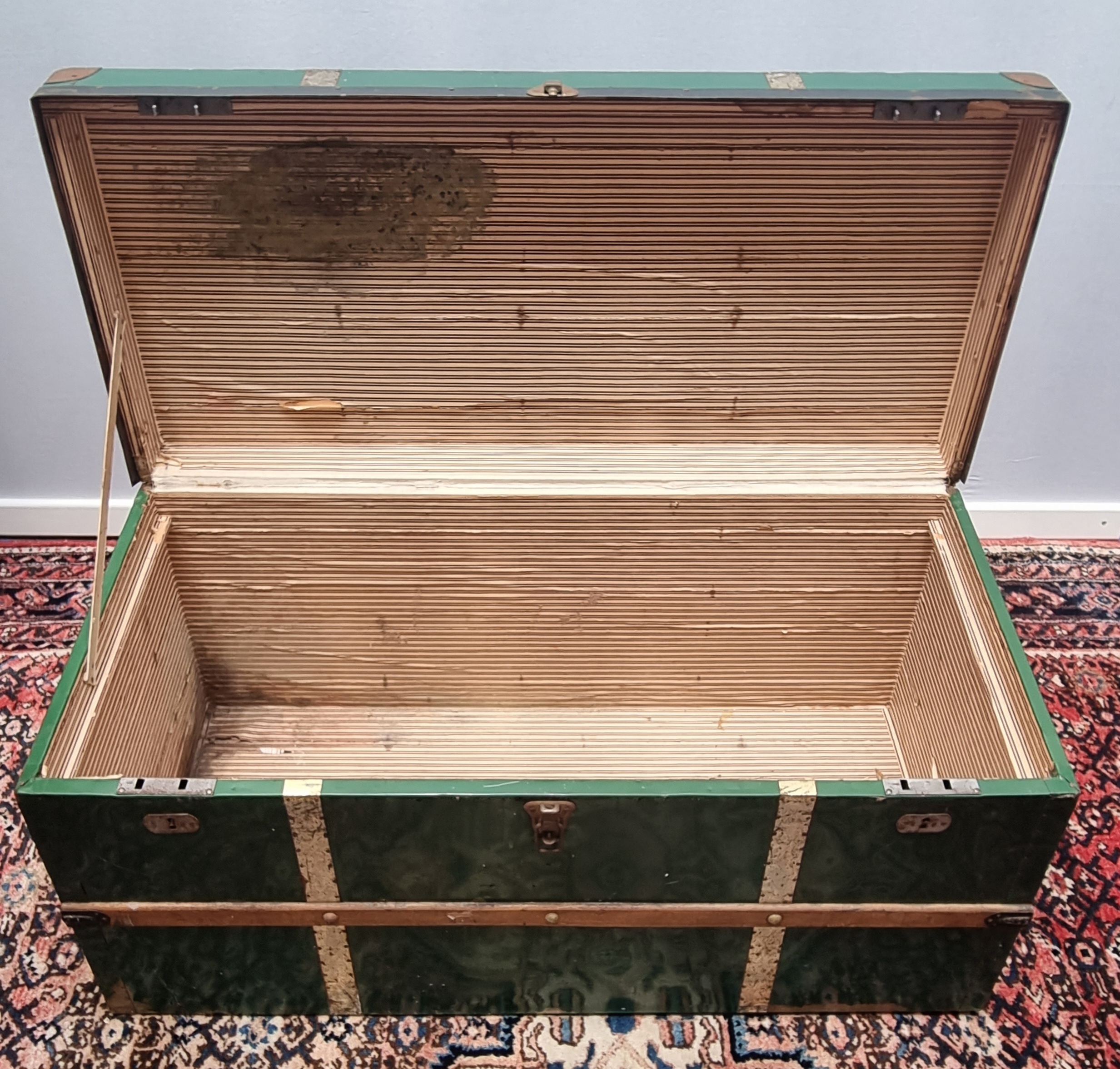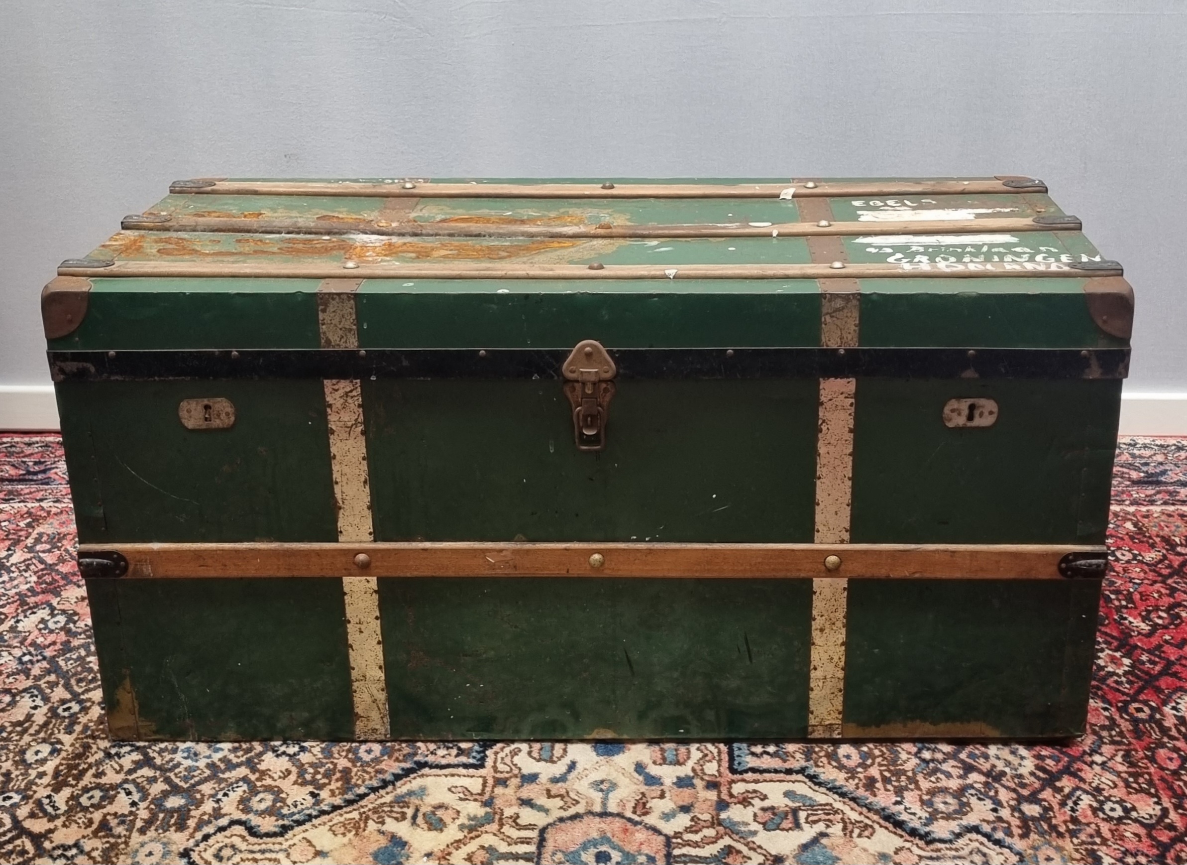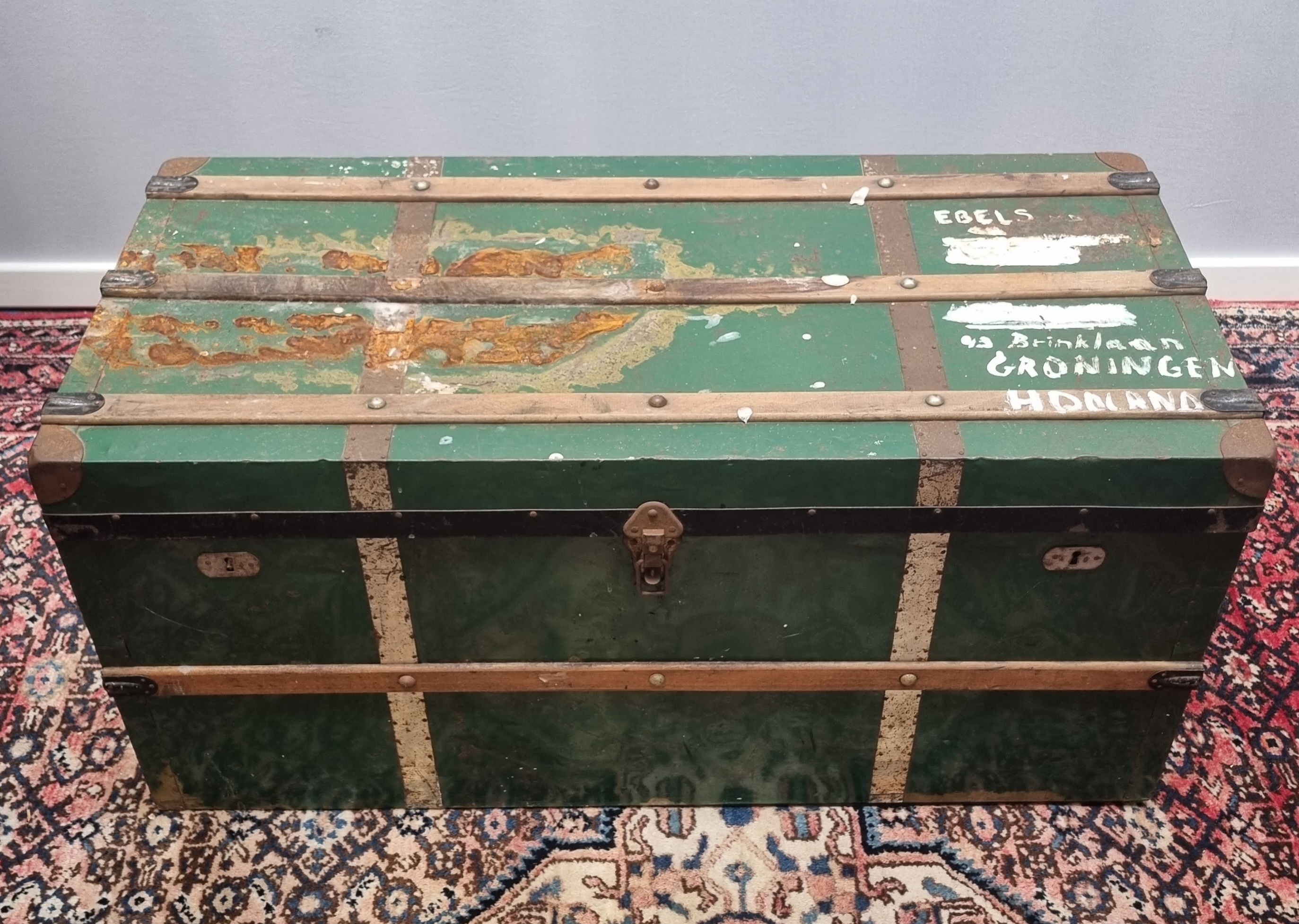 Groene metalen hutkoffer met houten spanbanden en messingkleurig beslag. Midden 20e eeuw. |