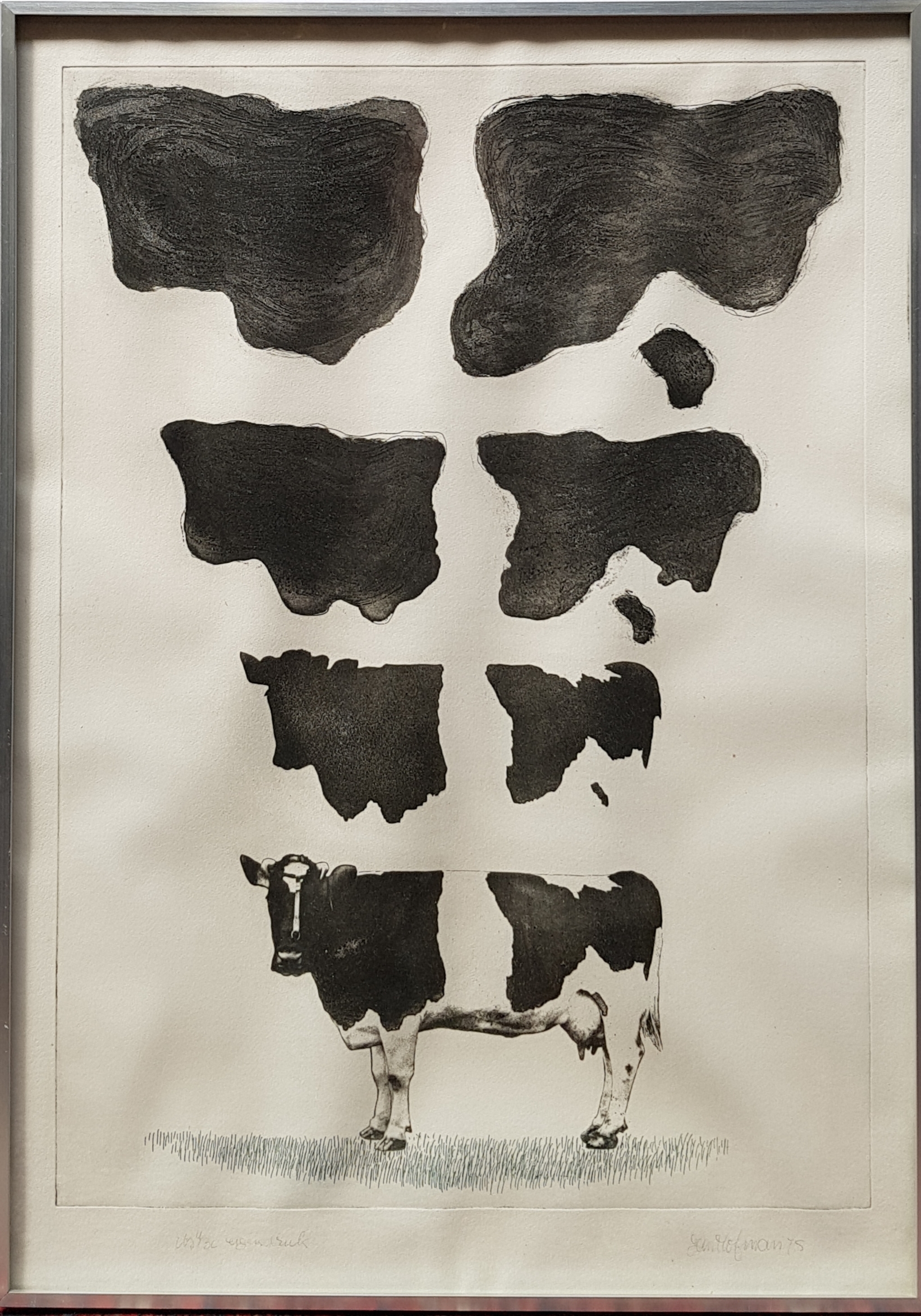 Zeefdruk met Friese zwartbonte koe door Jan Hofman (Groningen, 1942). Rechtsonder gesigneerd en gedateerd 1975, betreft een eigen druk. |