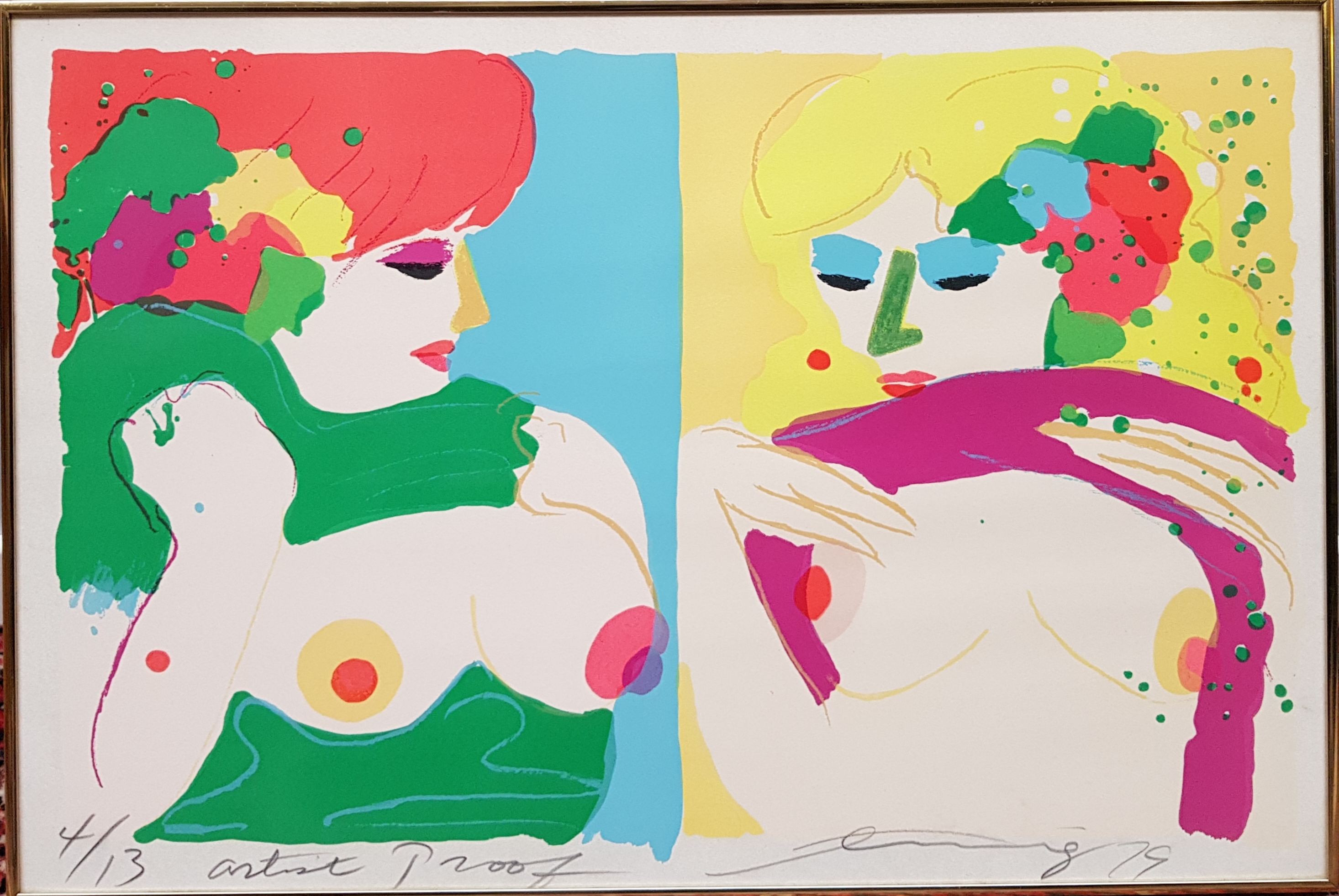 Zeefdruk van twee ontblote dames door Walasse Ting (1929-2010). Rechtsonder gesigneerd, gedateerd 1979 en vermelding oplagenummer 4/13 en Artist Proof. |