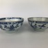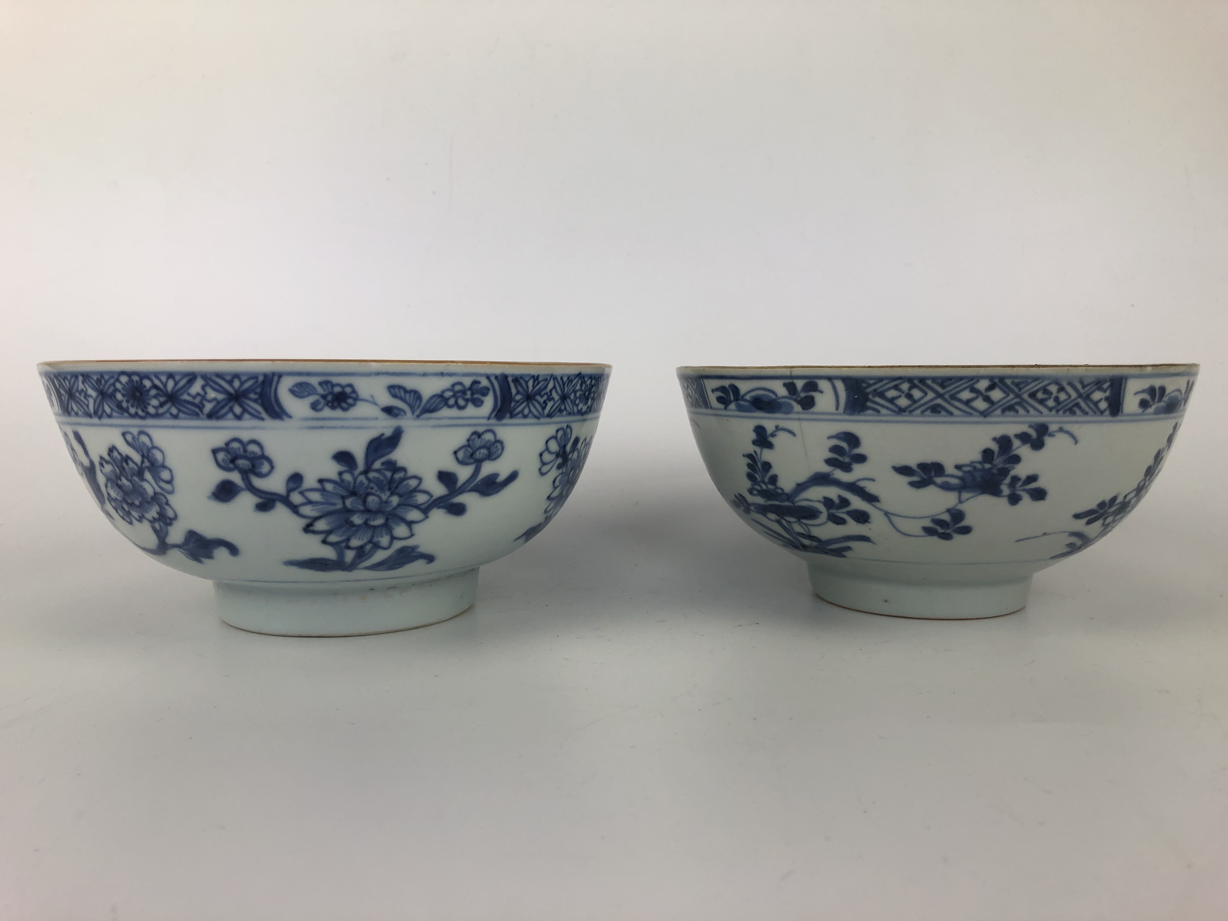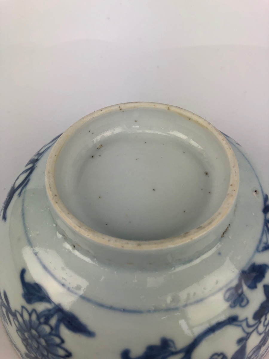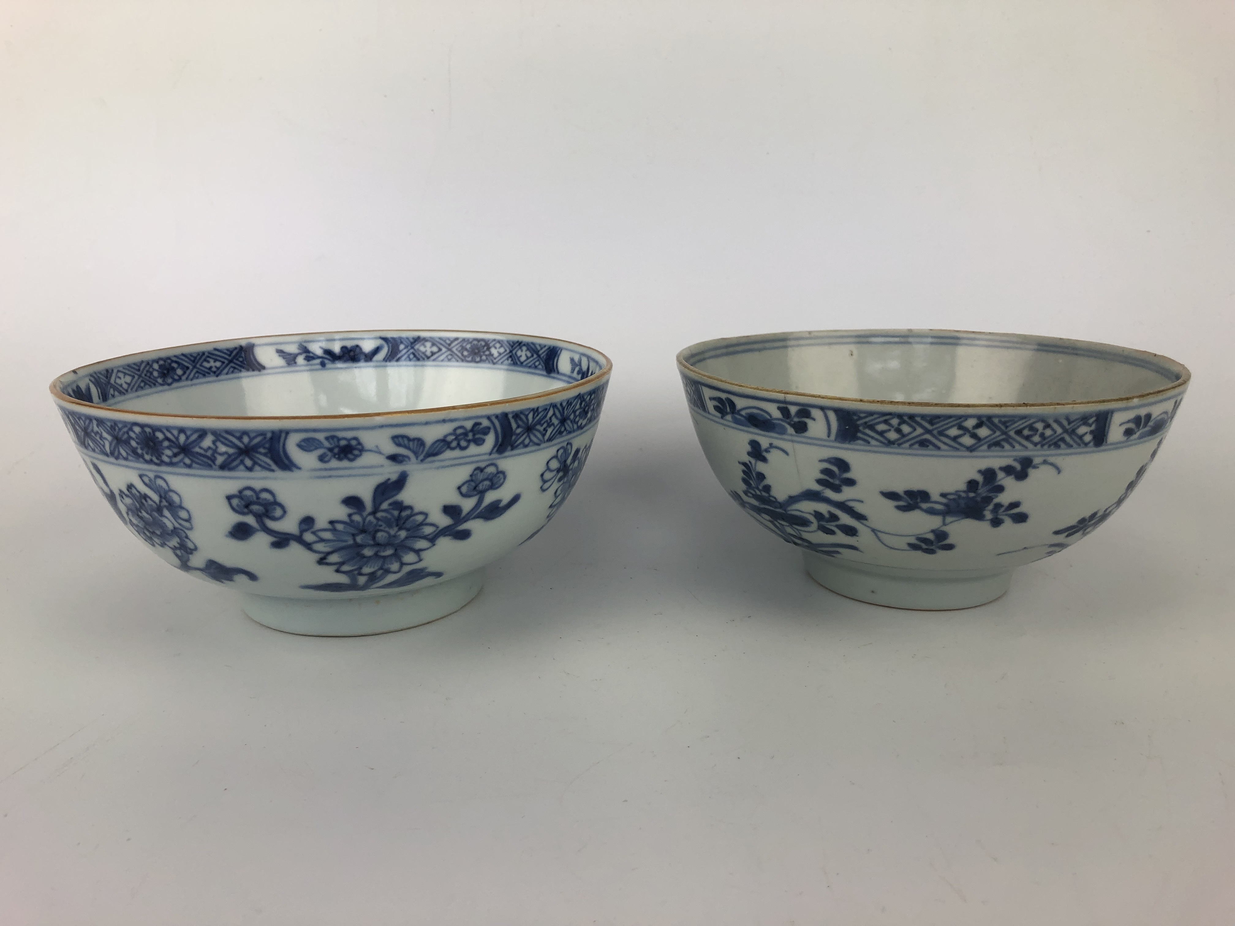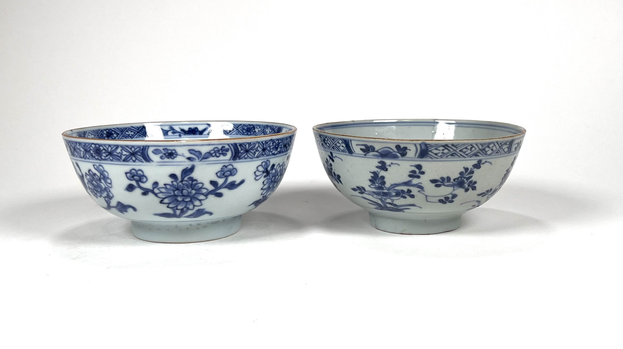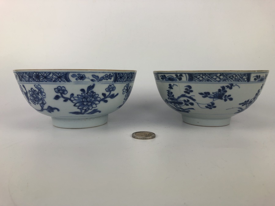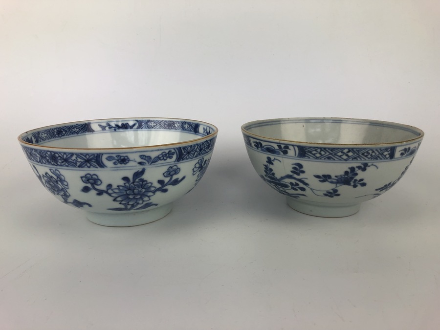Twee Chinese blauw-witte porseleinen kommen, handbeschilderd met onder andere chrysanten. Vermoedelijk roomkommen voor de export gemaakt. Chienlung periode, 18e eeuw.