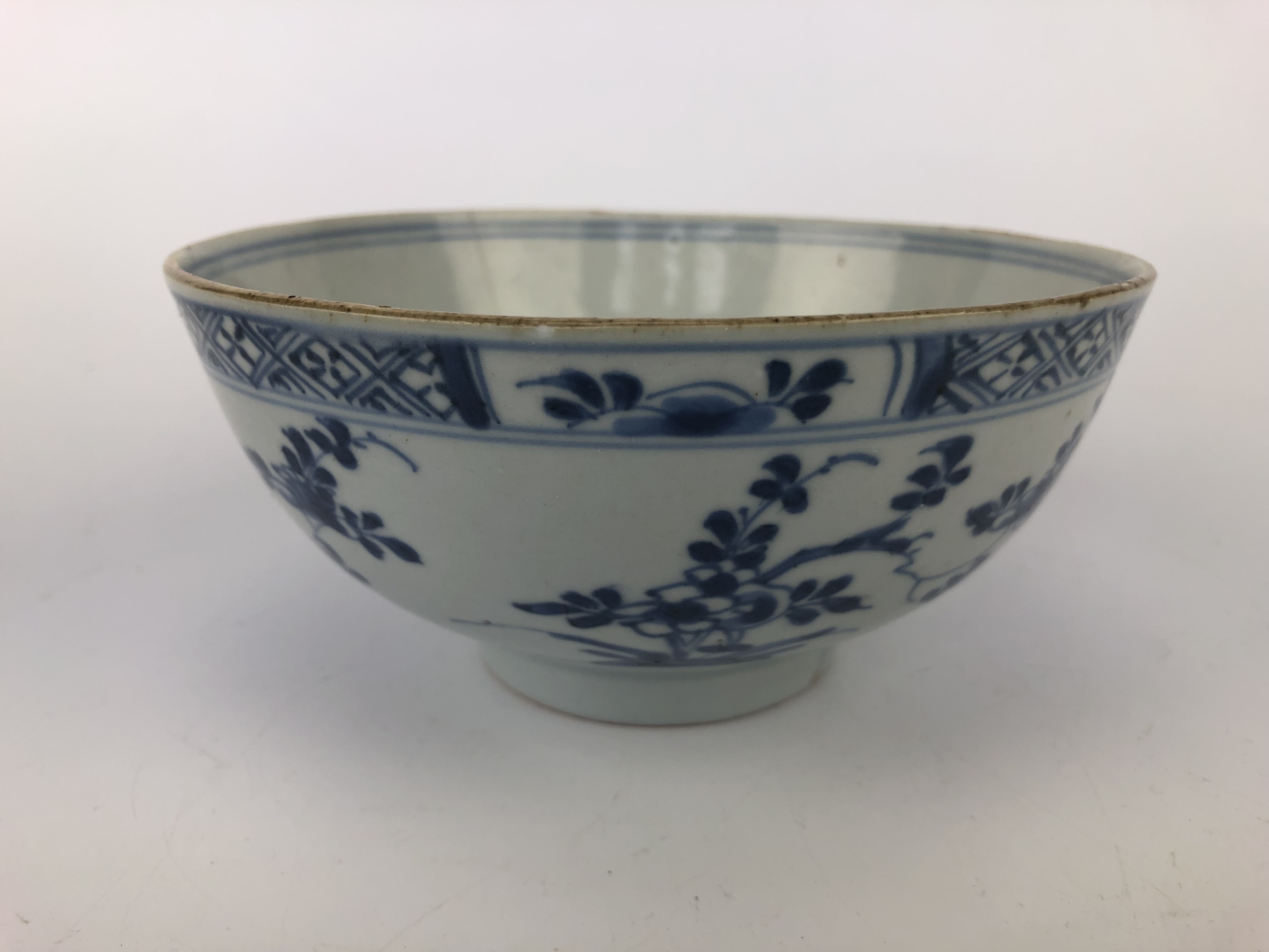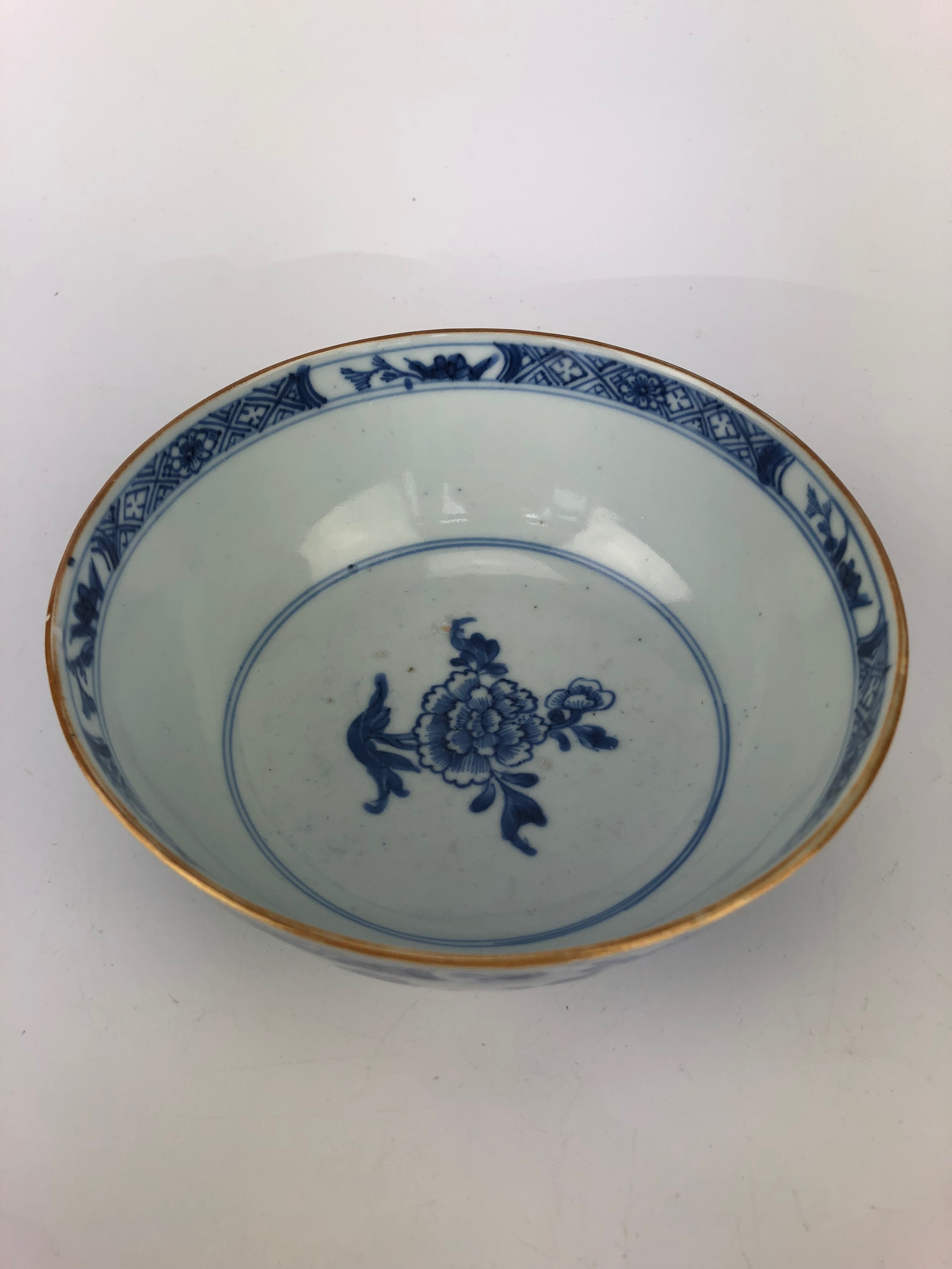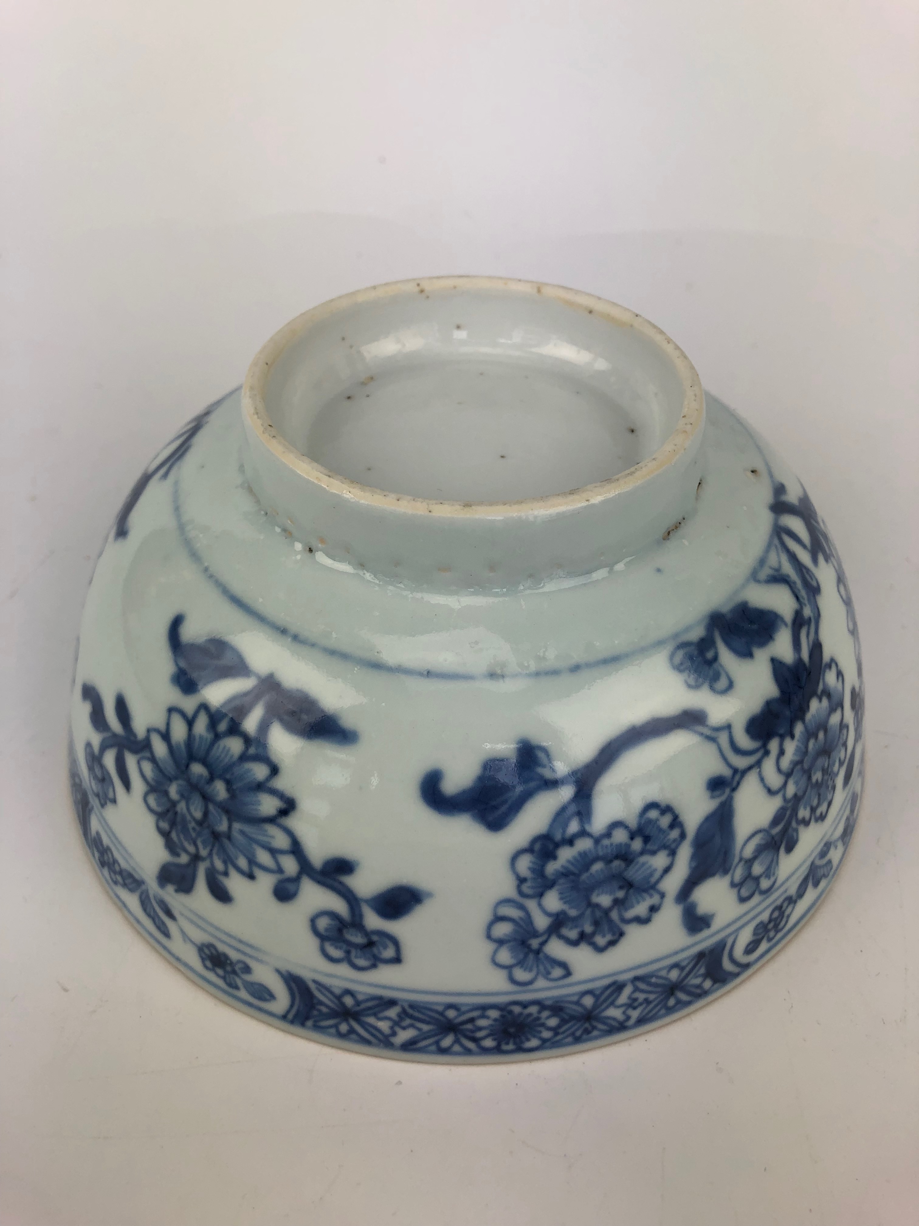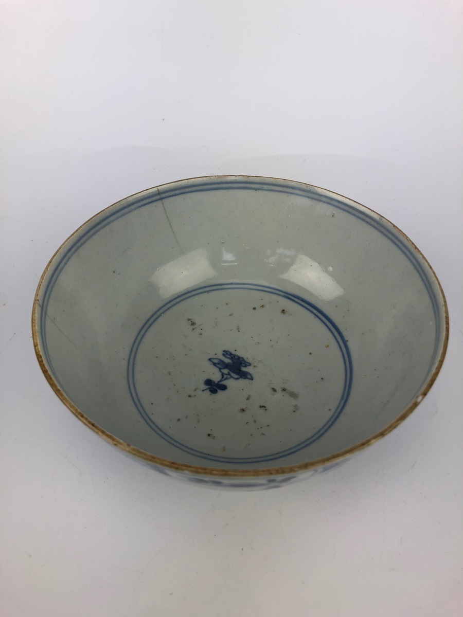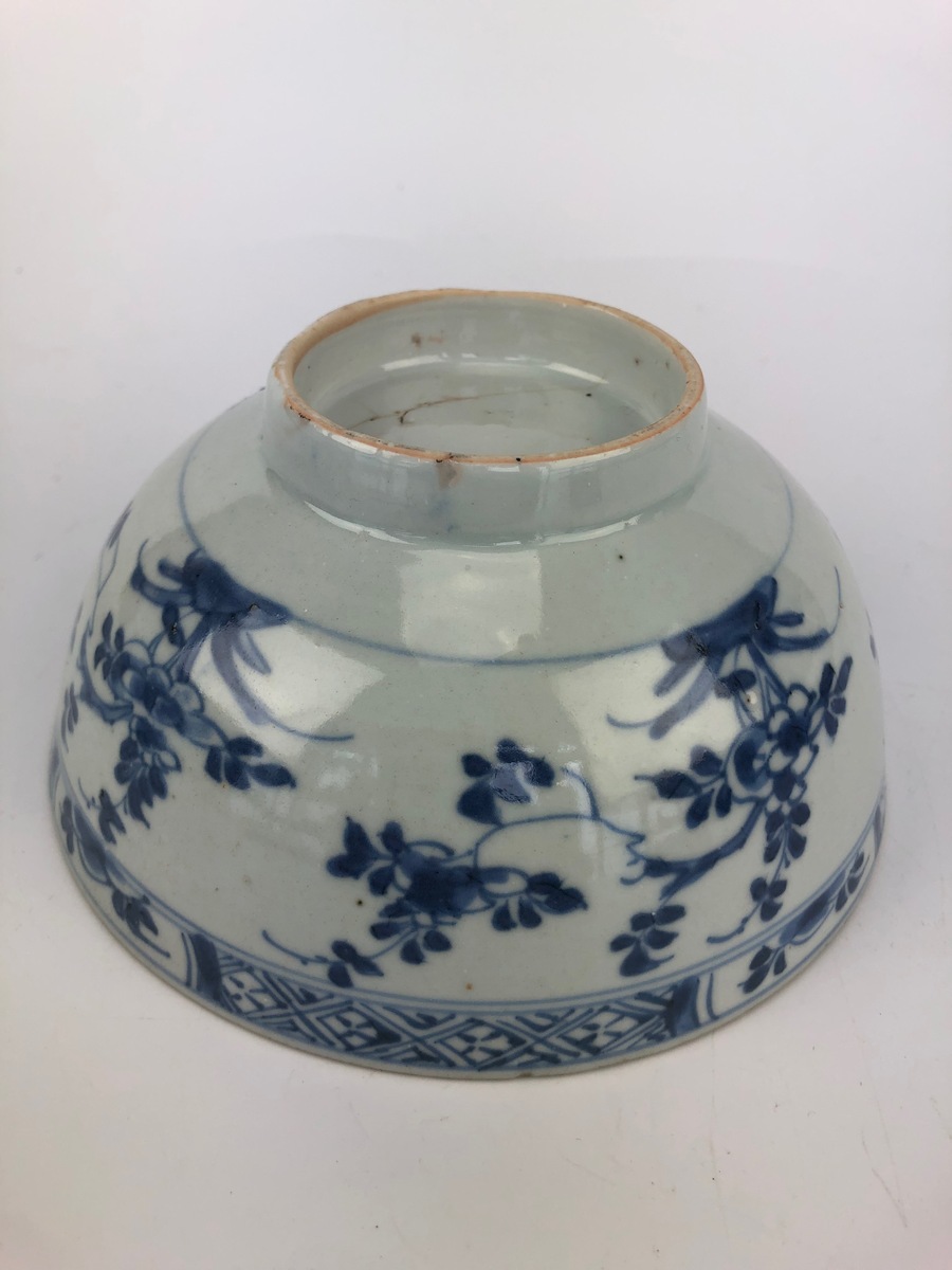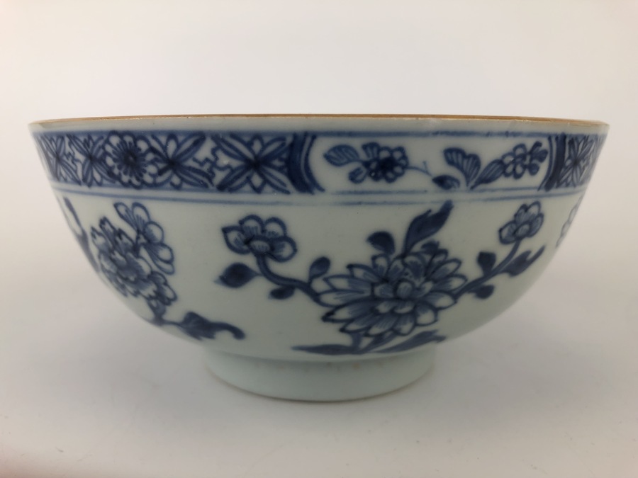 Twee Chinese blauw-witte porseleinen kommen, handbeschilderd met onder andere chrysanten. Vermoedelijk roomkommen voor de export gemaakt. Chienlung periode, 18e eeuw.