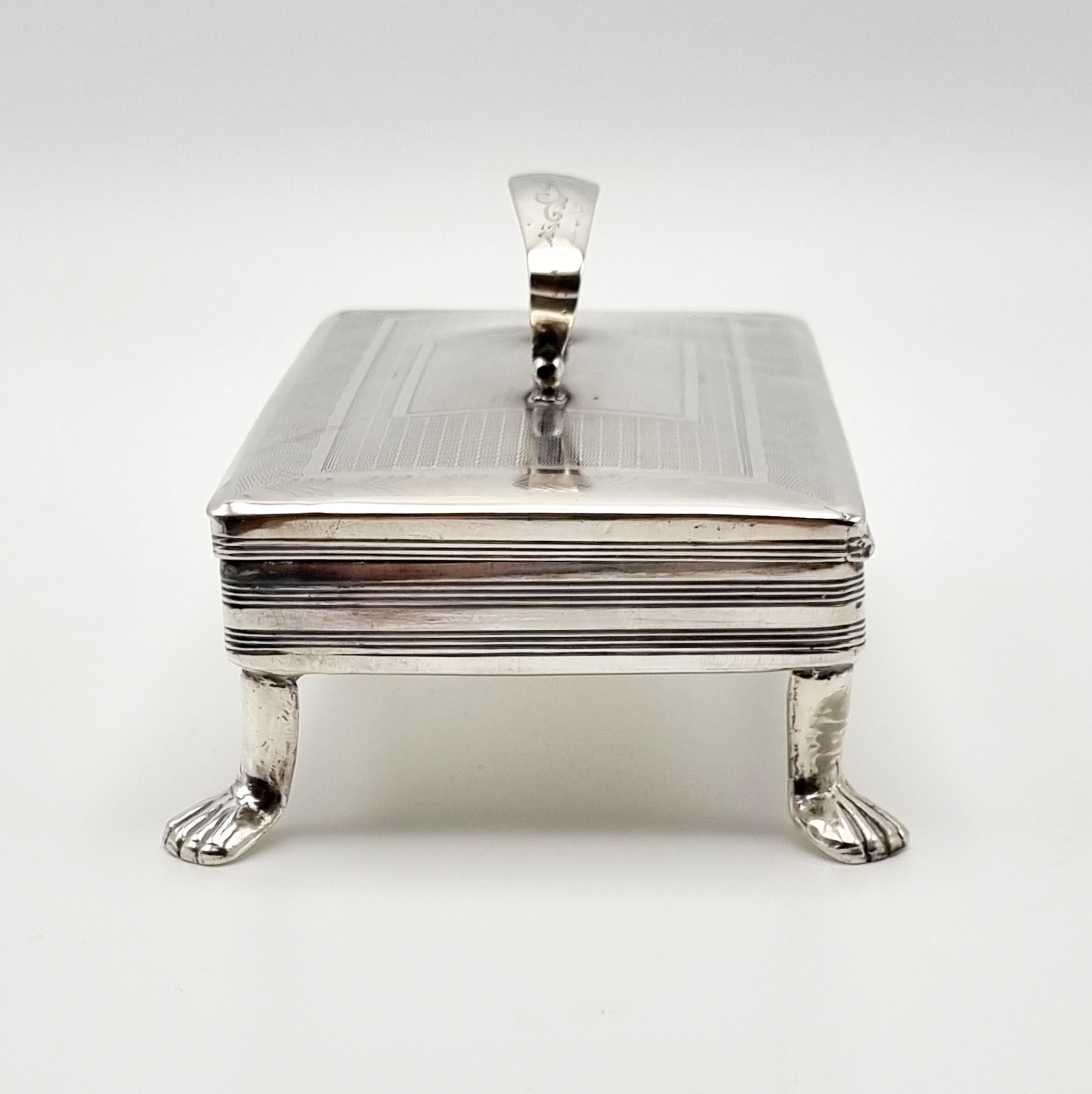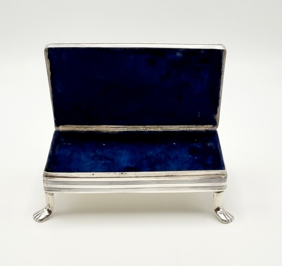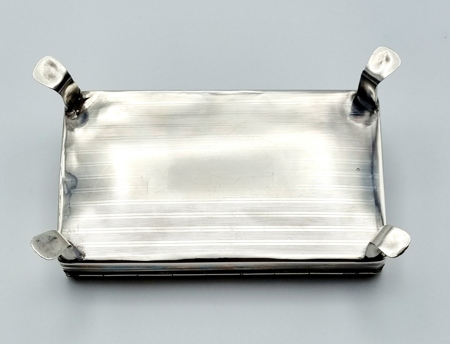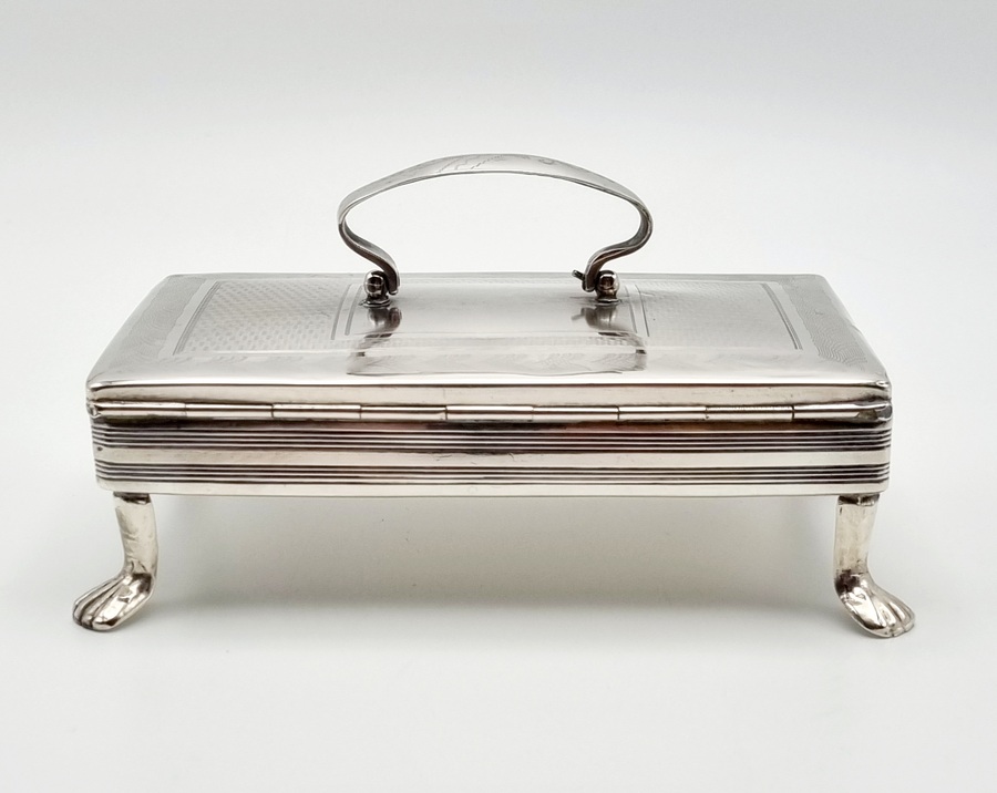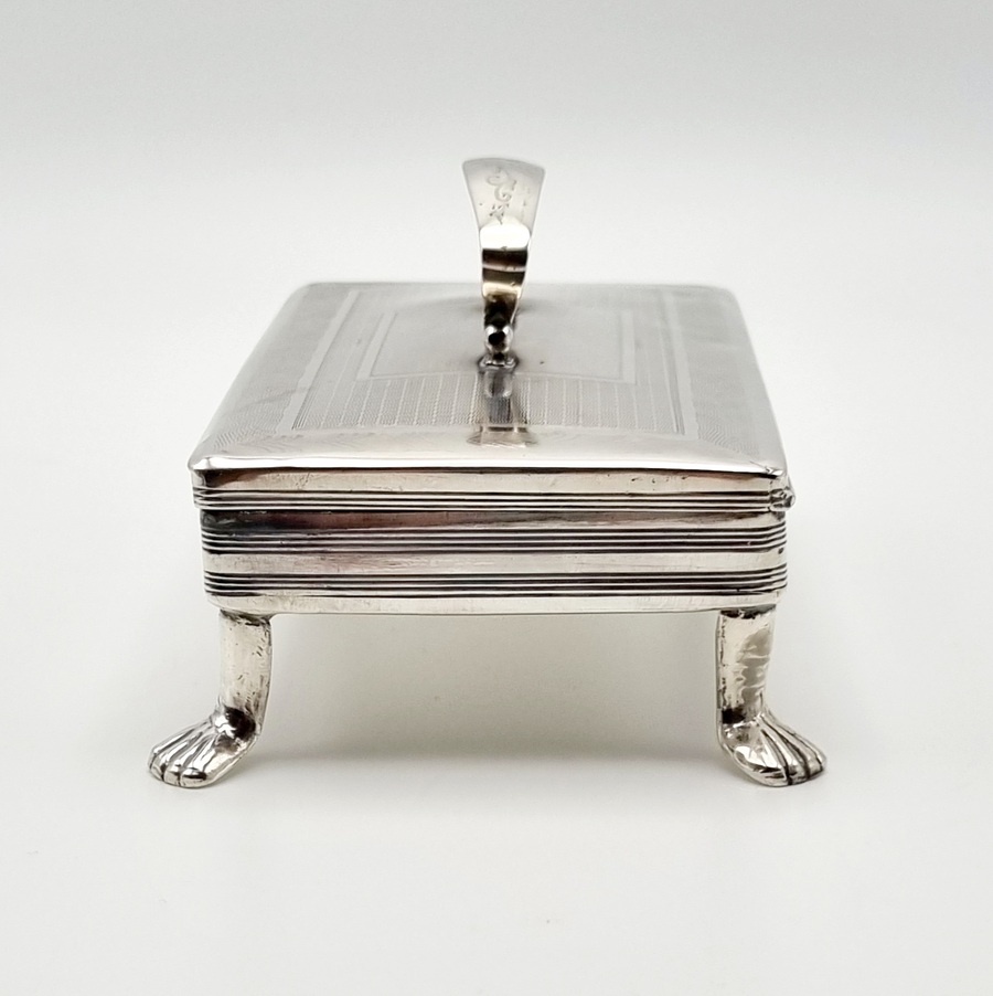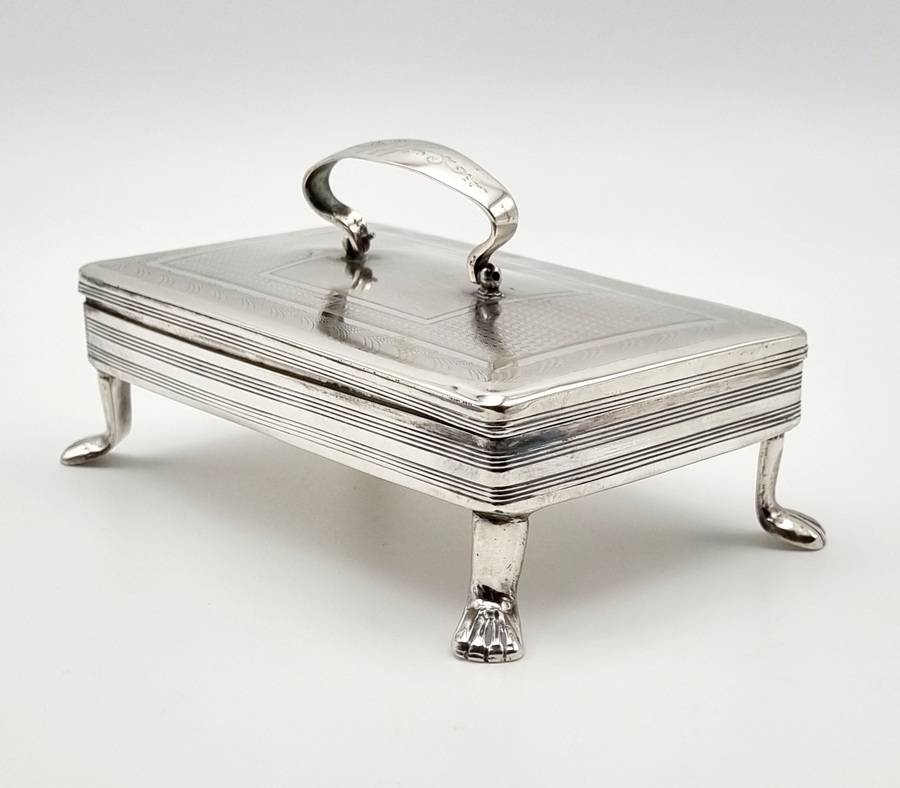 Antieke zilveren tabaksdoos vermaakt tot lepeldoos, op poten en met handgreep. Bovenkant en greep met geciseleerde bewerking. Gemerkt met jaarletter S (1852). |