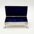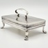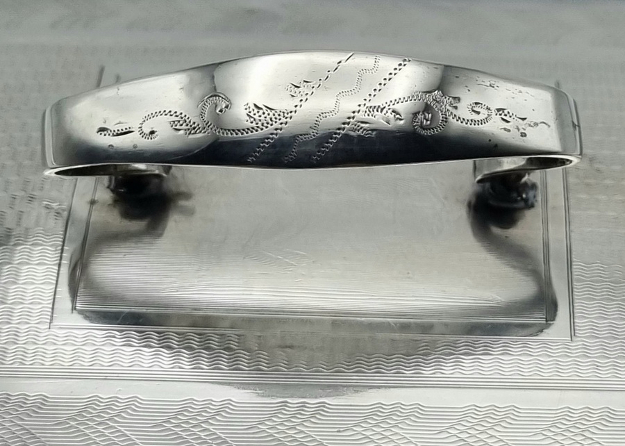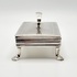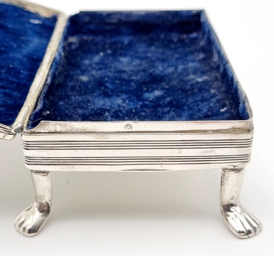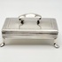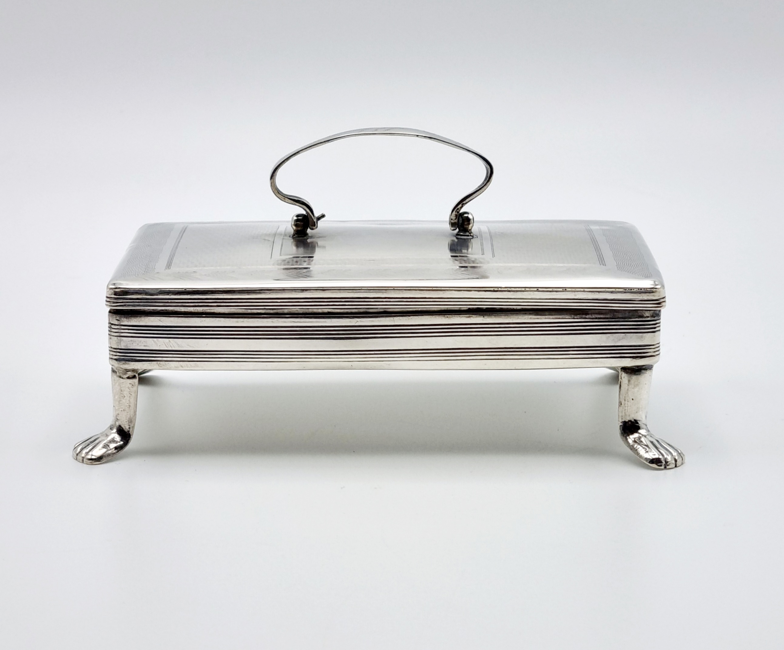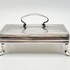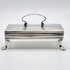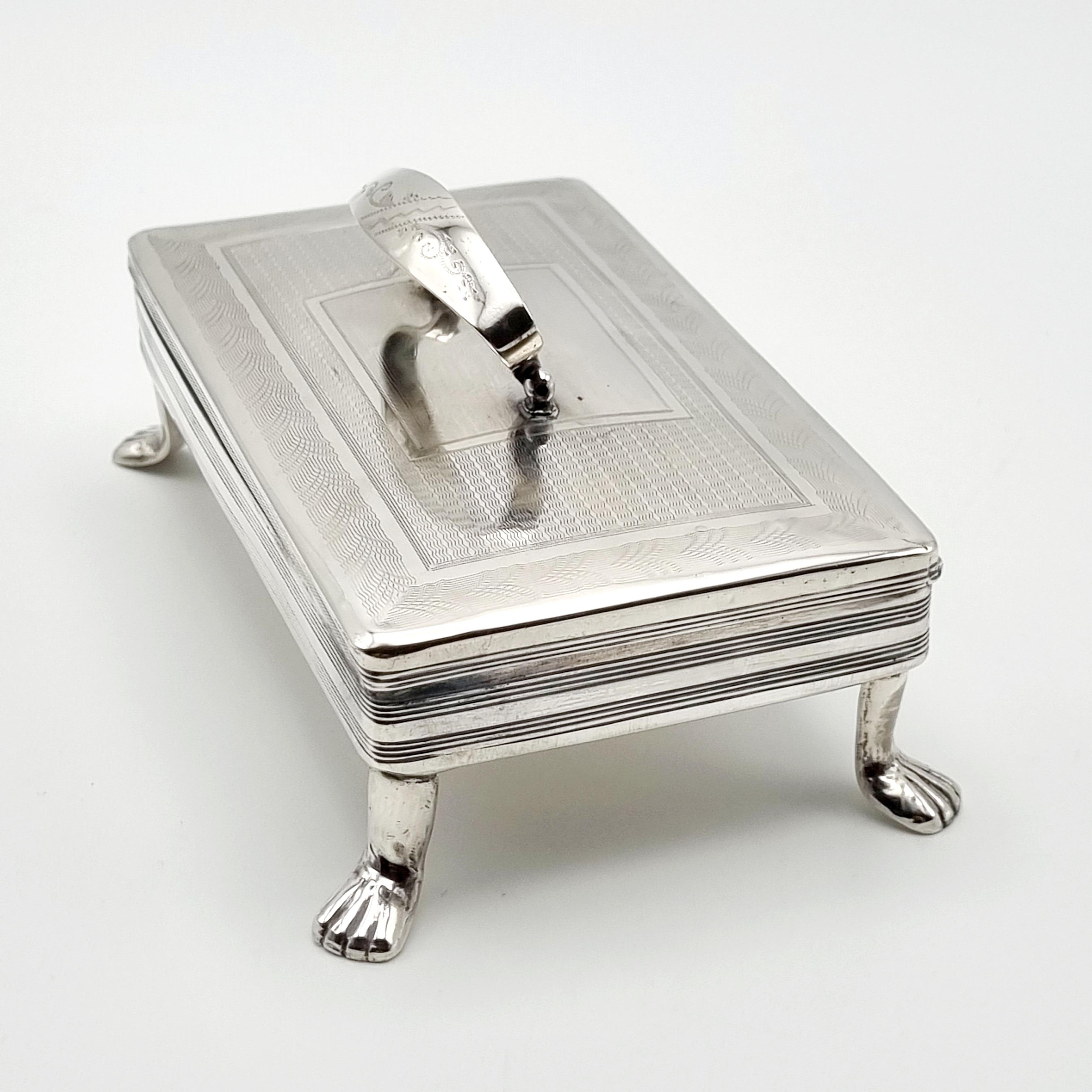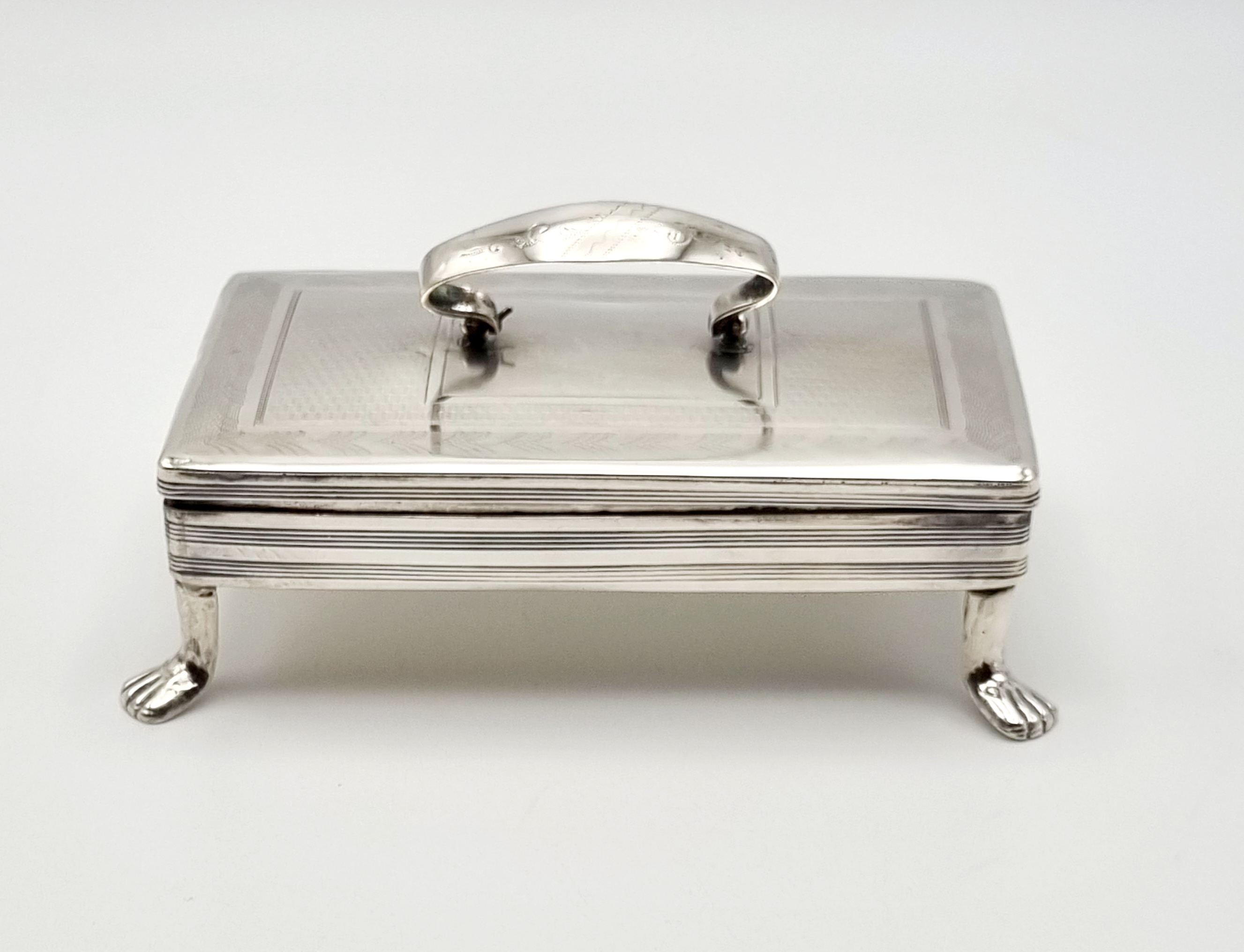 Antieke zilveren tabaksdoos vermaakt tot lepeldoos, op poten en met handgreep. Bovenkant en greep met geciseleerde bewerking. Gemerkt met jaarletter S (1852). |
