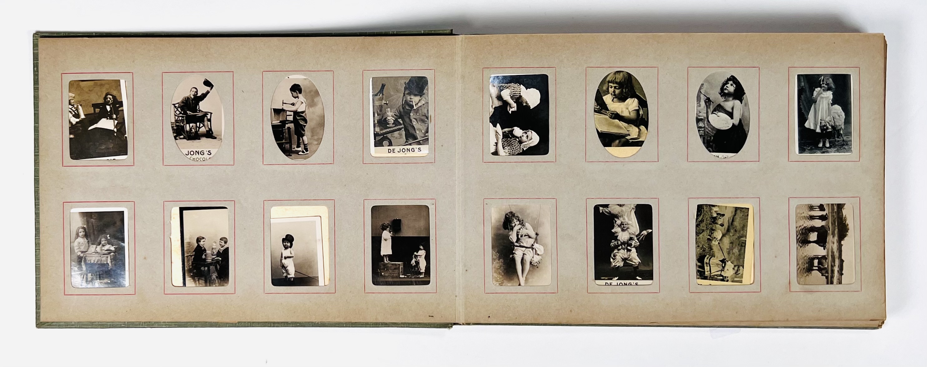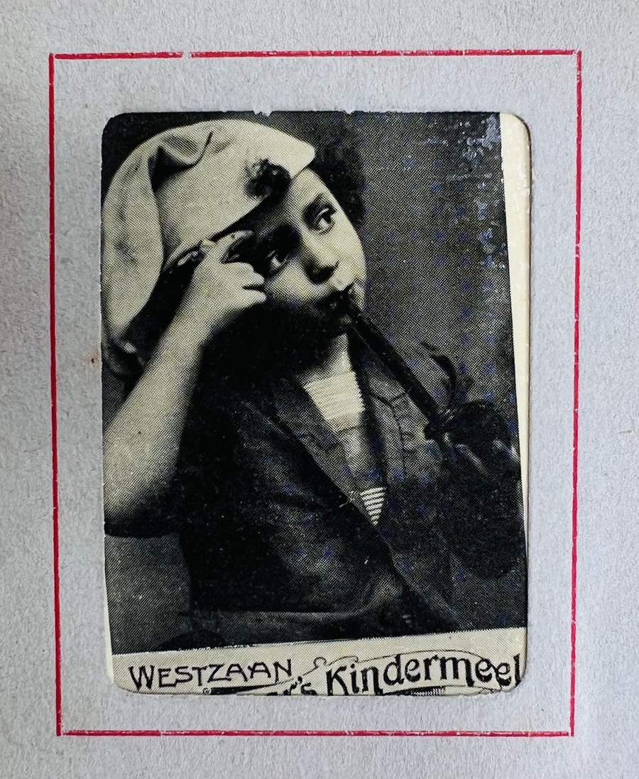 Plaatjesalbum gevuld met circa honderdeenentwintig plaatjes van kinderportretten en dierenafbeeldingen. Uitgegeven door onder meer de Jong’s, Bensdorp’s Cacao en Chocolaad, Westzaan Molenaar’s Kindermeel H. Van Toorn uit Vlaardingen en overige. Eerste kwart 20e eeuw. |