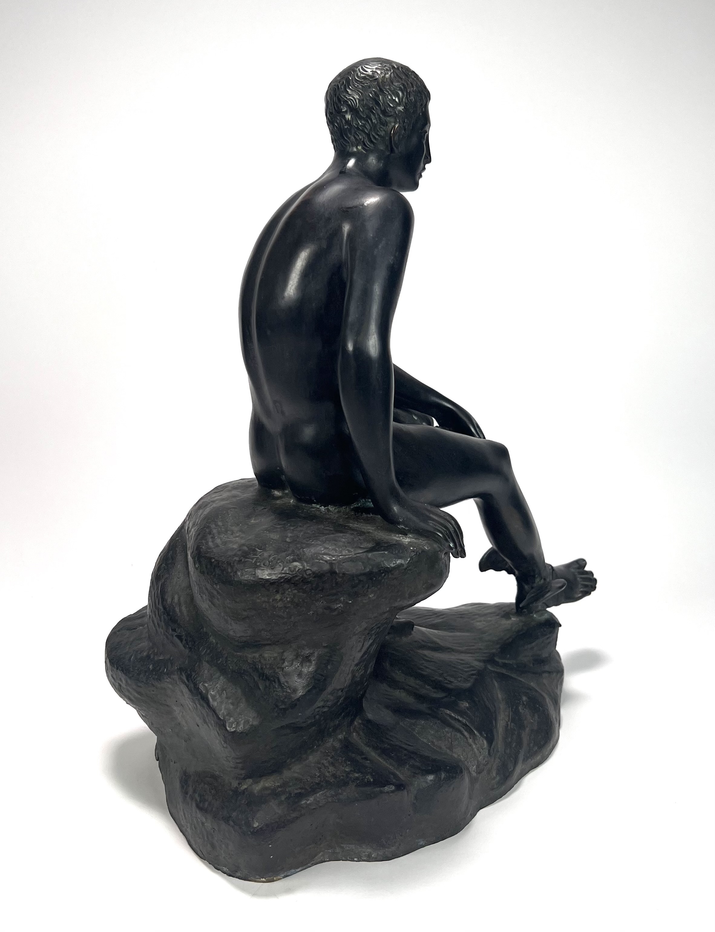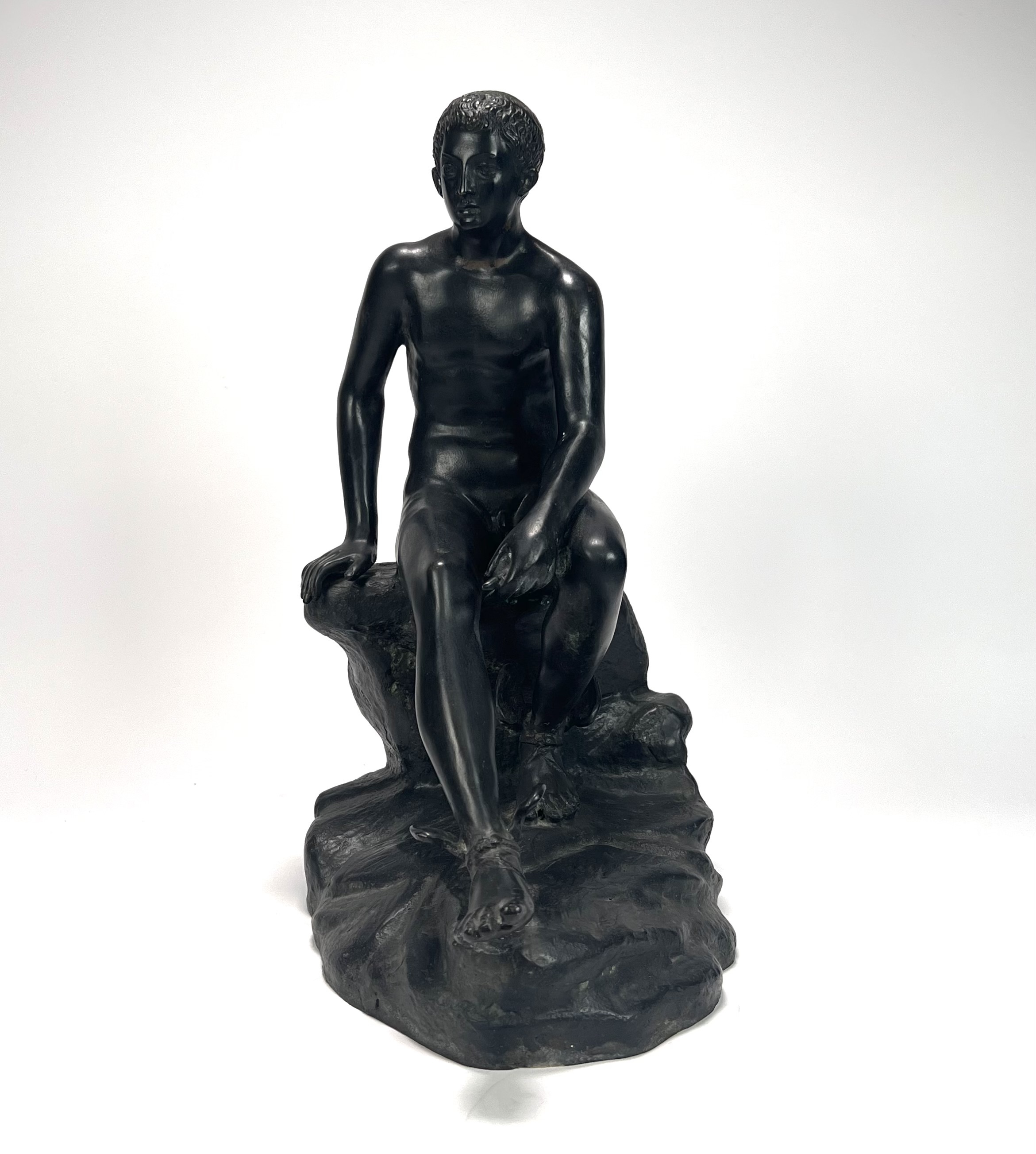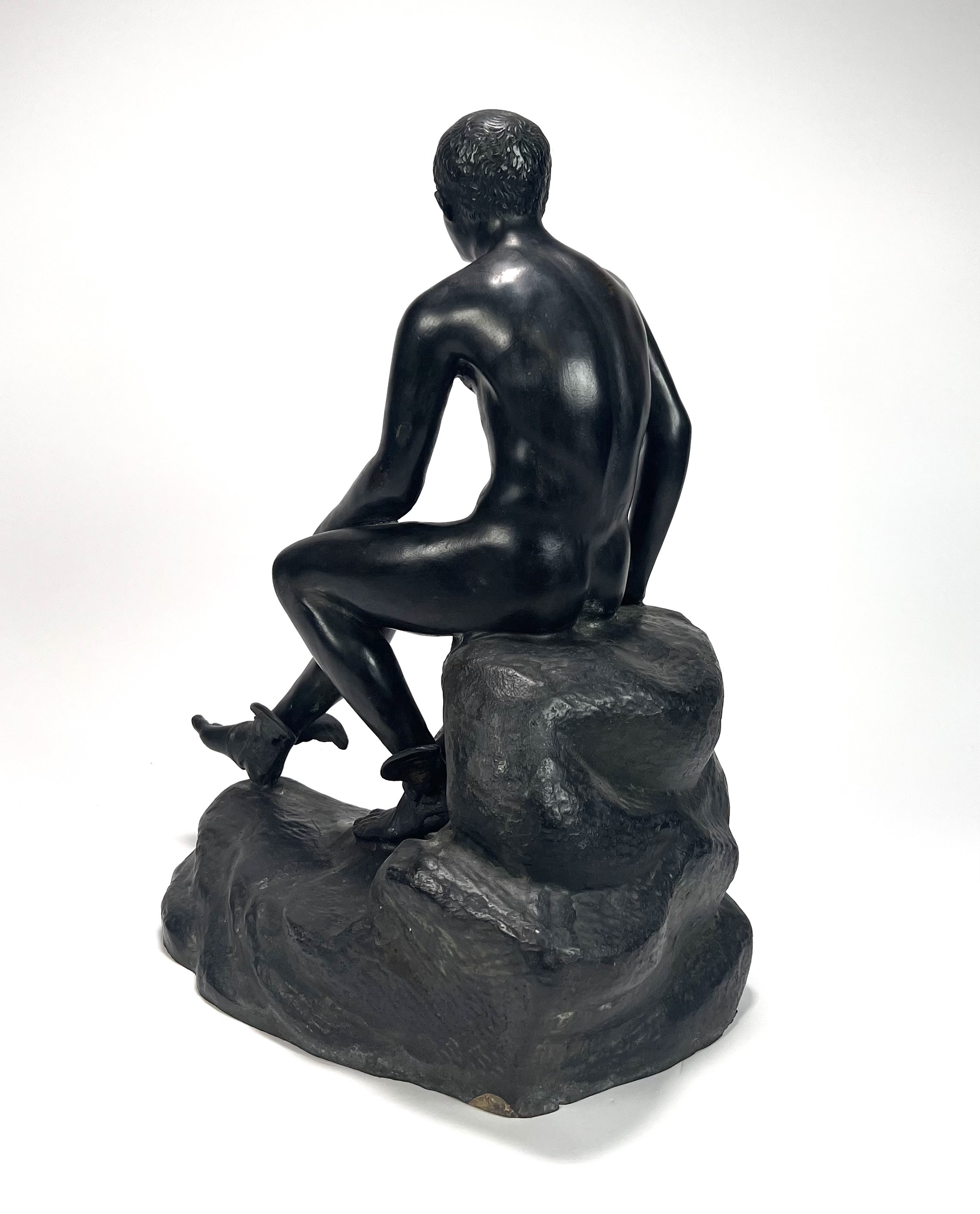 Bronzen donker gepatineerd beeld van Mercurius zittend op een rots, een kopie naar een Grand Tour beeld. Aan de achterzijde gesigneerd F. de Luca. Italië, eind 20e eeuw. |