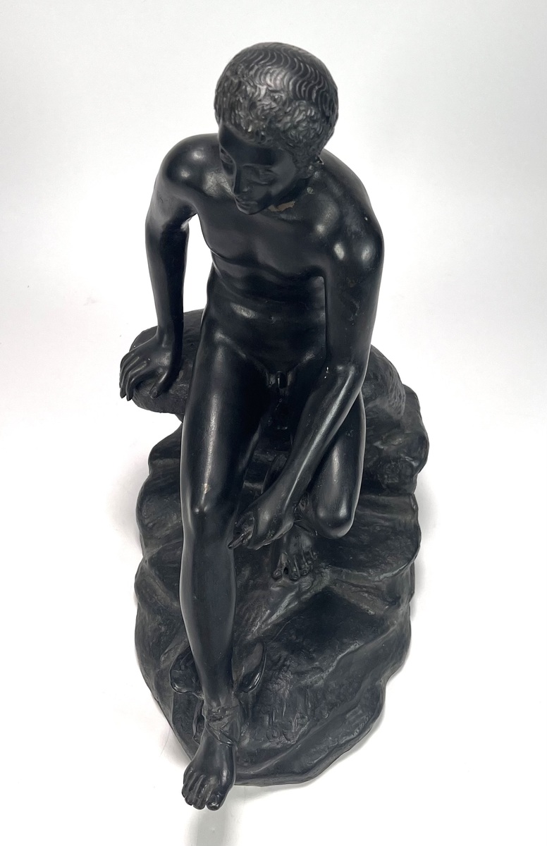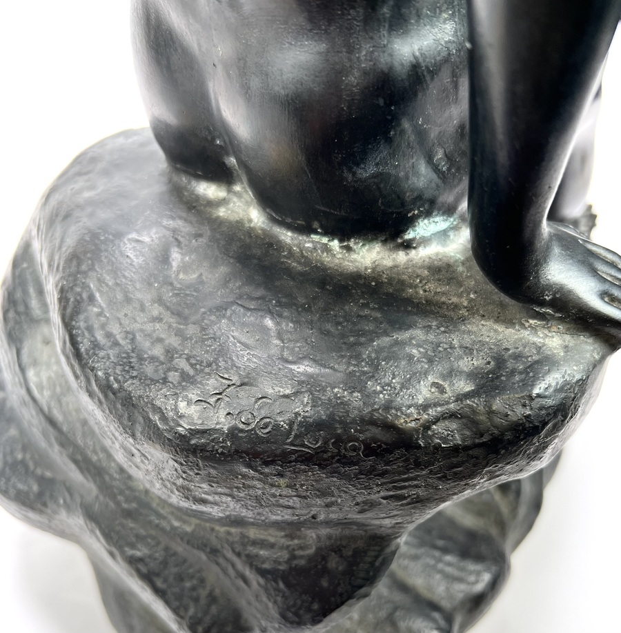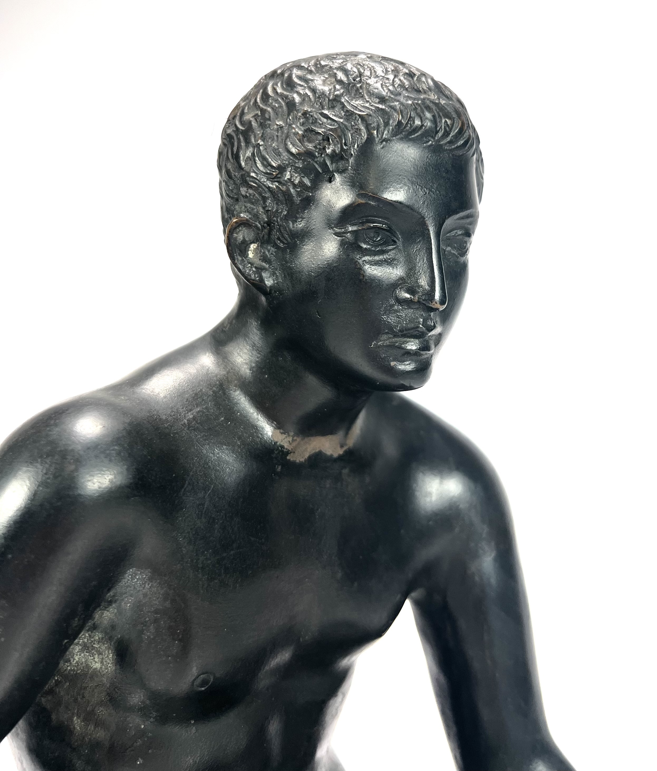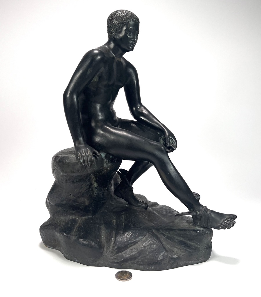 Bronzen donker gepatineerd beeld van Mercurius zittend op een rots, een kopie naar een Grand Tour beeld. Aan de achterzijde gesigneerd F. de Luca. Italië, eind 20e eeuw. |