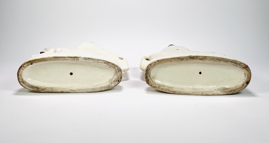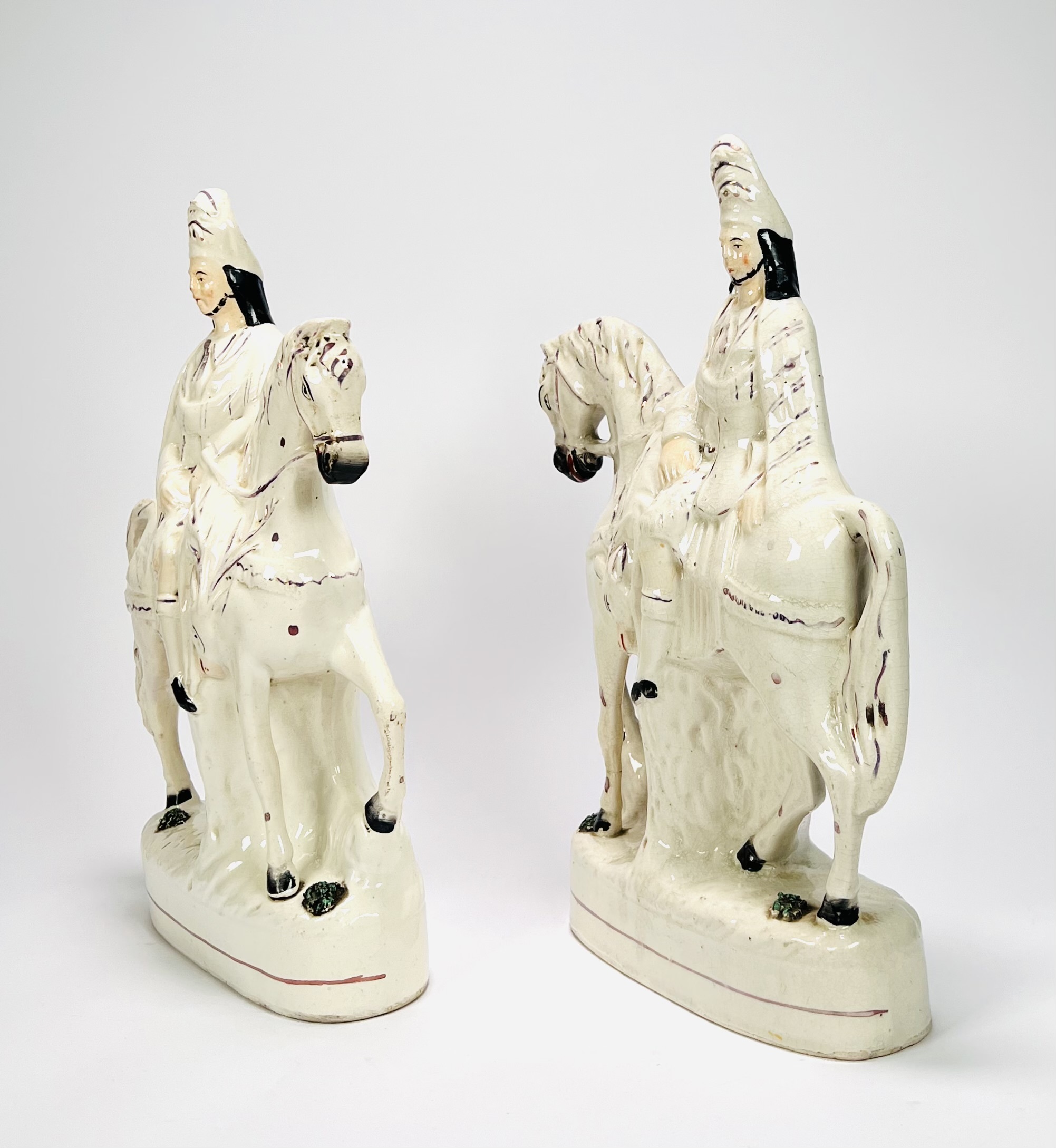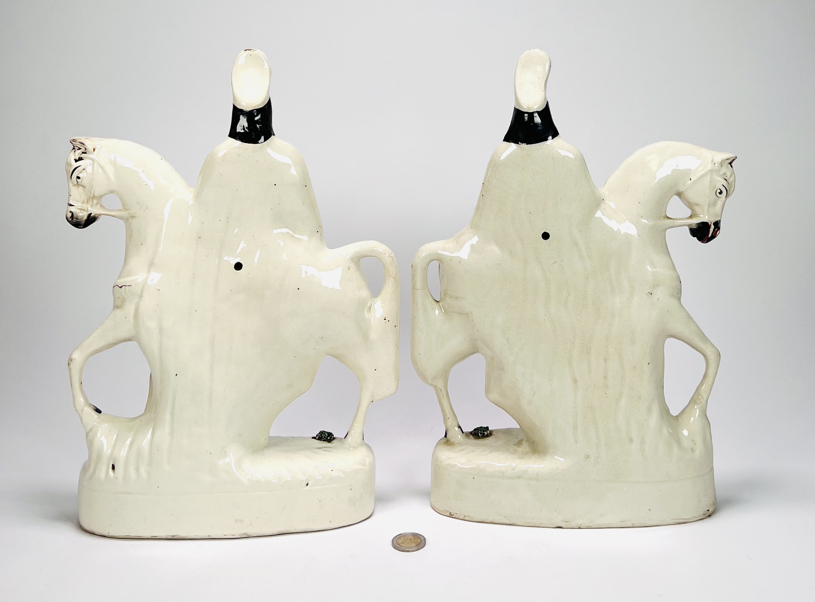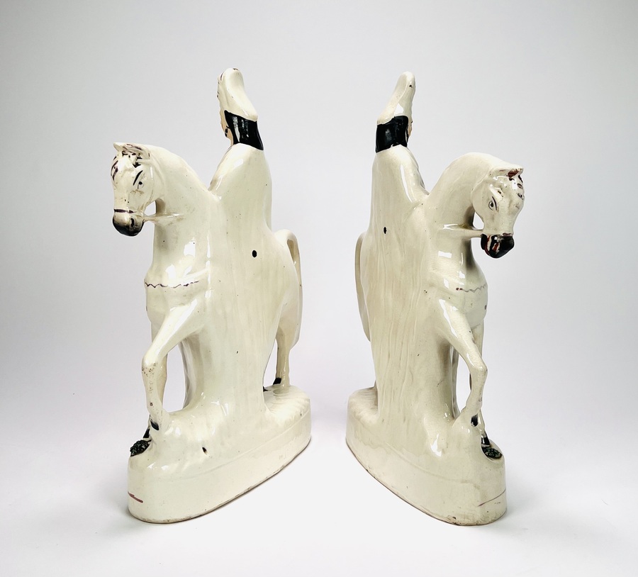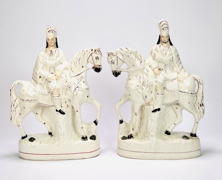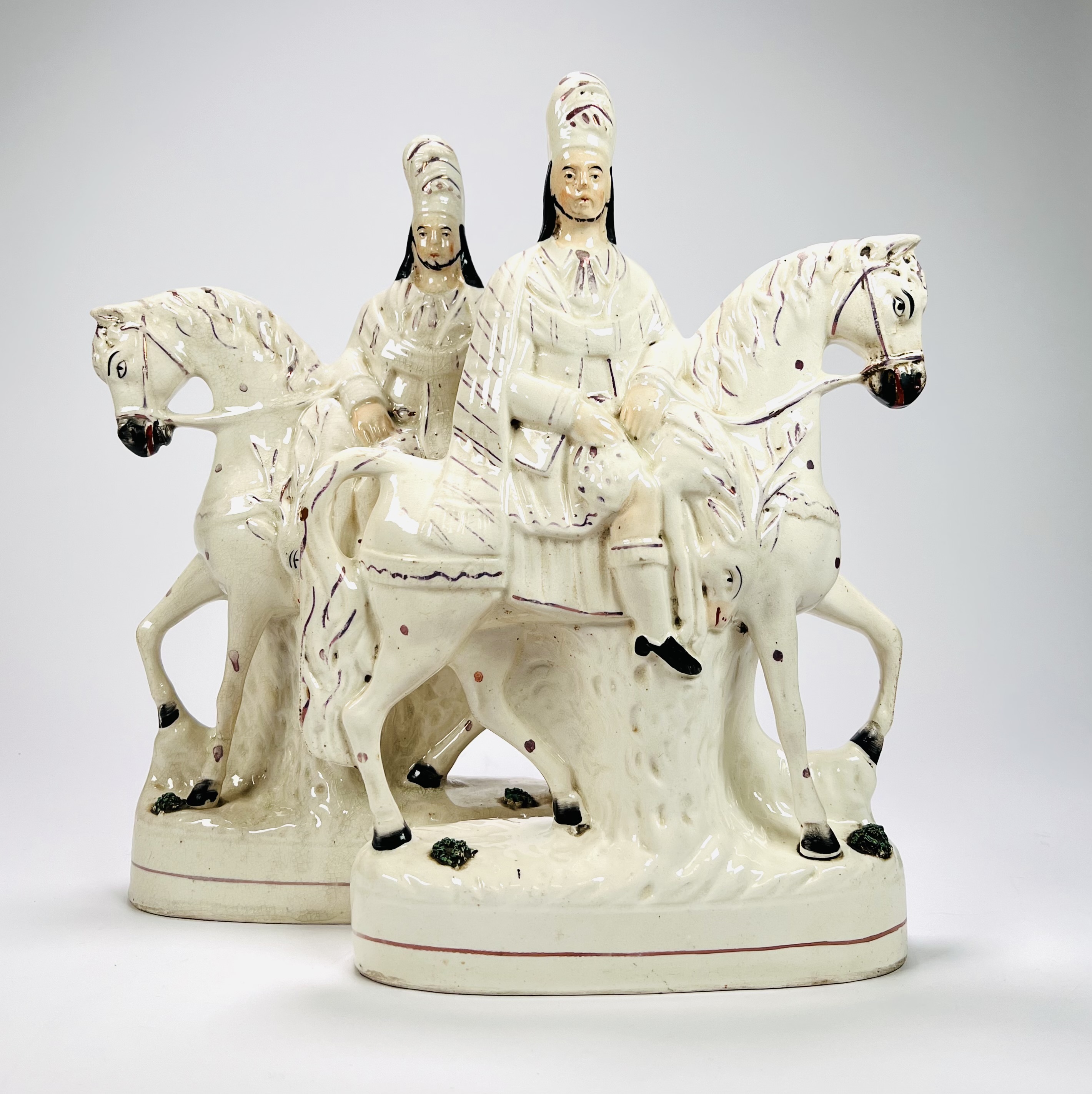 Twee porseleinen pendant Staffordshire beelden van heren te paard. Engeland, eerste helft 20e eeuw. |