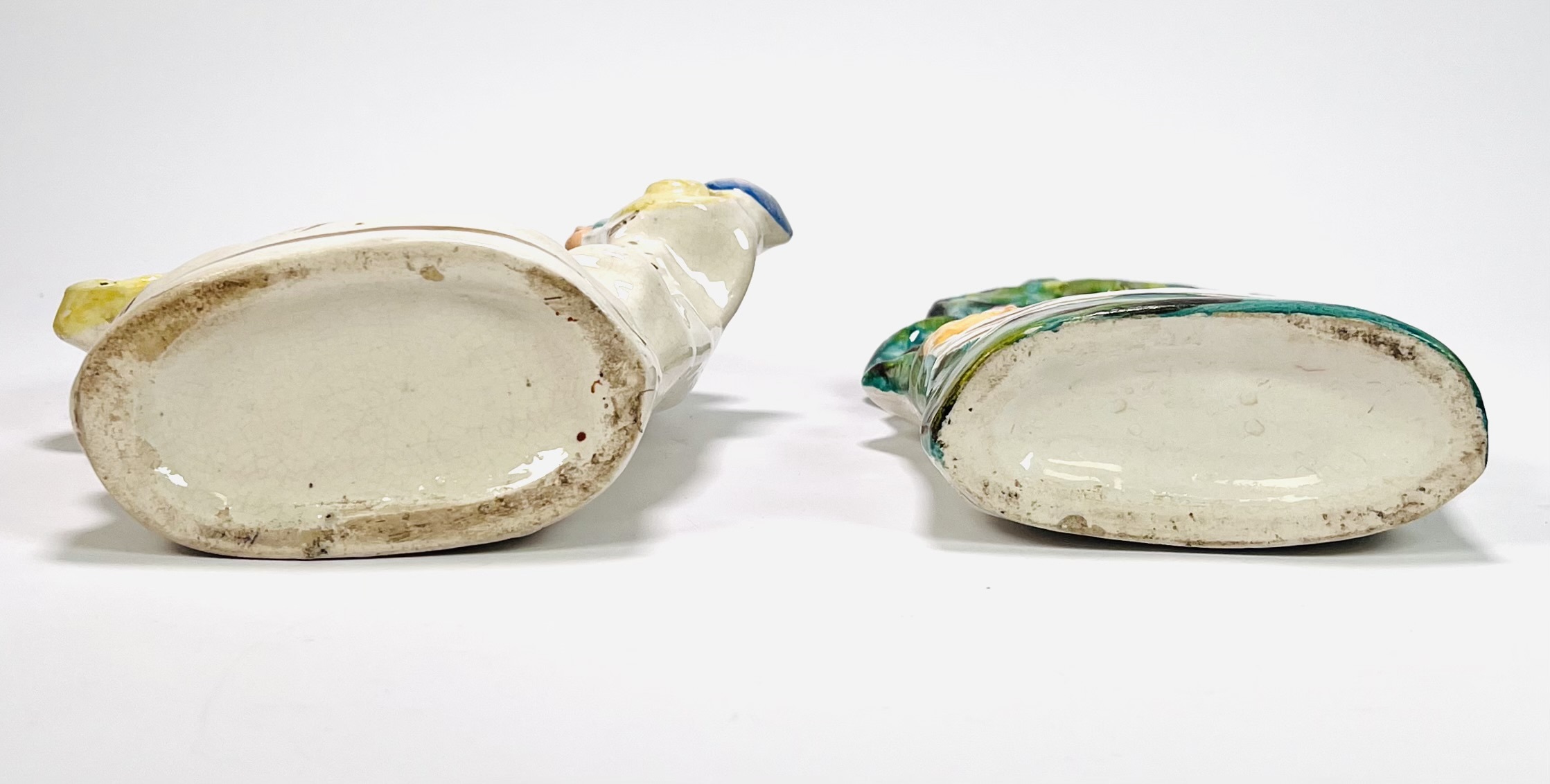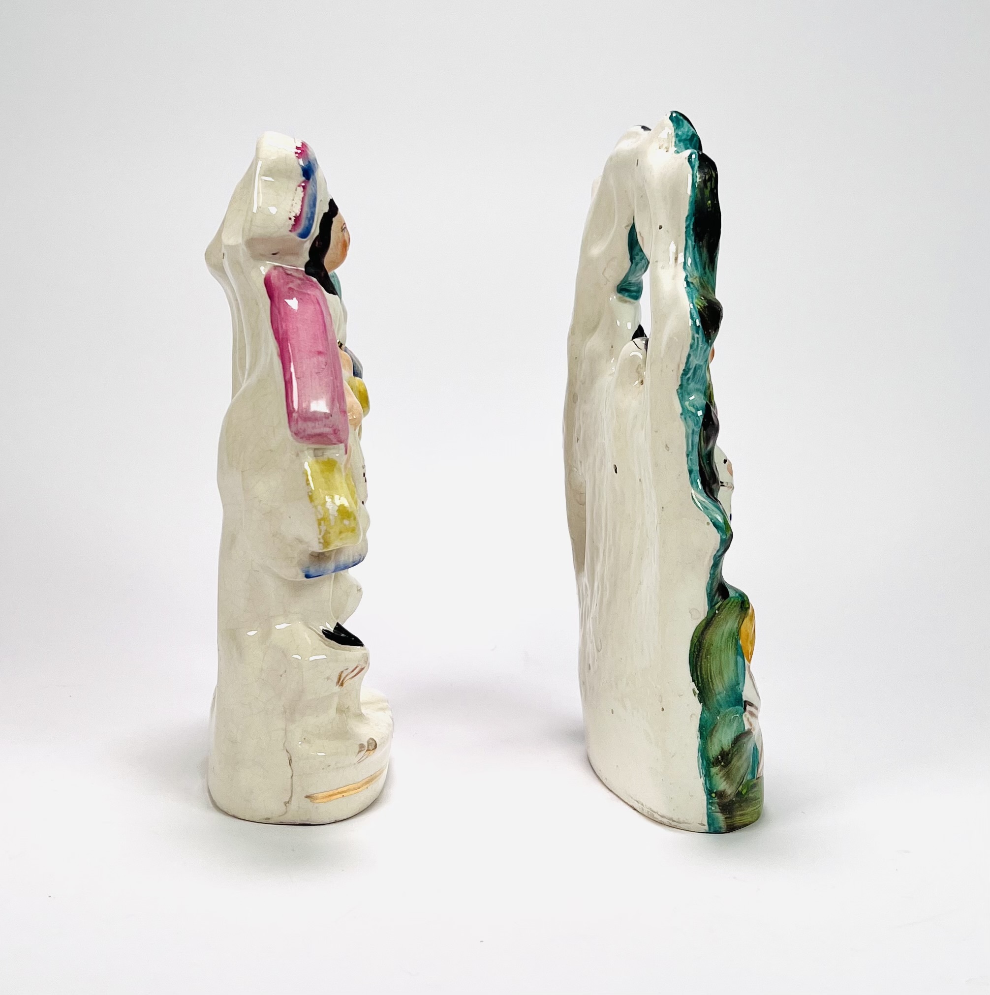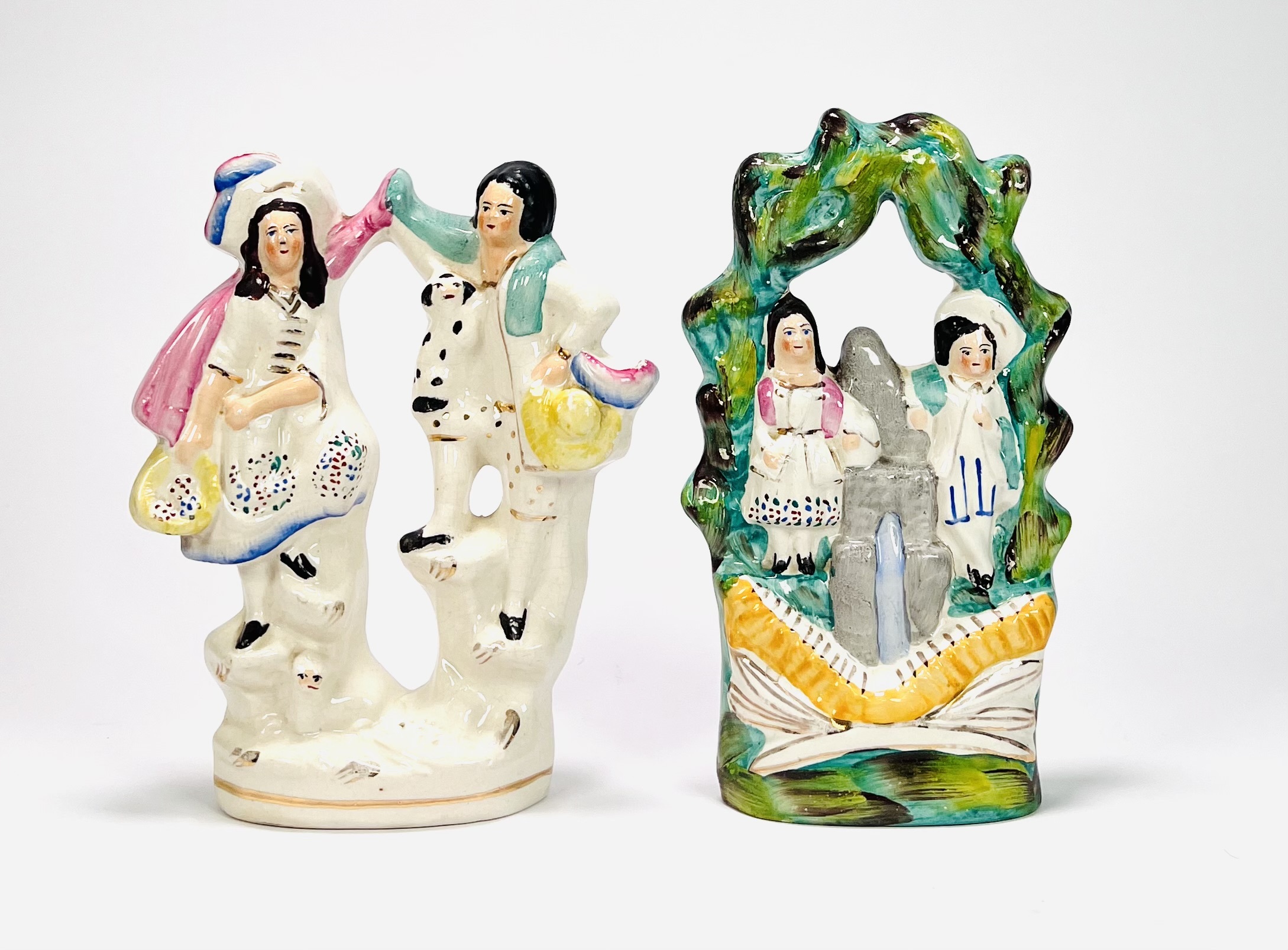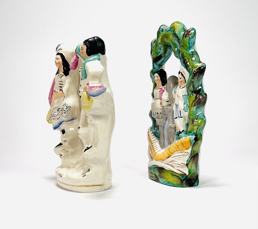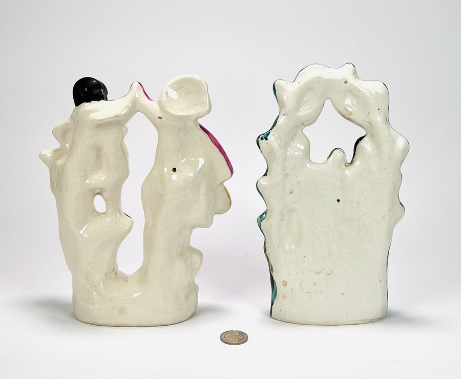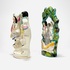 Twee polychroom handbeschilderde Staffordshire porseleinen beelden van paartjes. Engeland, eerste helft 20e eeuw. |