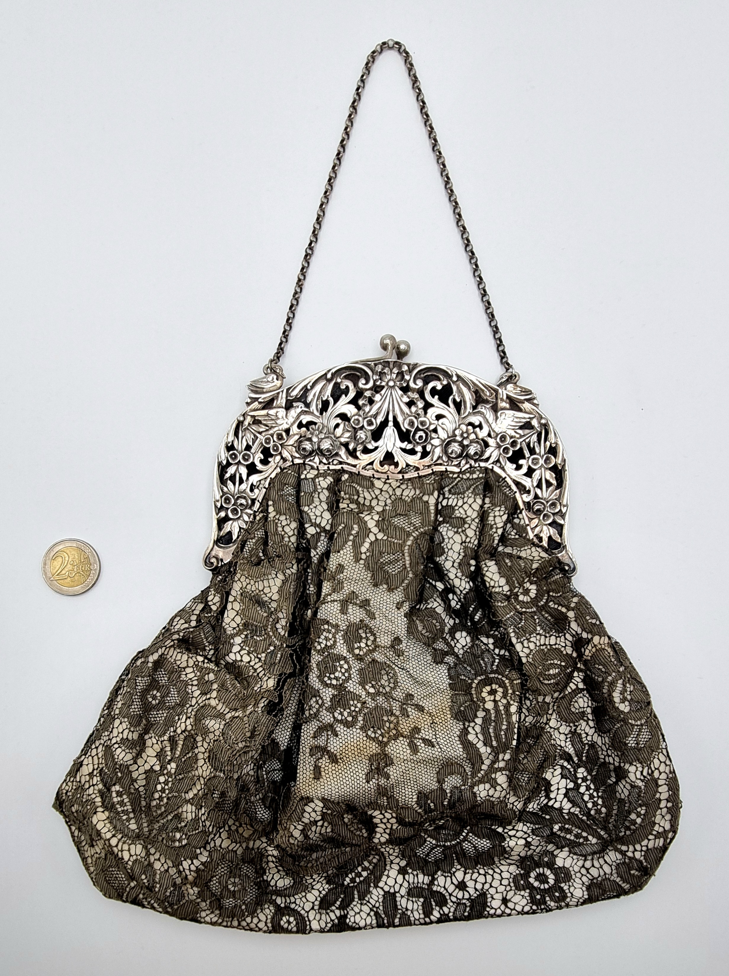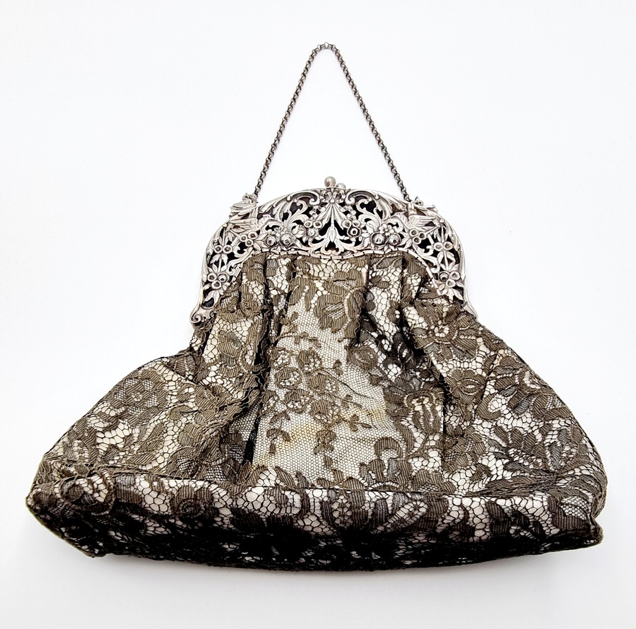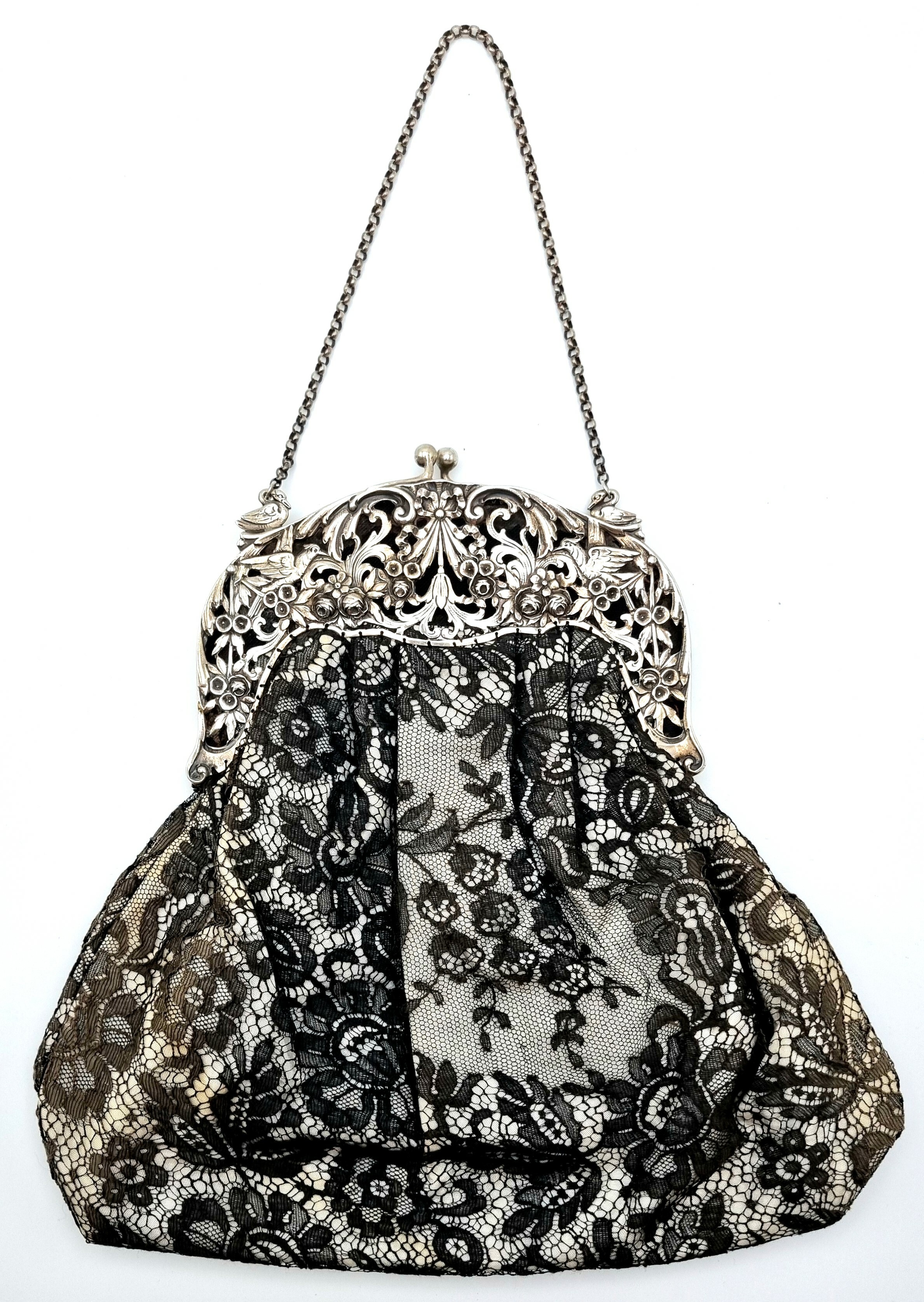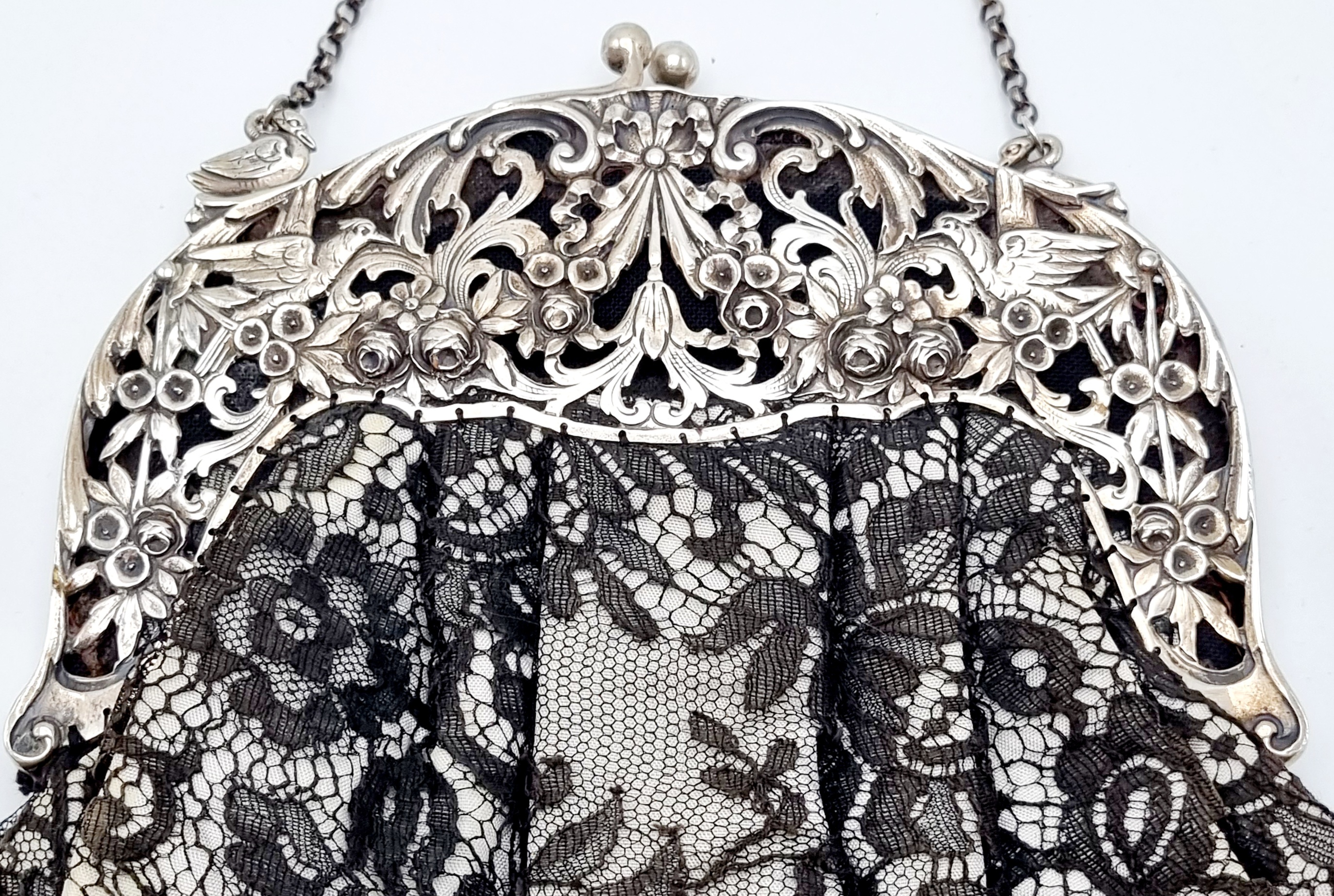 Beugeltas met zilveren floraal gedecoreerde sluiting met meerdere vogels, buidel van kant. Gemerkt met Duits zilverkeur 800, halve maan en kroontje. Duitsland, omstreeks 1900. |