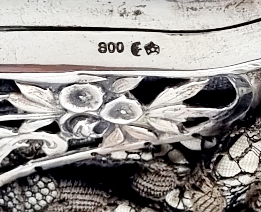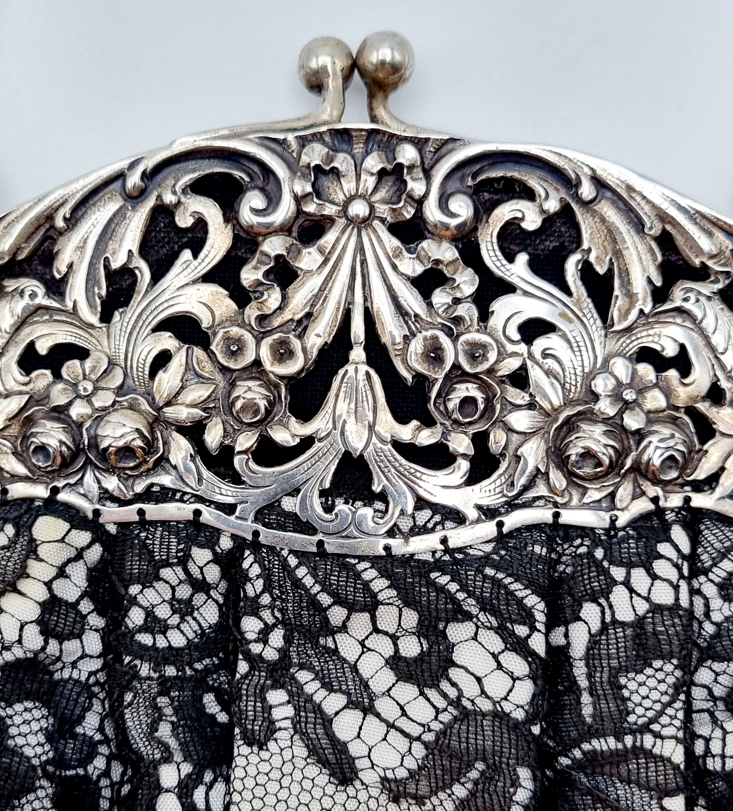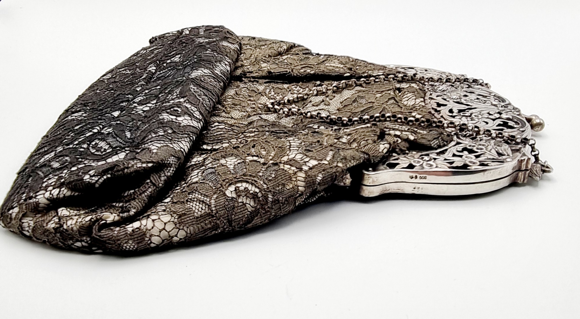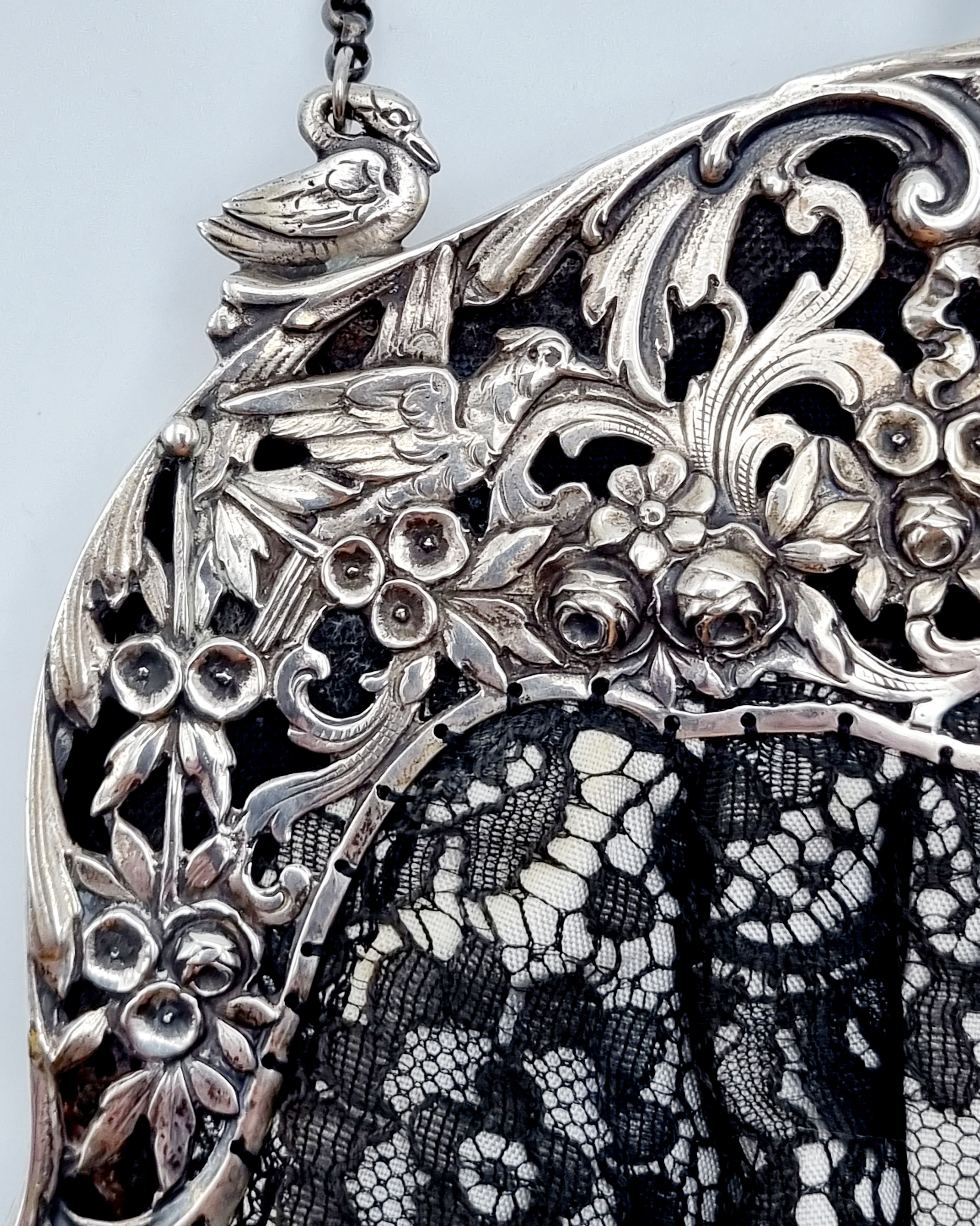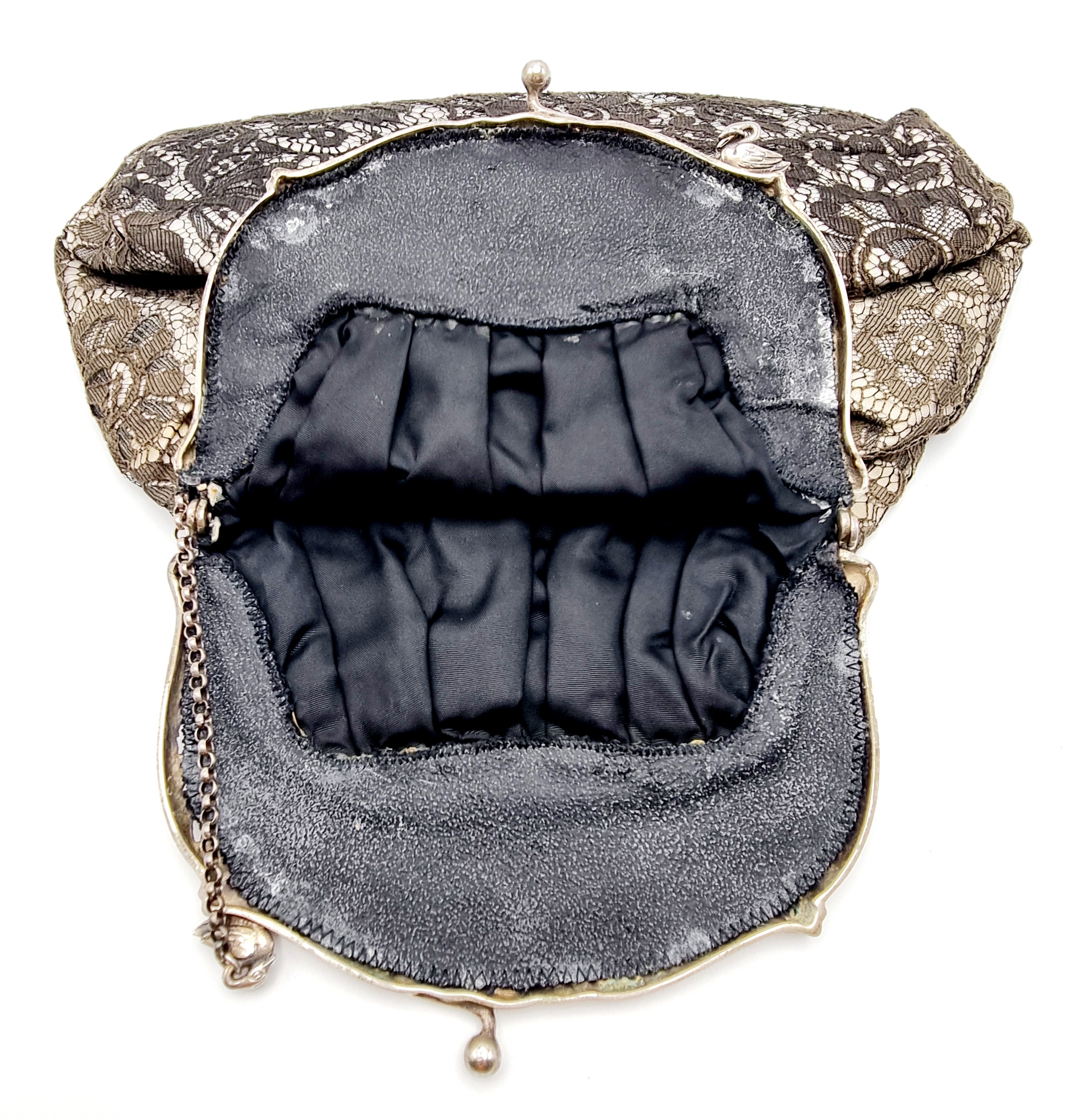 Beugeltas met zilveren floraal gedecoreerde sluiting met meerdere vogels, buidel van kant. Gemerkt met Duits zilverkeur 800, halve maan en kroontje. Duitsland, omstreeks 1900. |