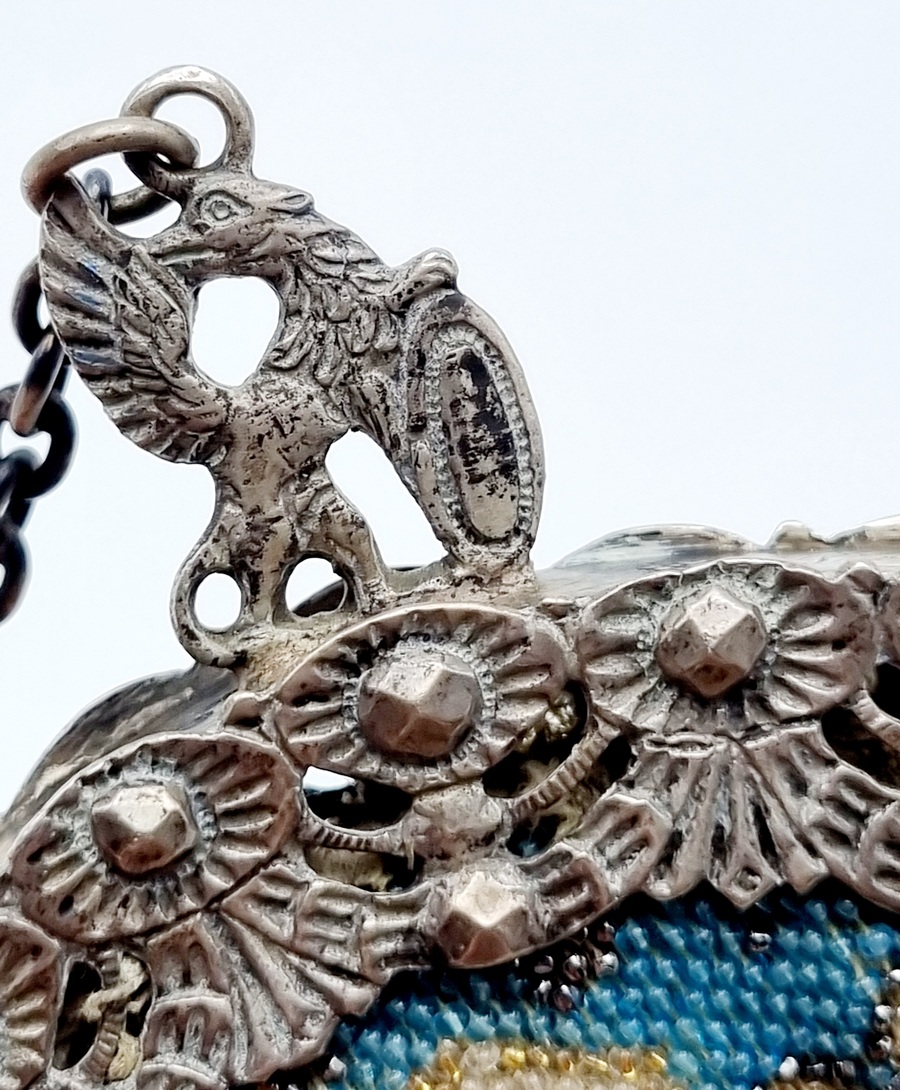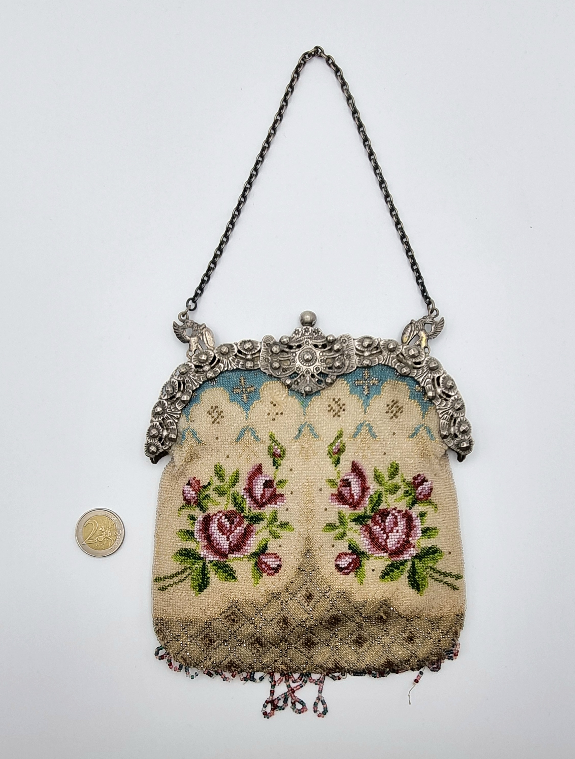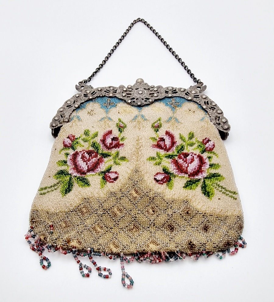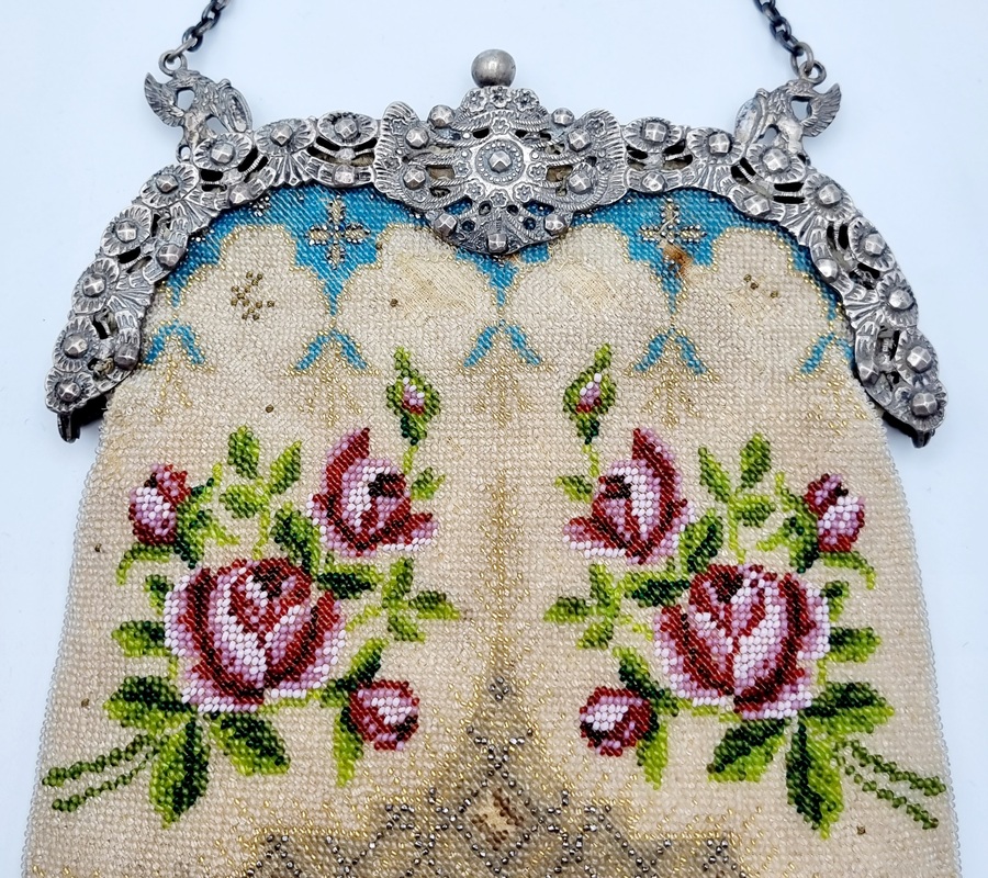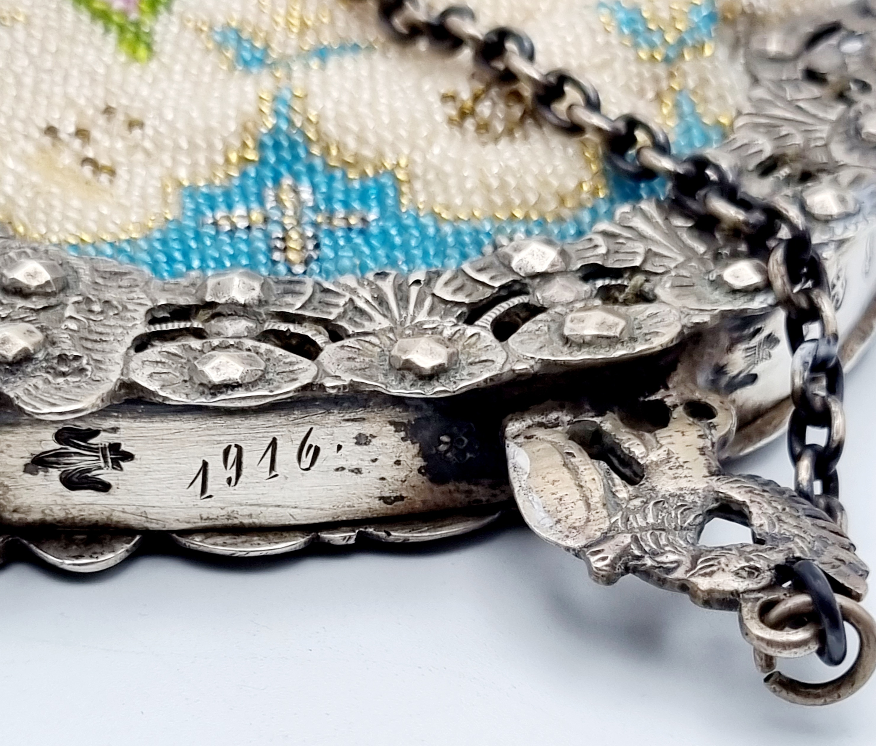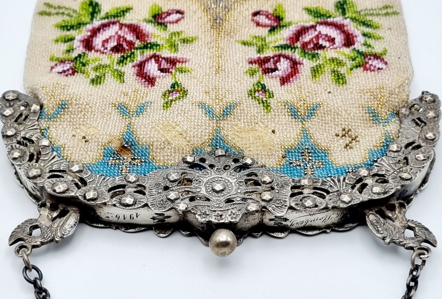 Tas met zilveren beugel, gemerkt met naar links staande leeuw, meesterkeur en een jaarletter. Kraaltjesbuidel met rozenmotief is gedateerd 1916 in de beugel. |