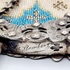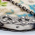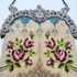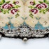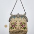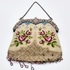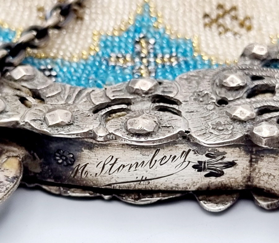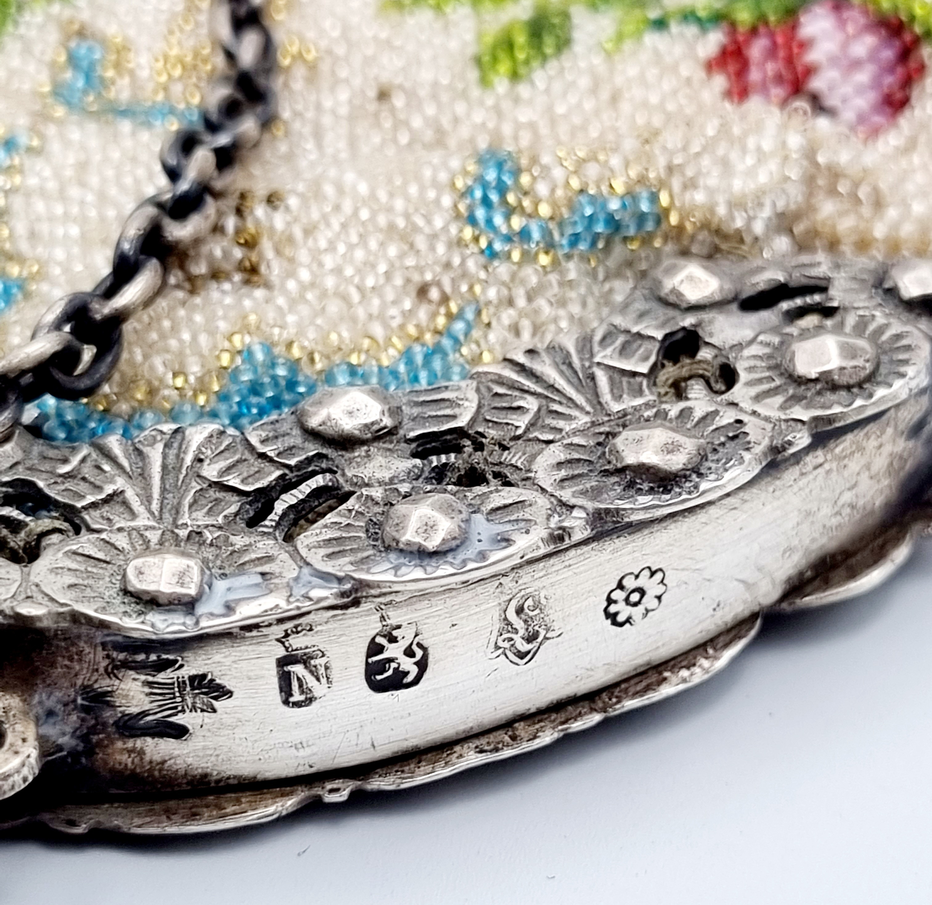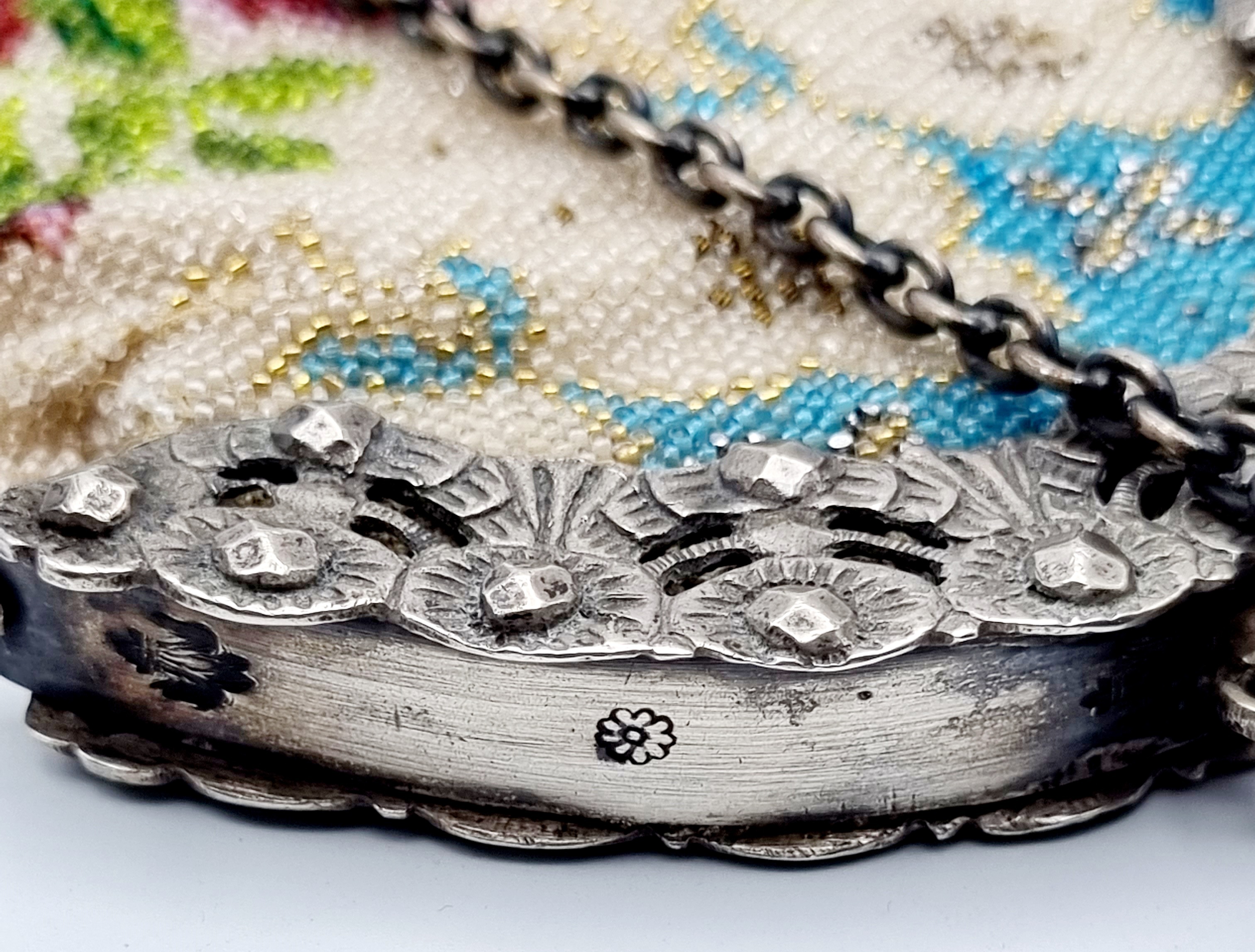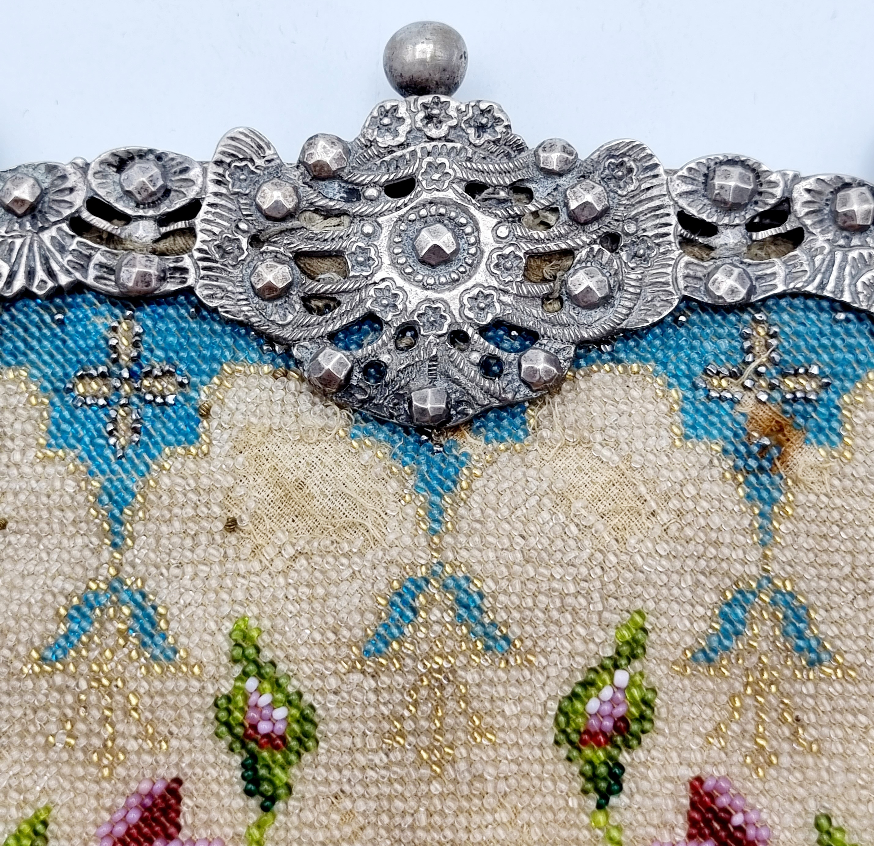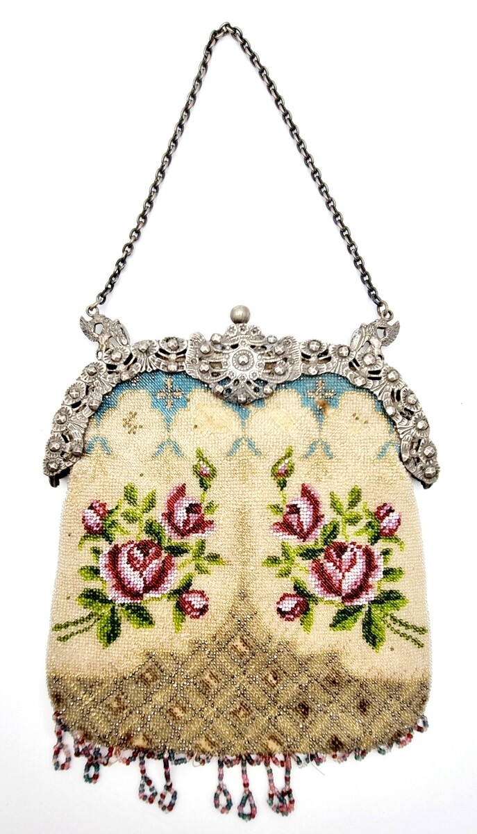 Tas met zilveren beugel, gemerkt met naar links staande leeuw, meesterkeur en een jaarletter. Kraaltjesbuidel met rozenmotief is gedateerd 1916 in de beugel. |