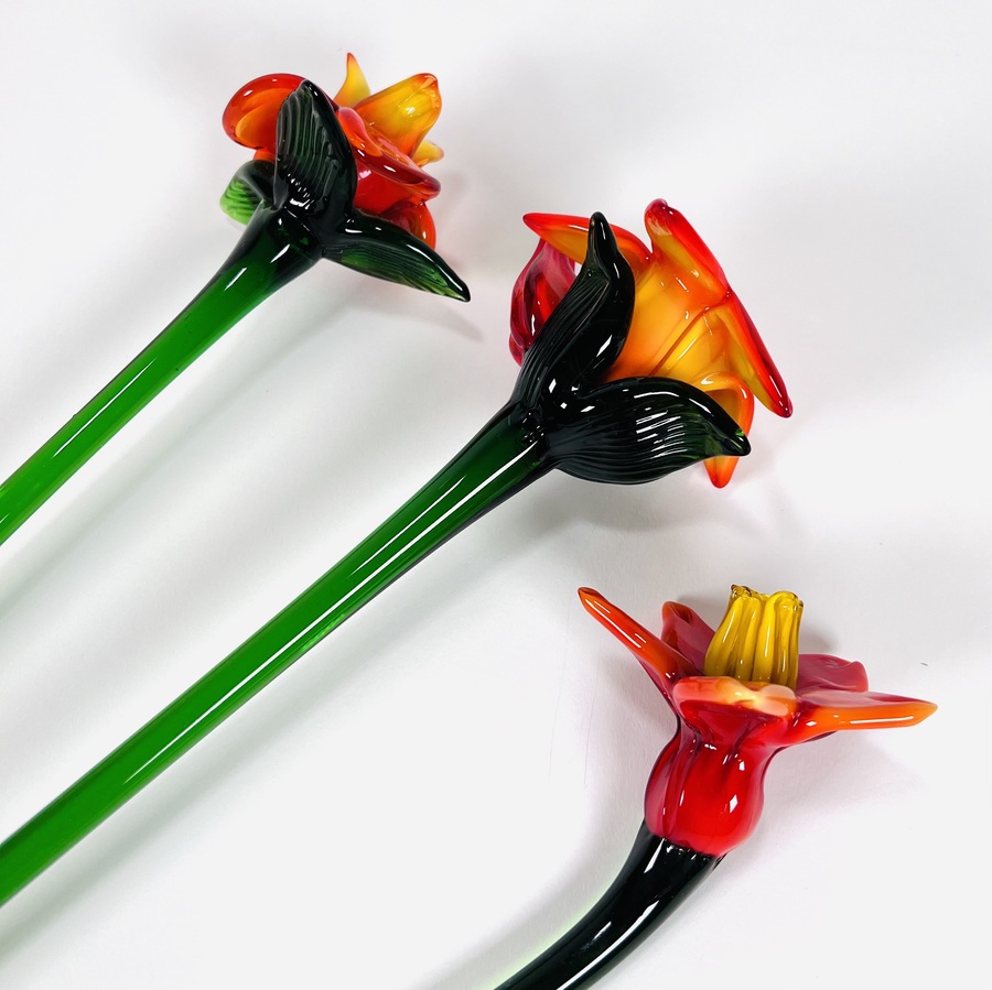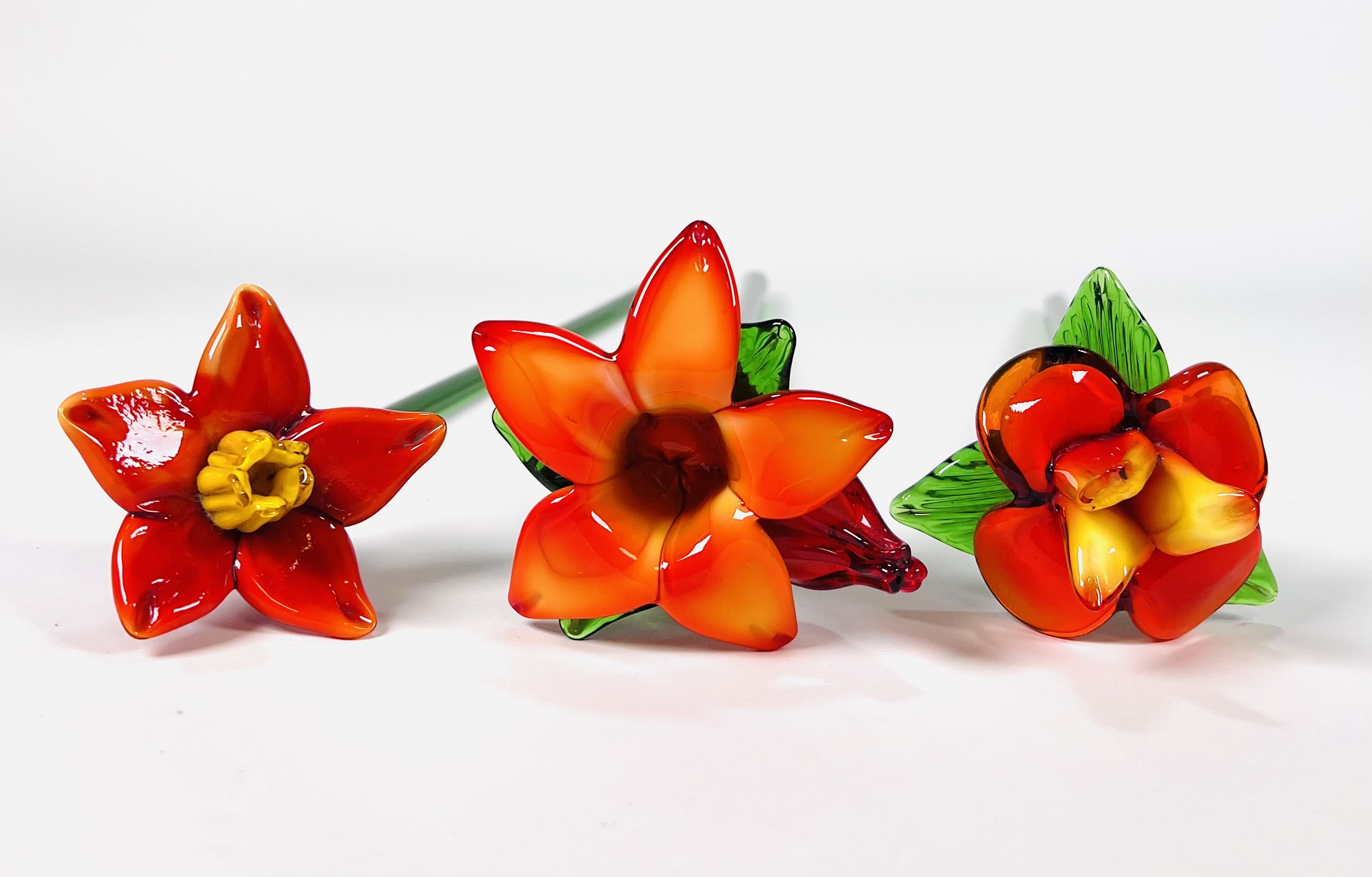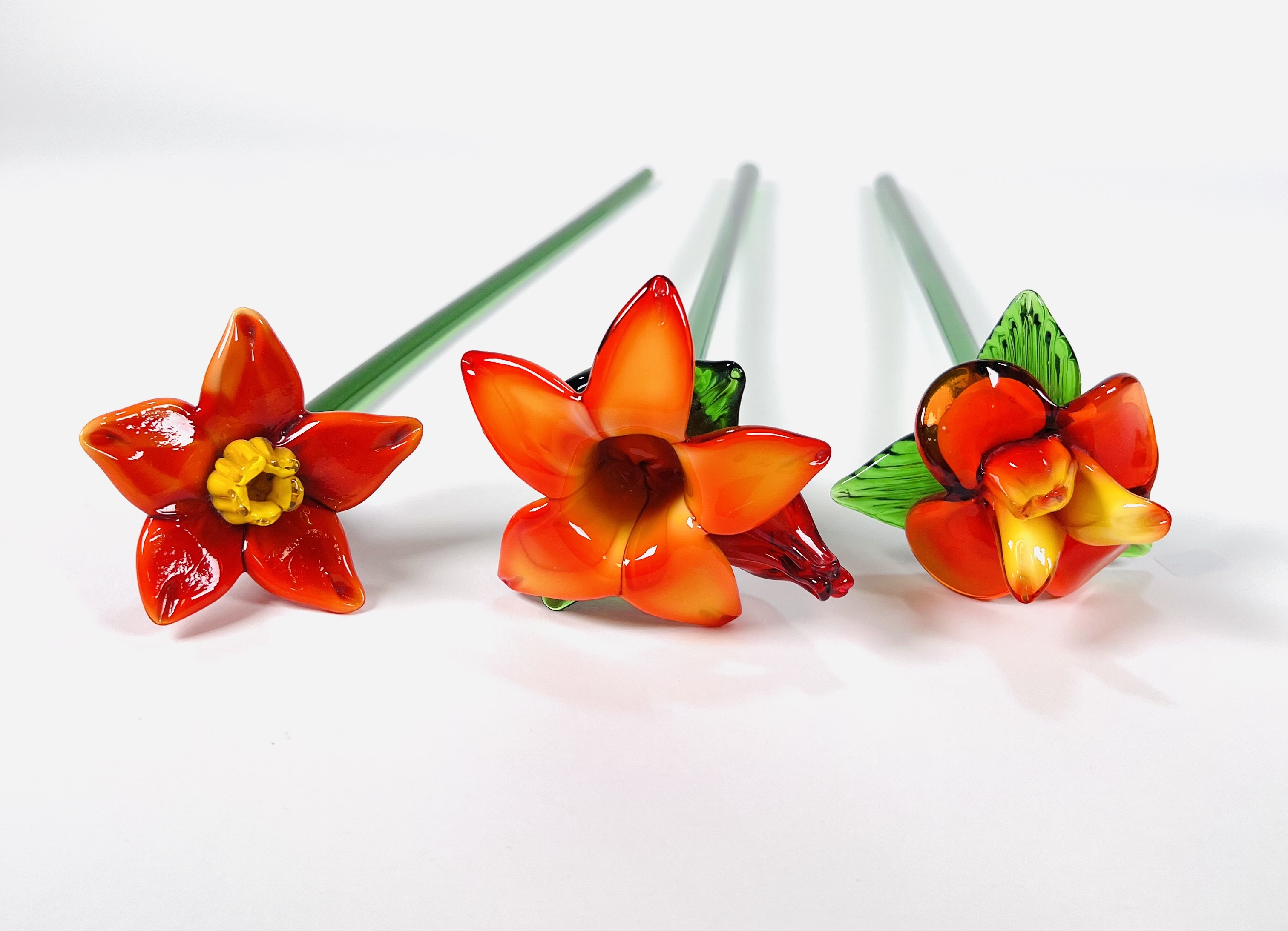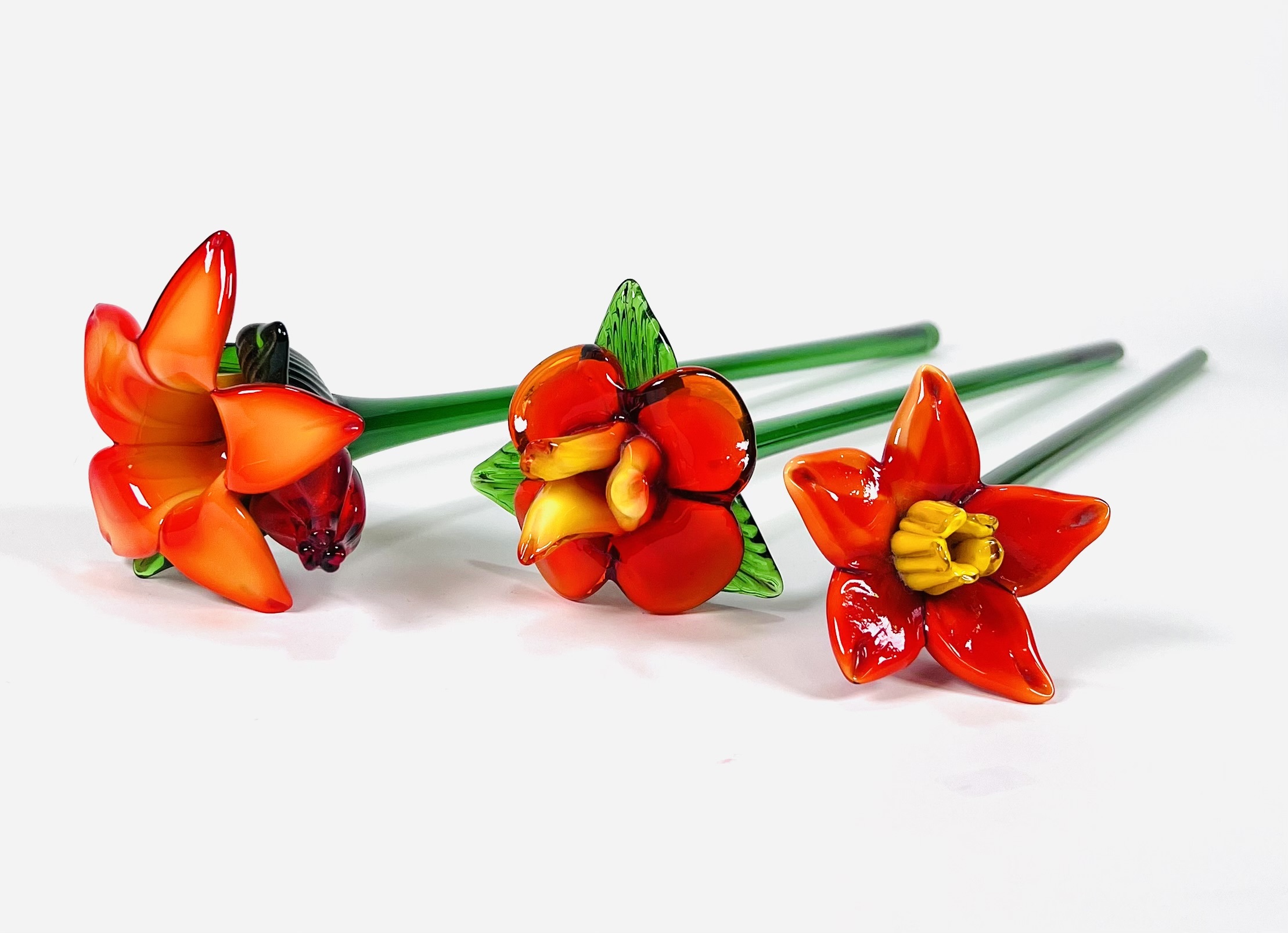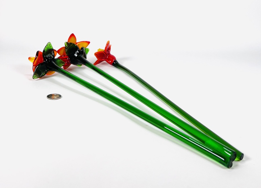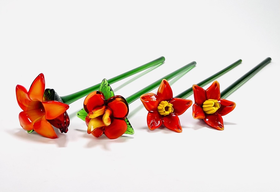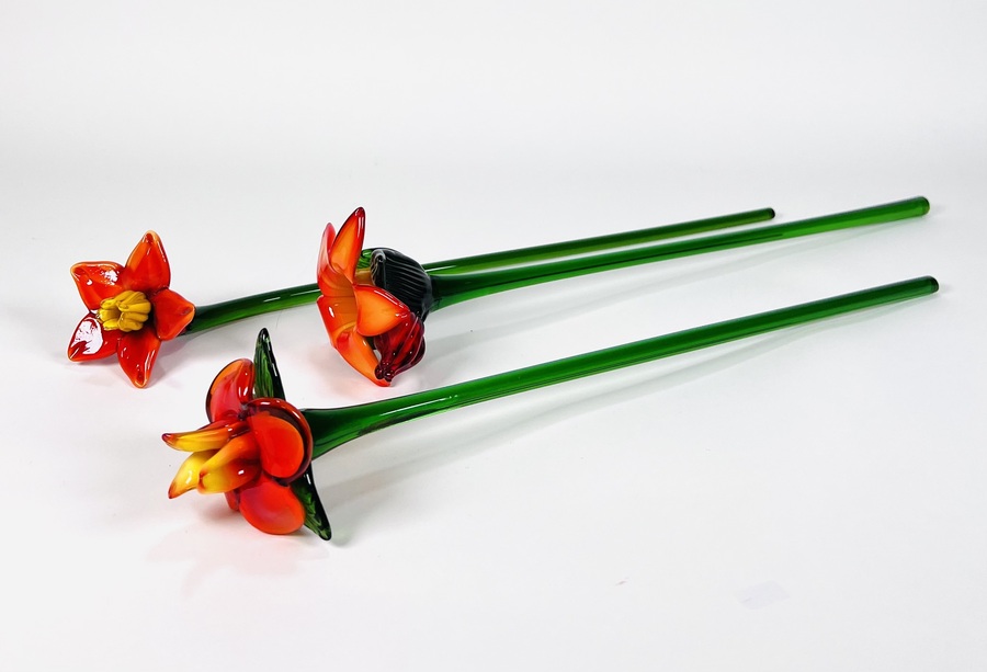 Vier ambachtelijk gevormde glazen narcissen met groene steel. Tsjechië, eind 20e eeuw. |