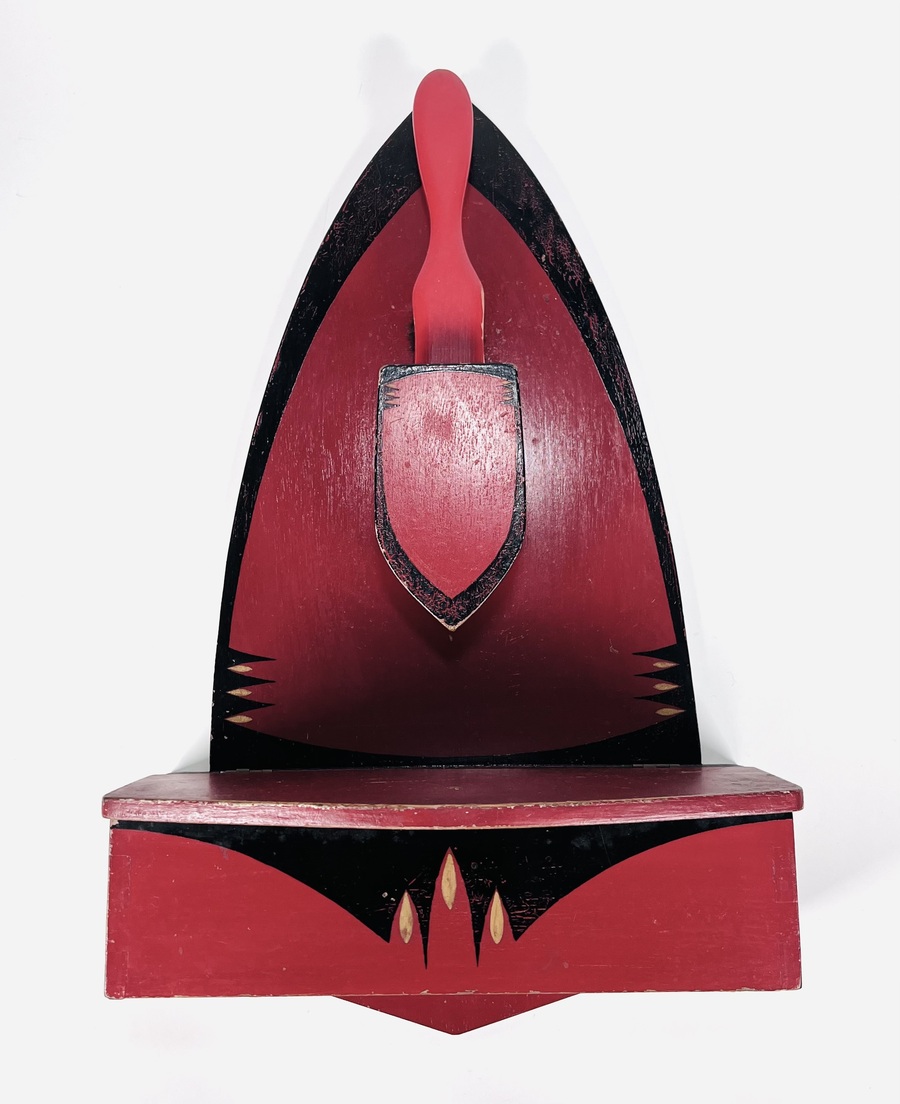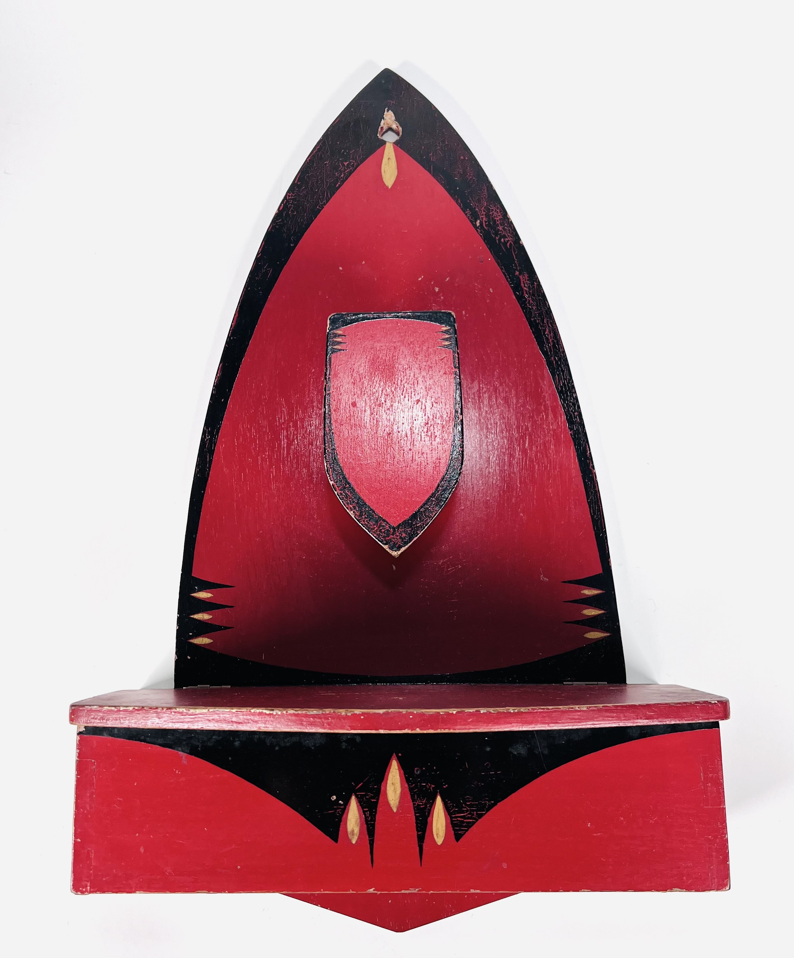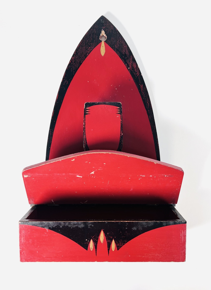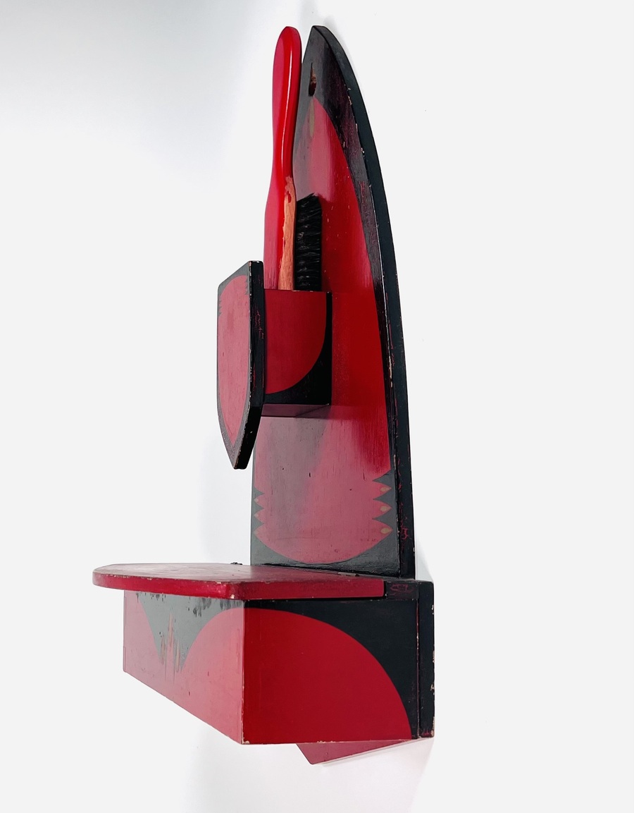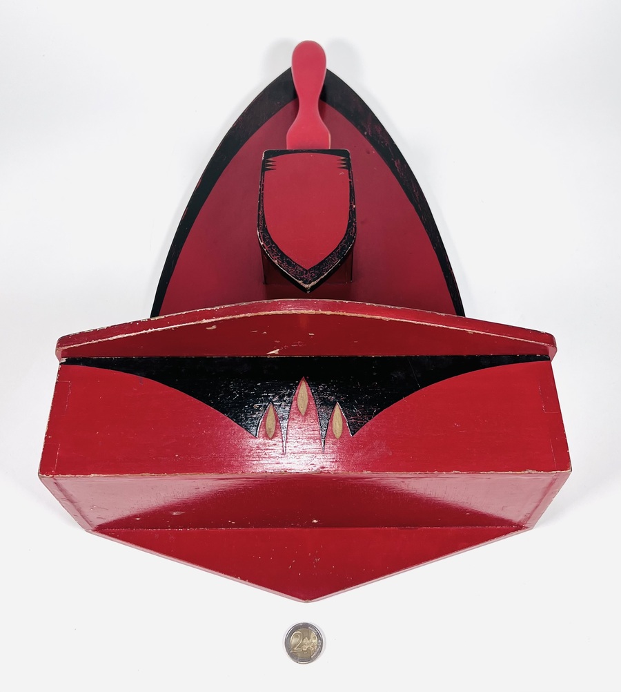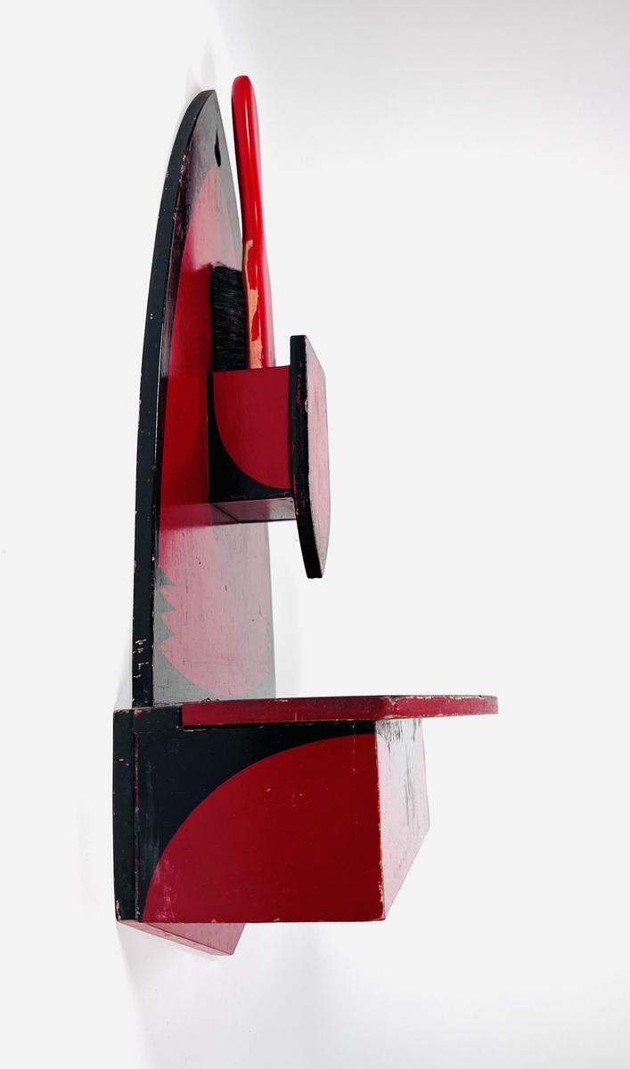 Amsterdamse School houten wandborstelhouder met kammenbak in donkerrood-zwarte kleurschakering met goudaccenten voorzien van tijd typische decoratie. Jaren 20/30. |