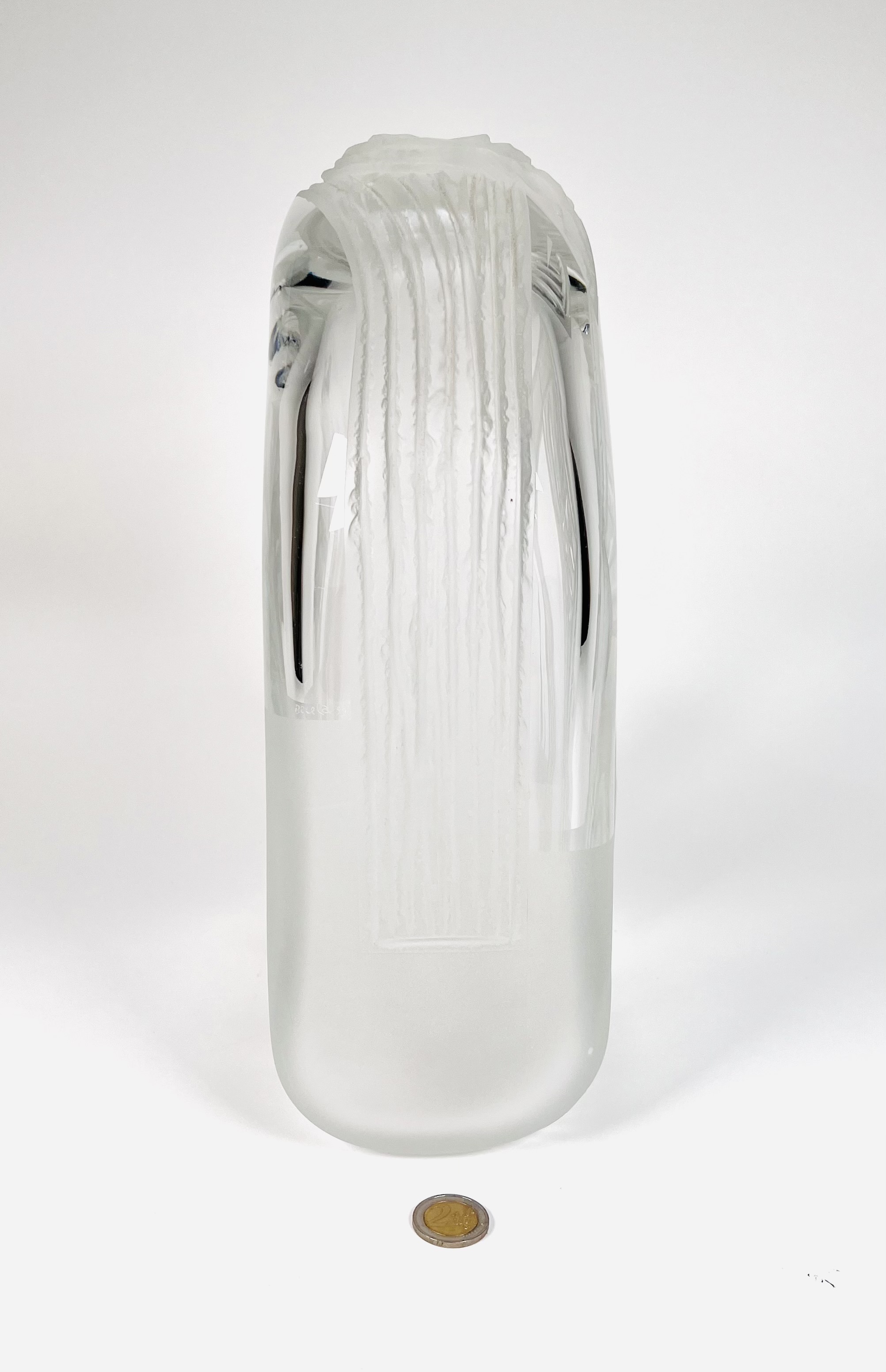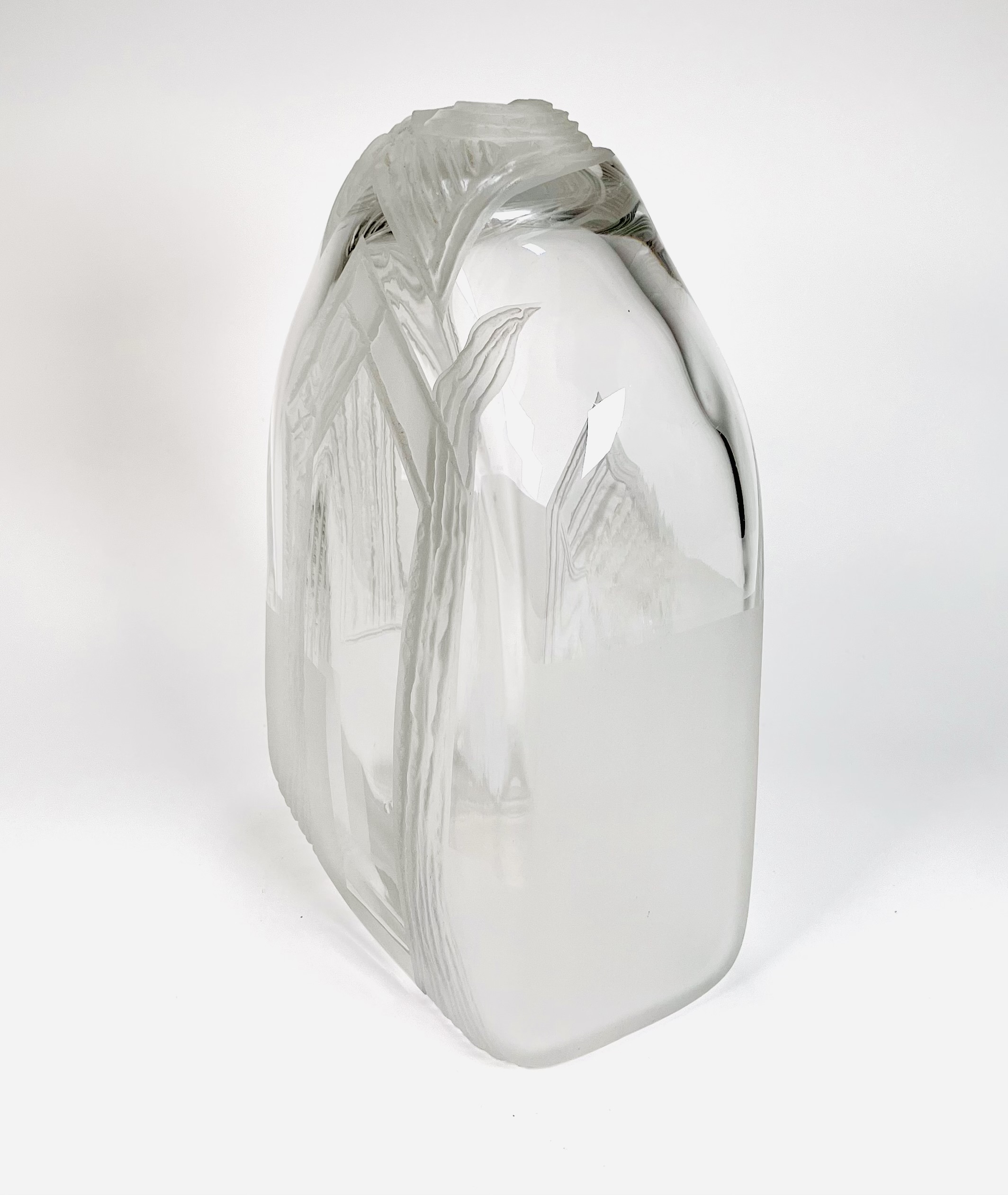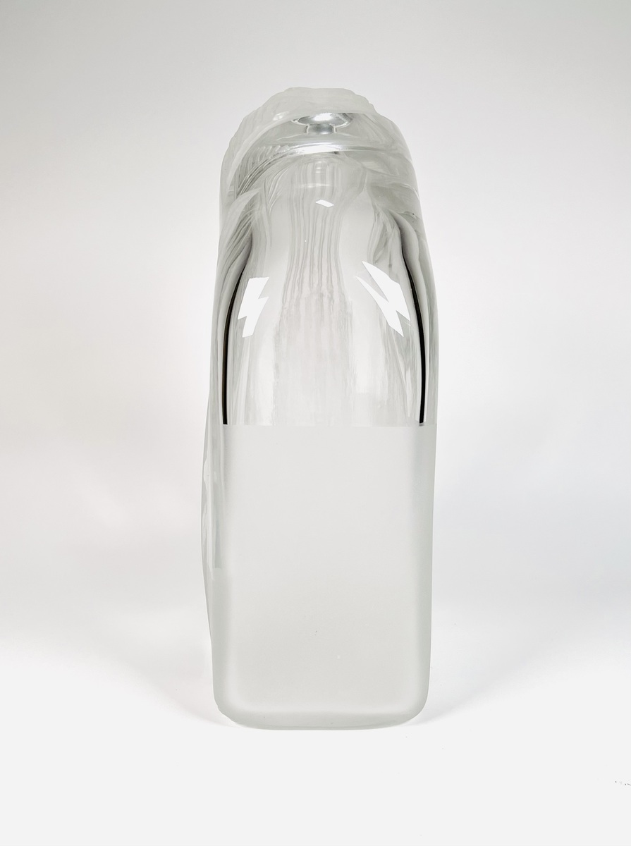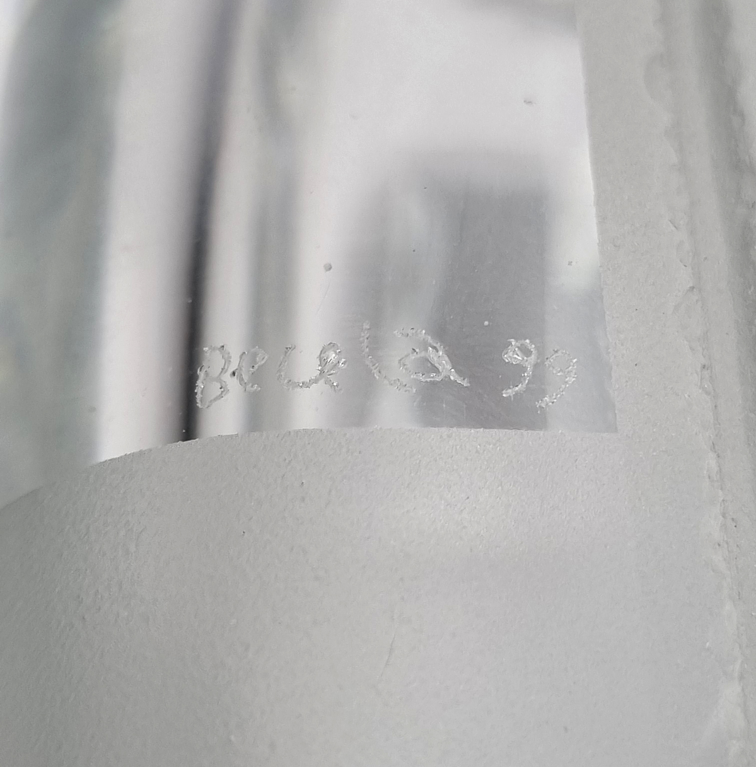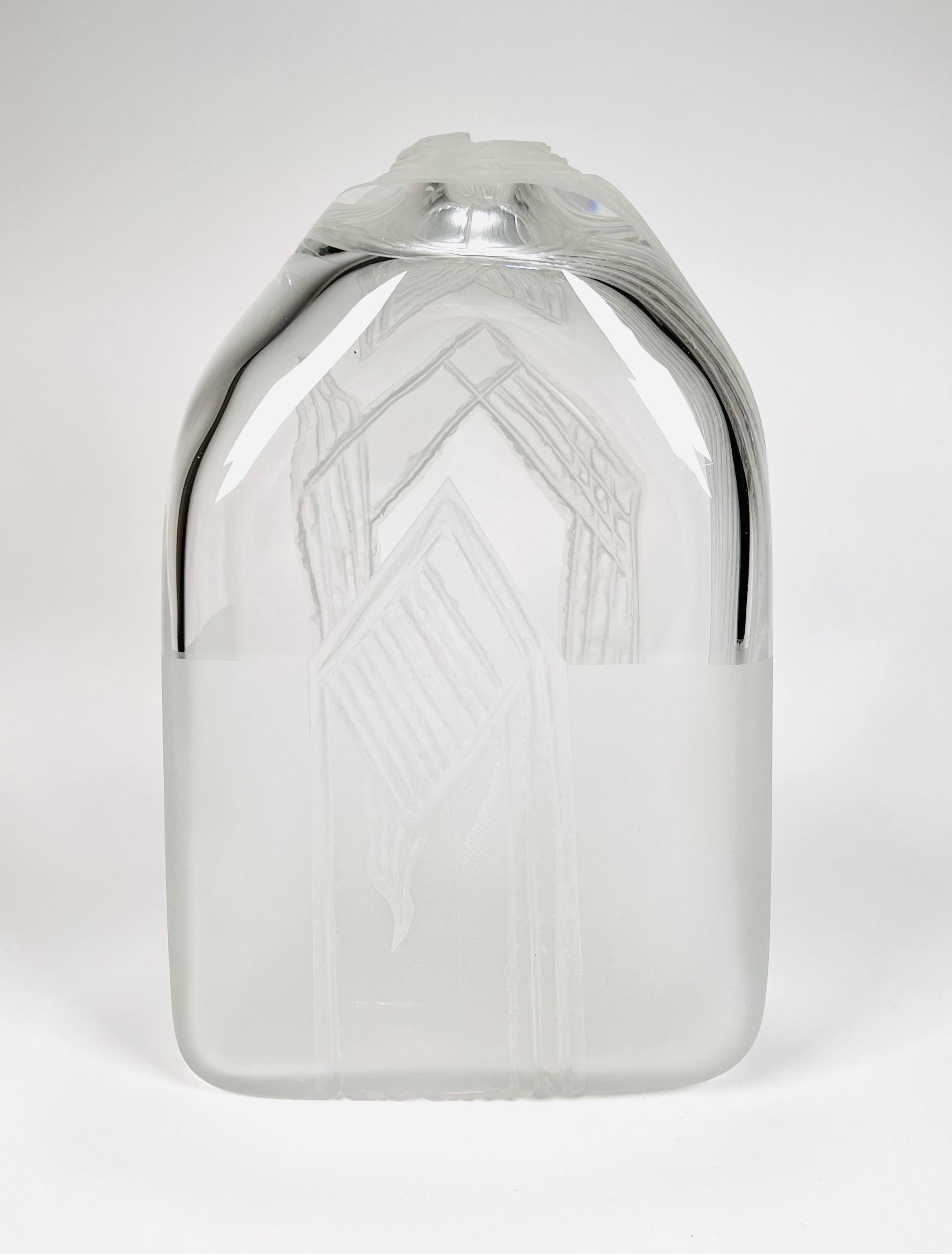 Glazen vaas voorzien van geslepen en gesatineerde abstracte voorstelling door de Poolse glaskunstenaar Jerzy Becela (1947). Betreft een groot formaat vaas, gesigneerd en gedateerd aan de zijkant van de vaas, Becela, 1999. |