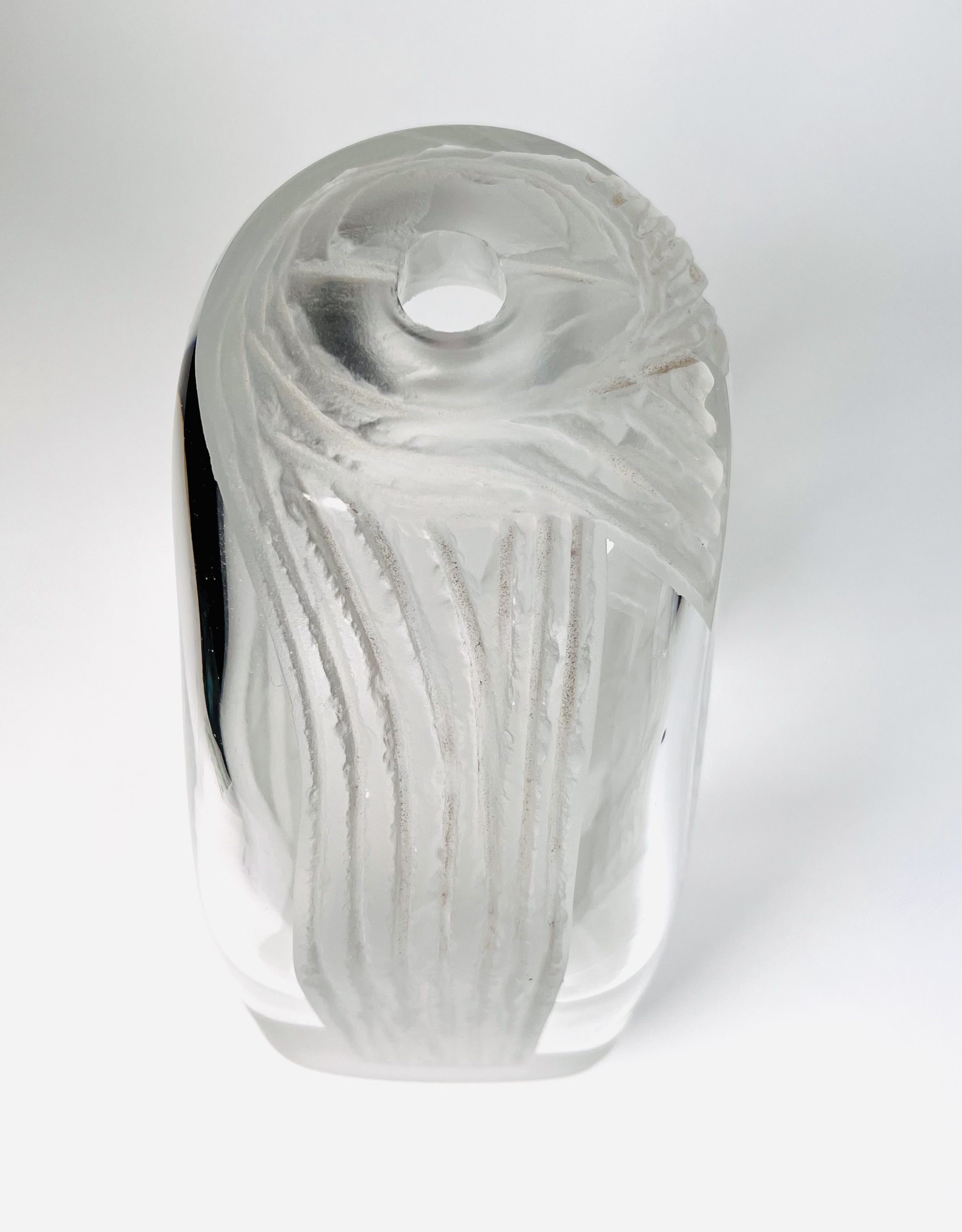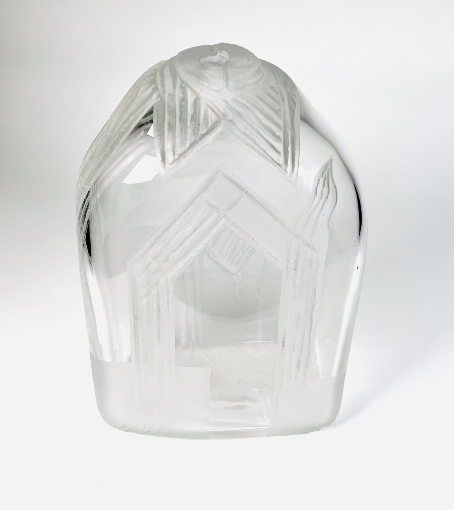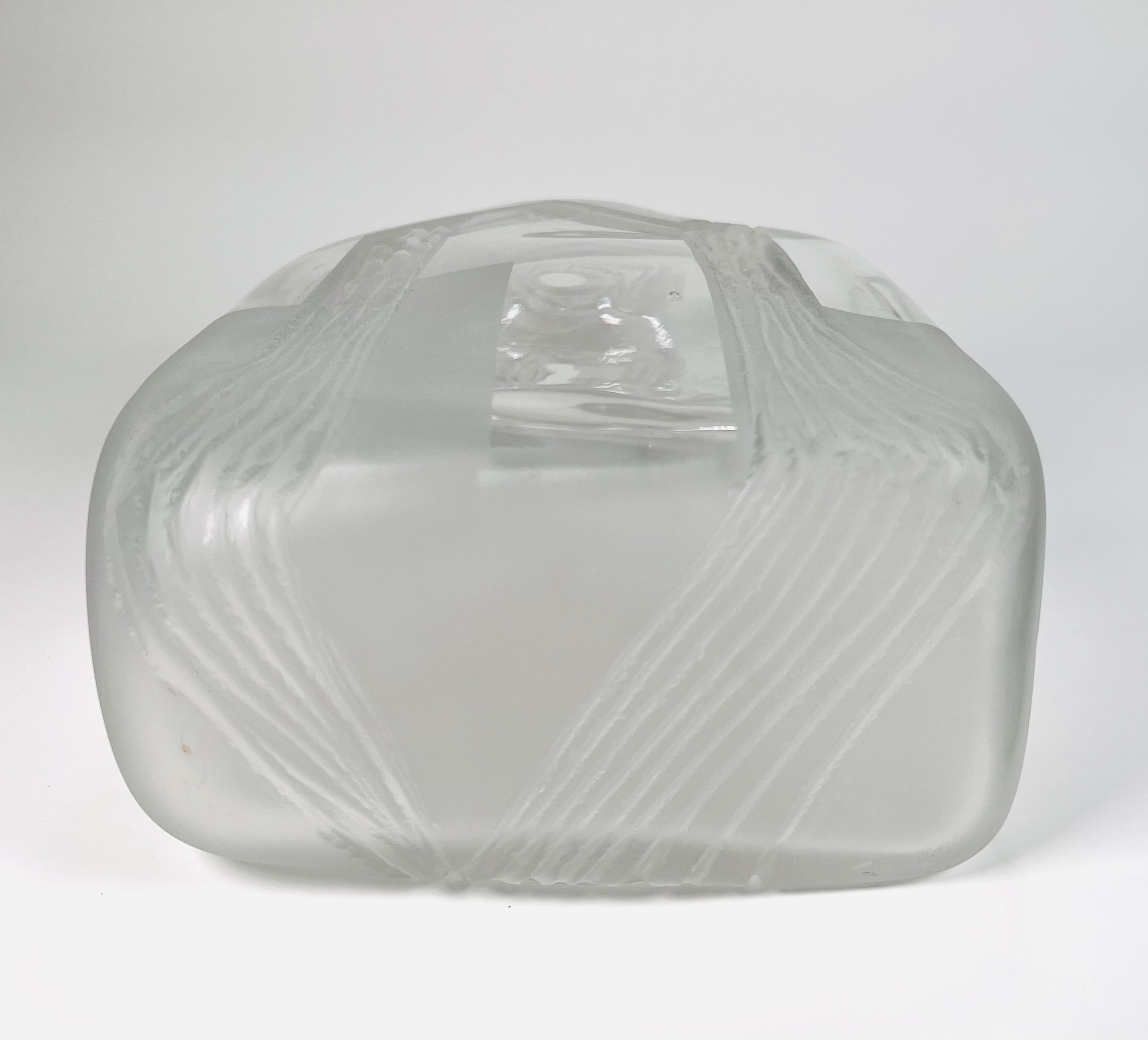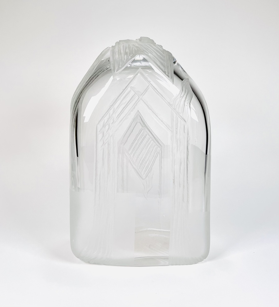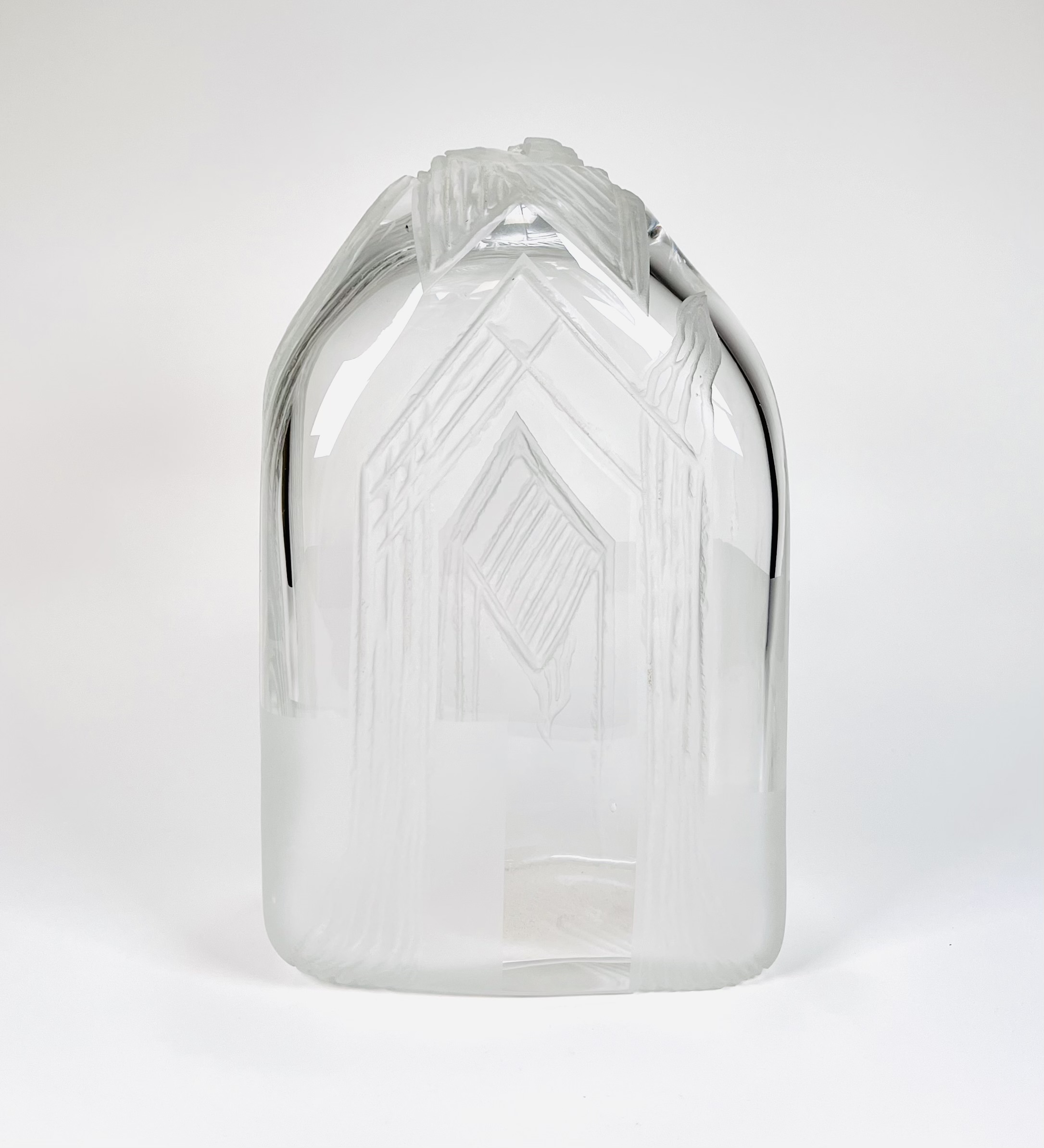 Glazen vaas voorzien van geslepen en gesatineerde abstracte voorstelling door de Poolse glaskunstenaar Jerzy Becela (1947). Betreft een groot formaat vaas, gesigneerd en gedateerd aan de zijkant van de vaas, Becela, 1999. |