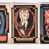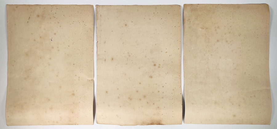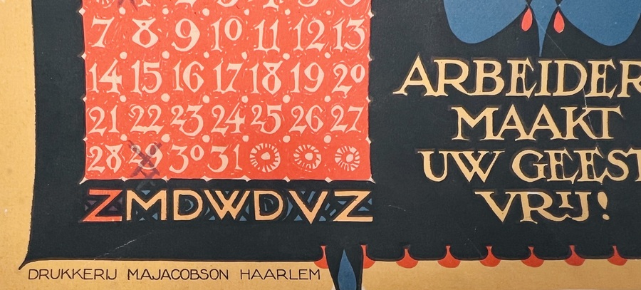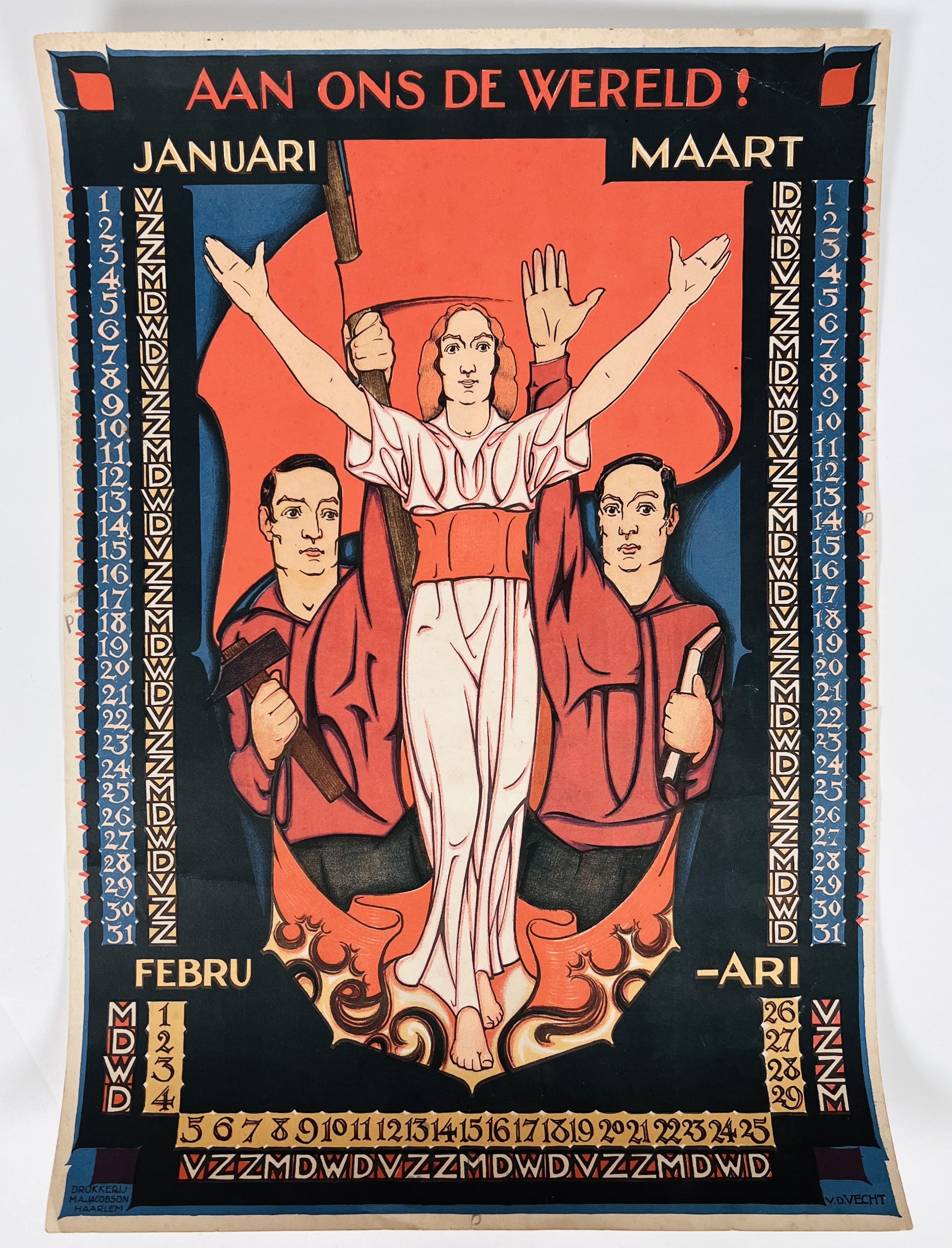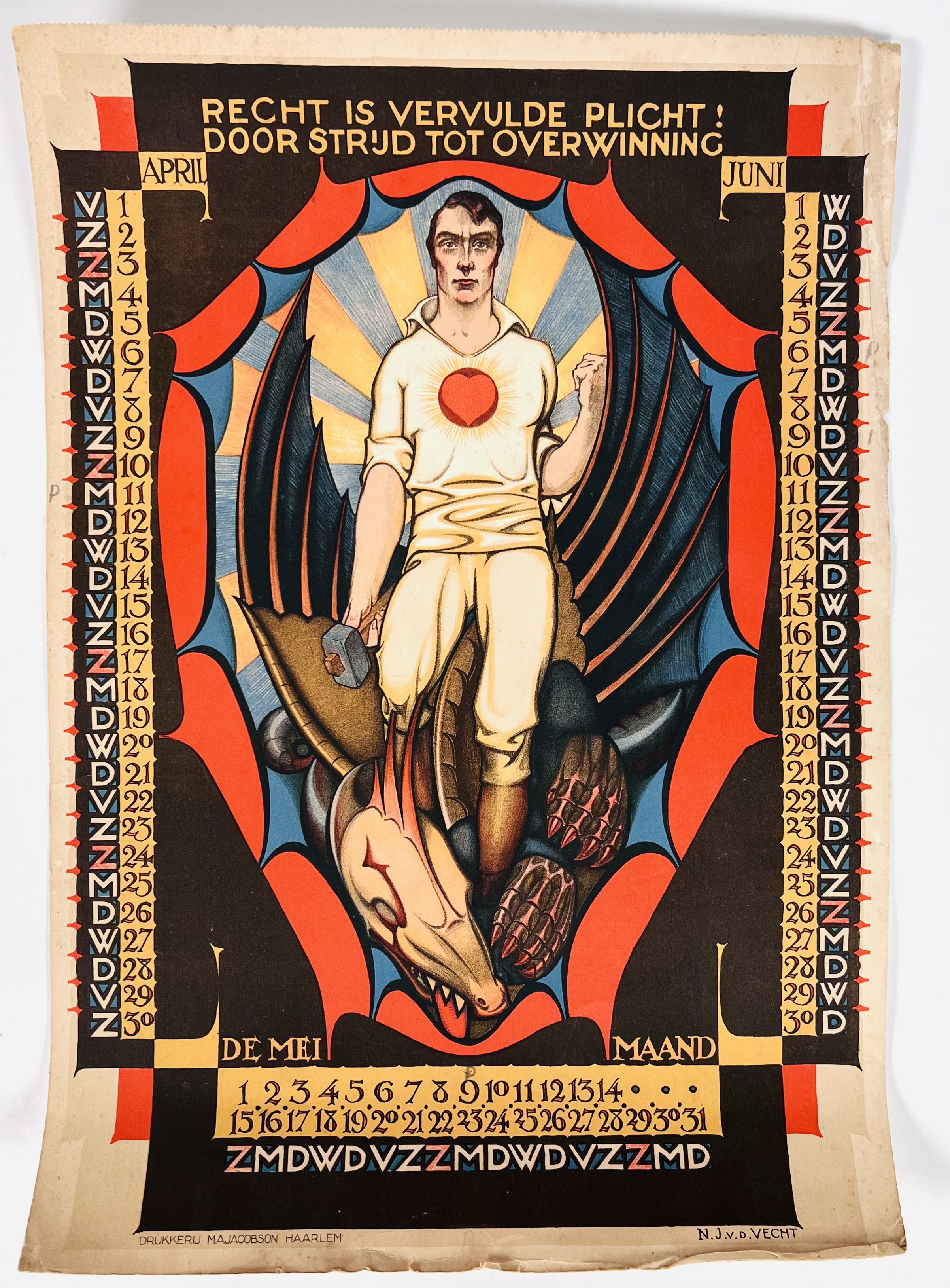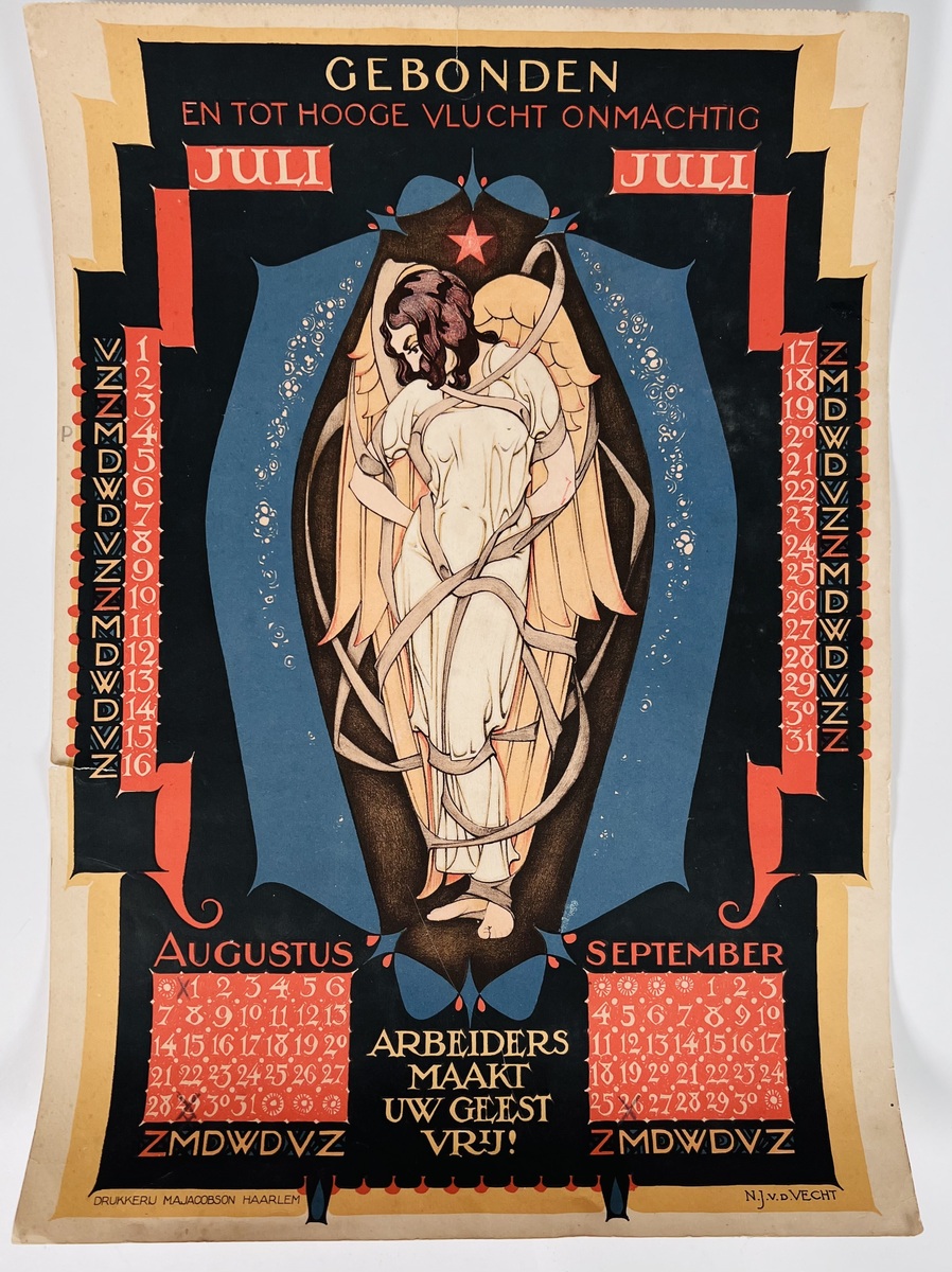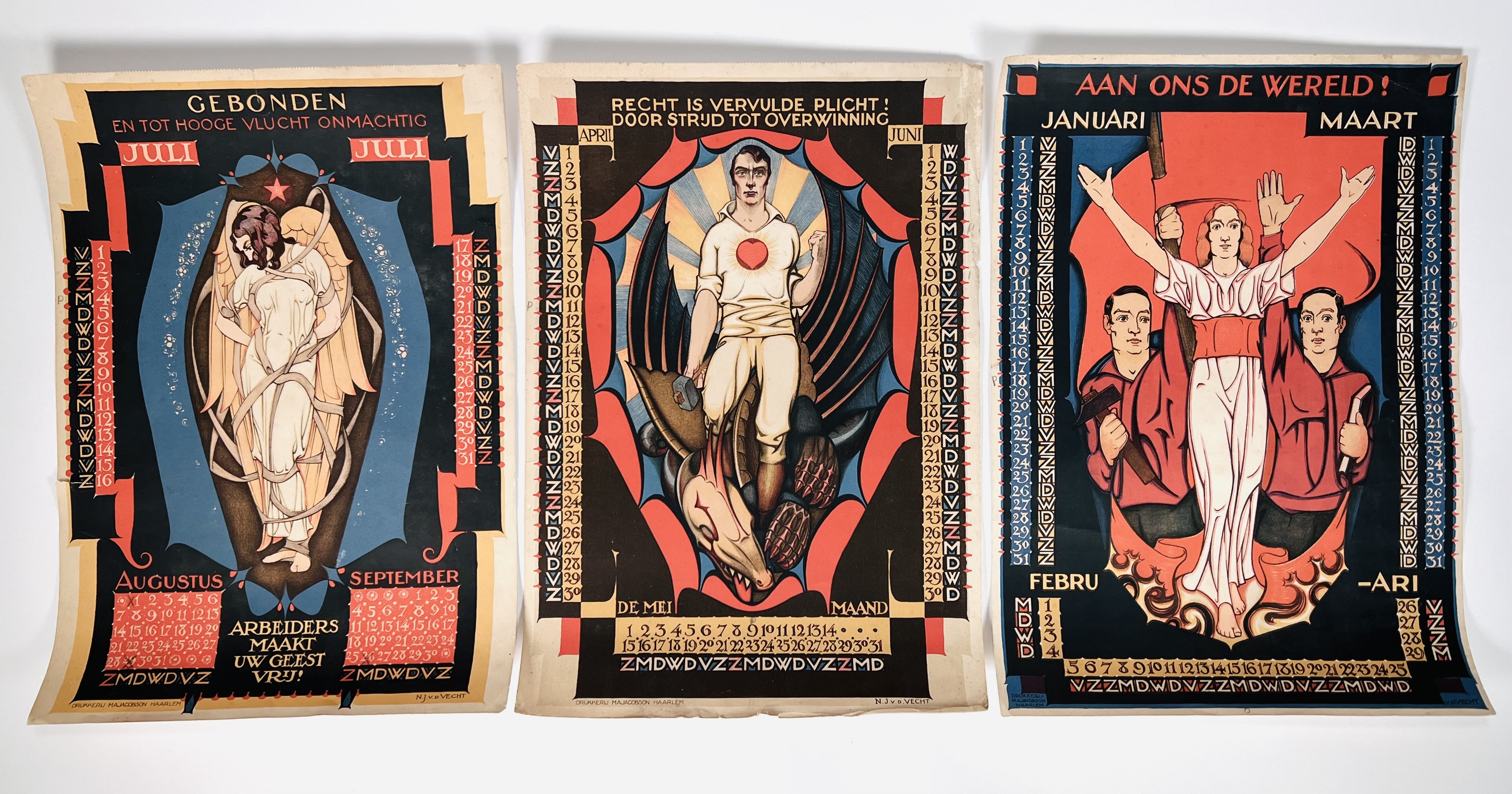Drie Jugendstil chromolithografieën kalenderplaten met illustraties van N.J. van der Vecht, drukkerij M.A. Jacobson, Haarlem. Maanden Januari-Maart ("Aan ons de wereld"), April-Juni ("Recht is vervulde plicht! Door strijd tot overwinning") en Jul-September ("Gebonden en tot hooge vlucht onmachtig"). Eerste kwart 20e eeuw. |