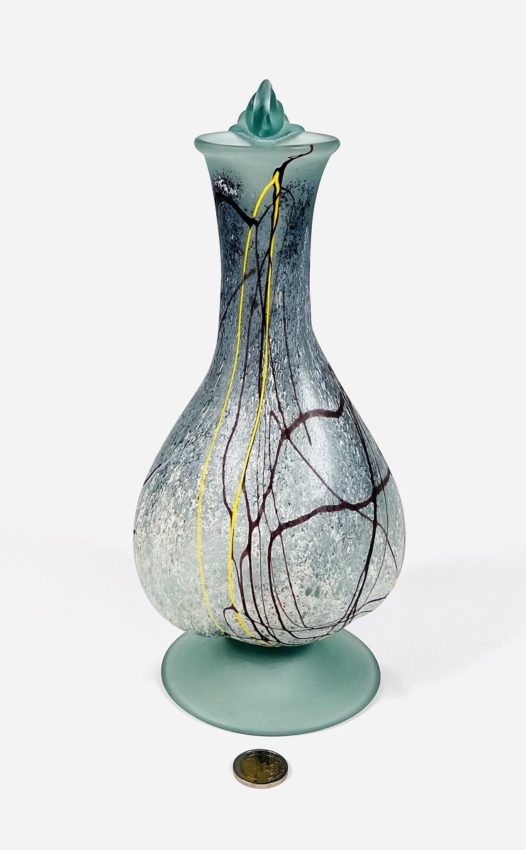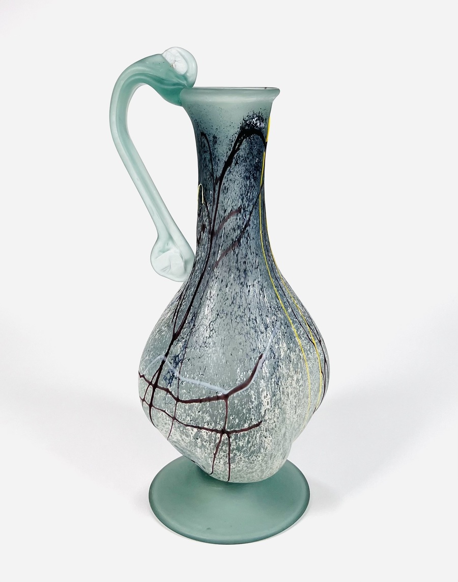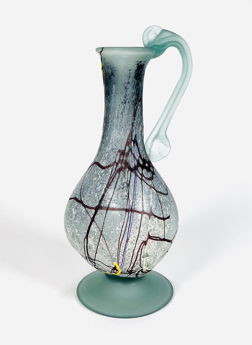 Gematteerd glazen vrij gevormde karaf met handvat door glaskunstenaar Semenescu. Geheel voorzien van glasdraden in meerdere kleuren. Roemenië, begin 21e eeuw. |