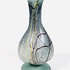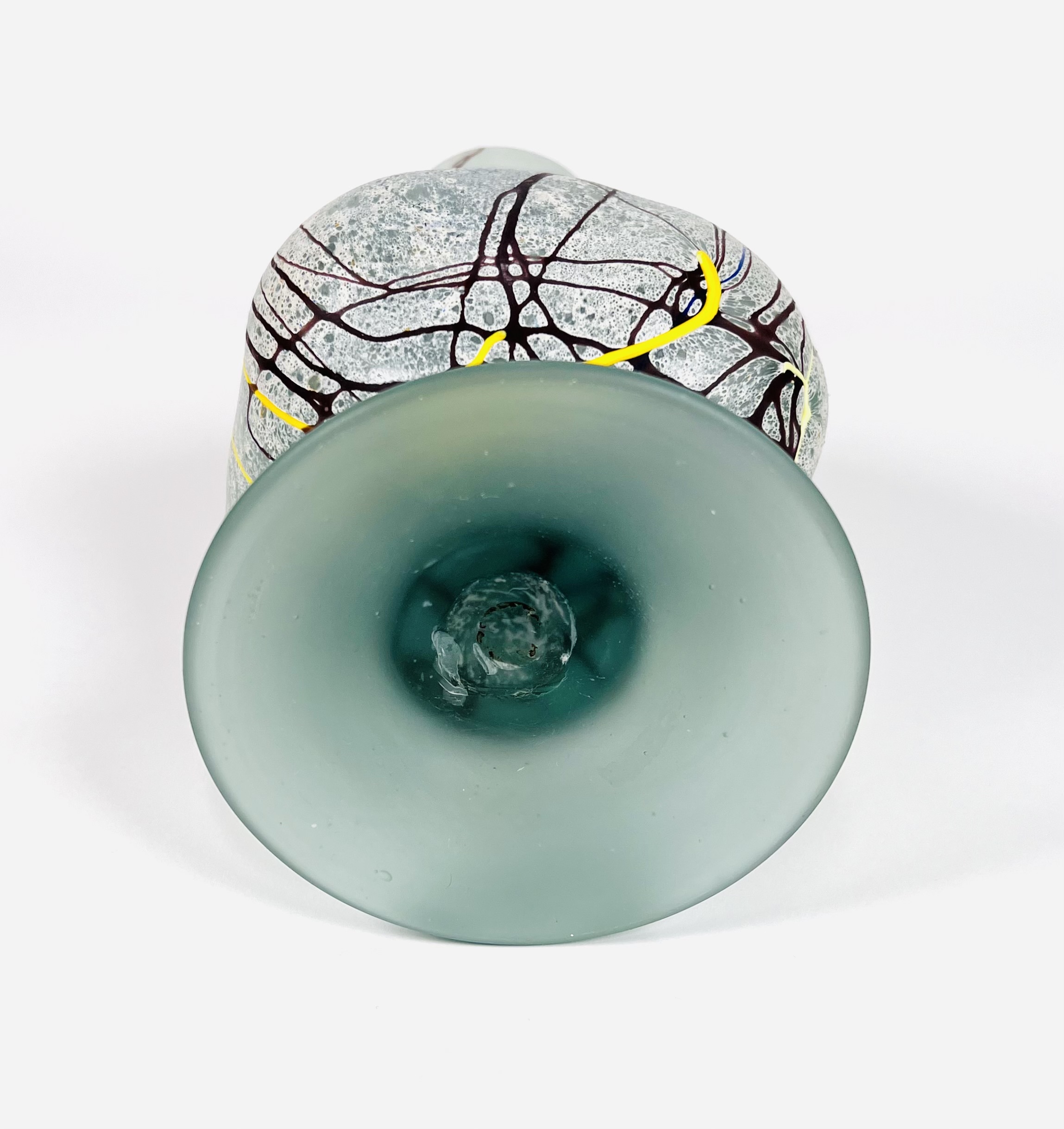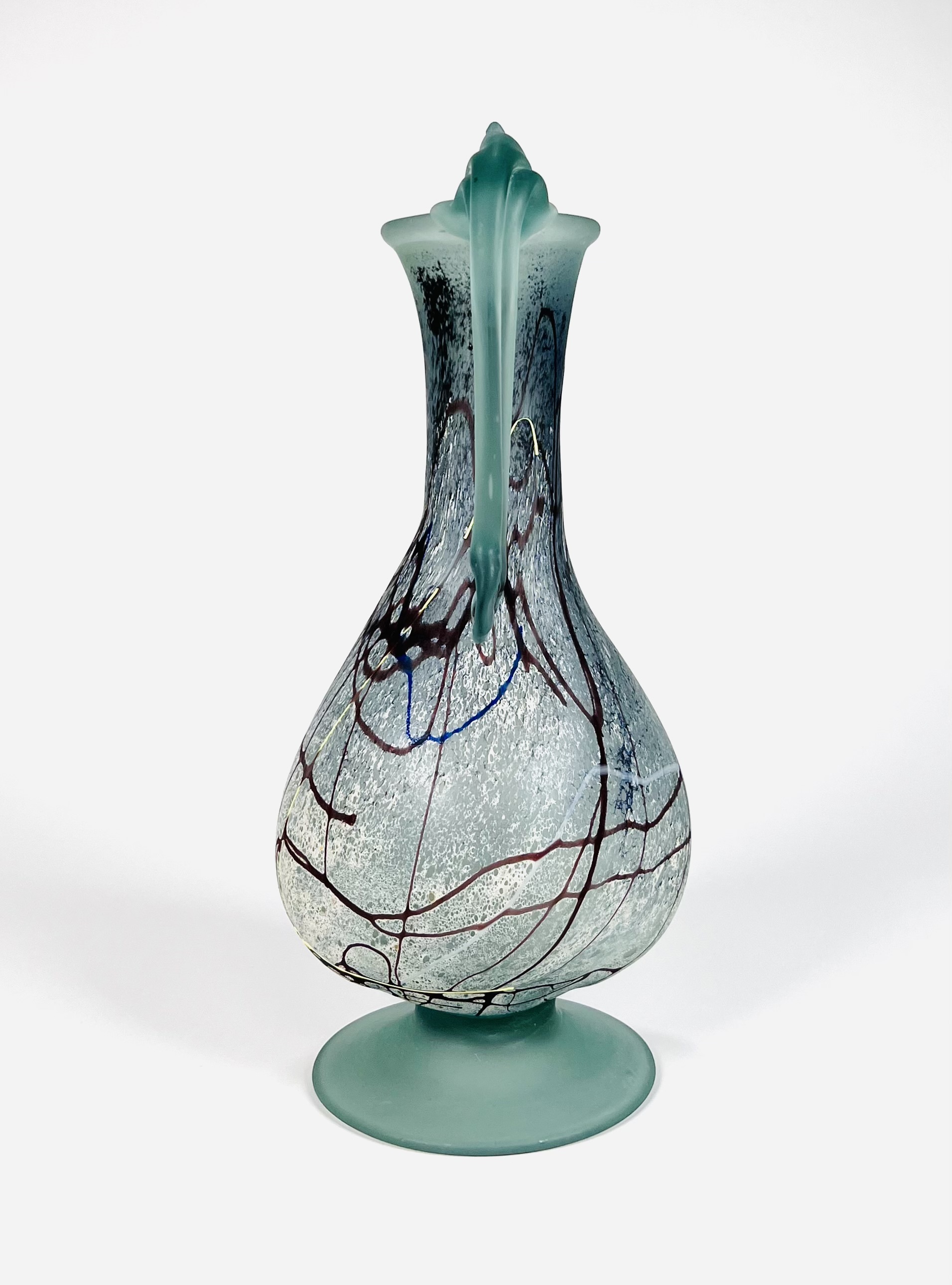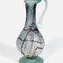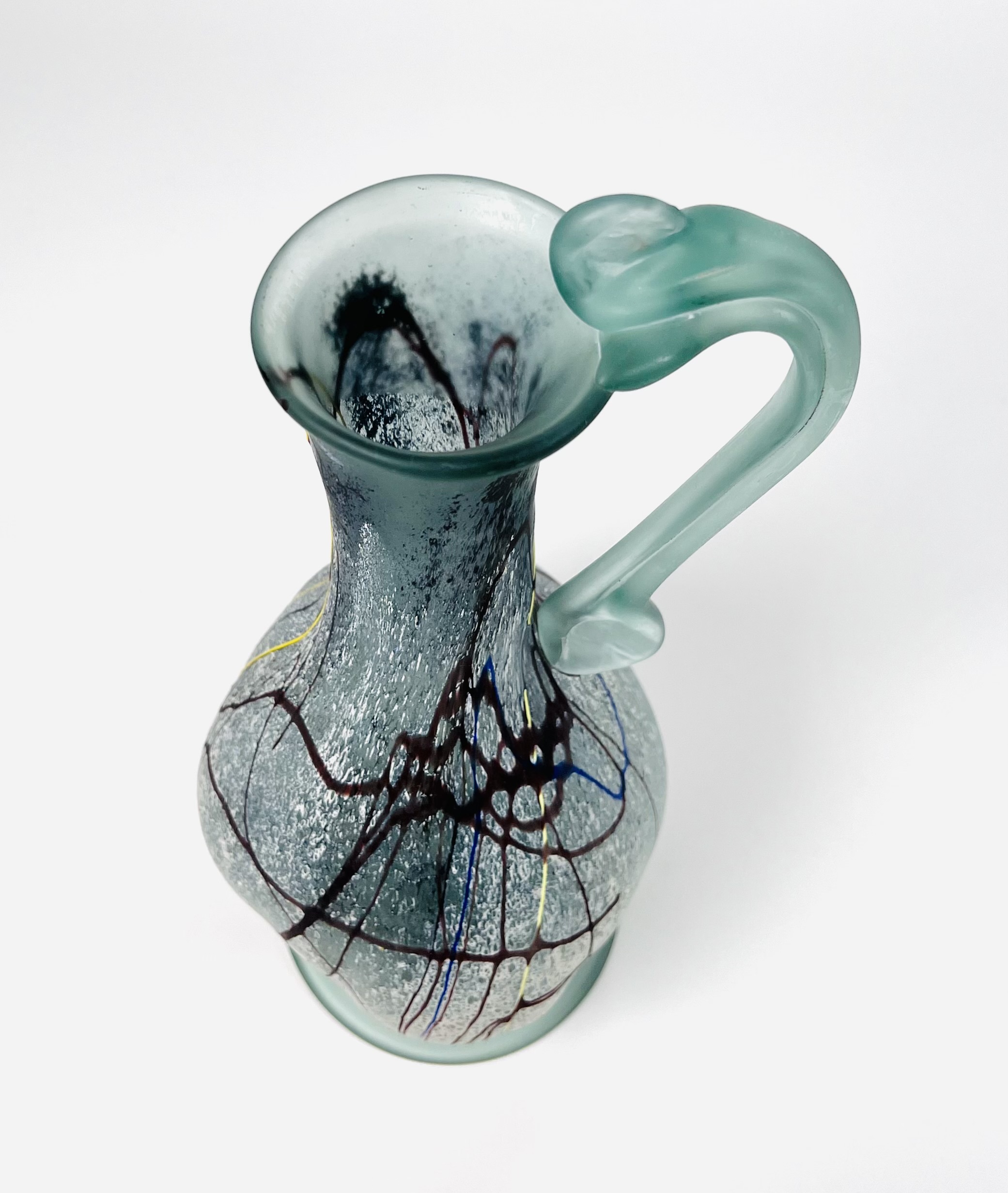 Gematteerd glazen vrij gevormde karaf met handvat door glaskunstenaar Semenescu. Geheel voorzien van glasdraden in meerdere kleuren. Roemenië, begin 21e eeuw. |