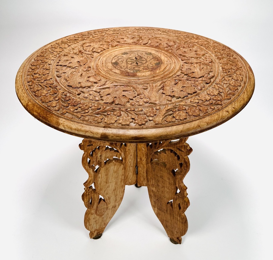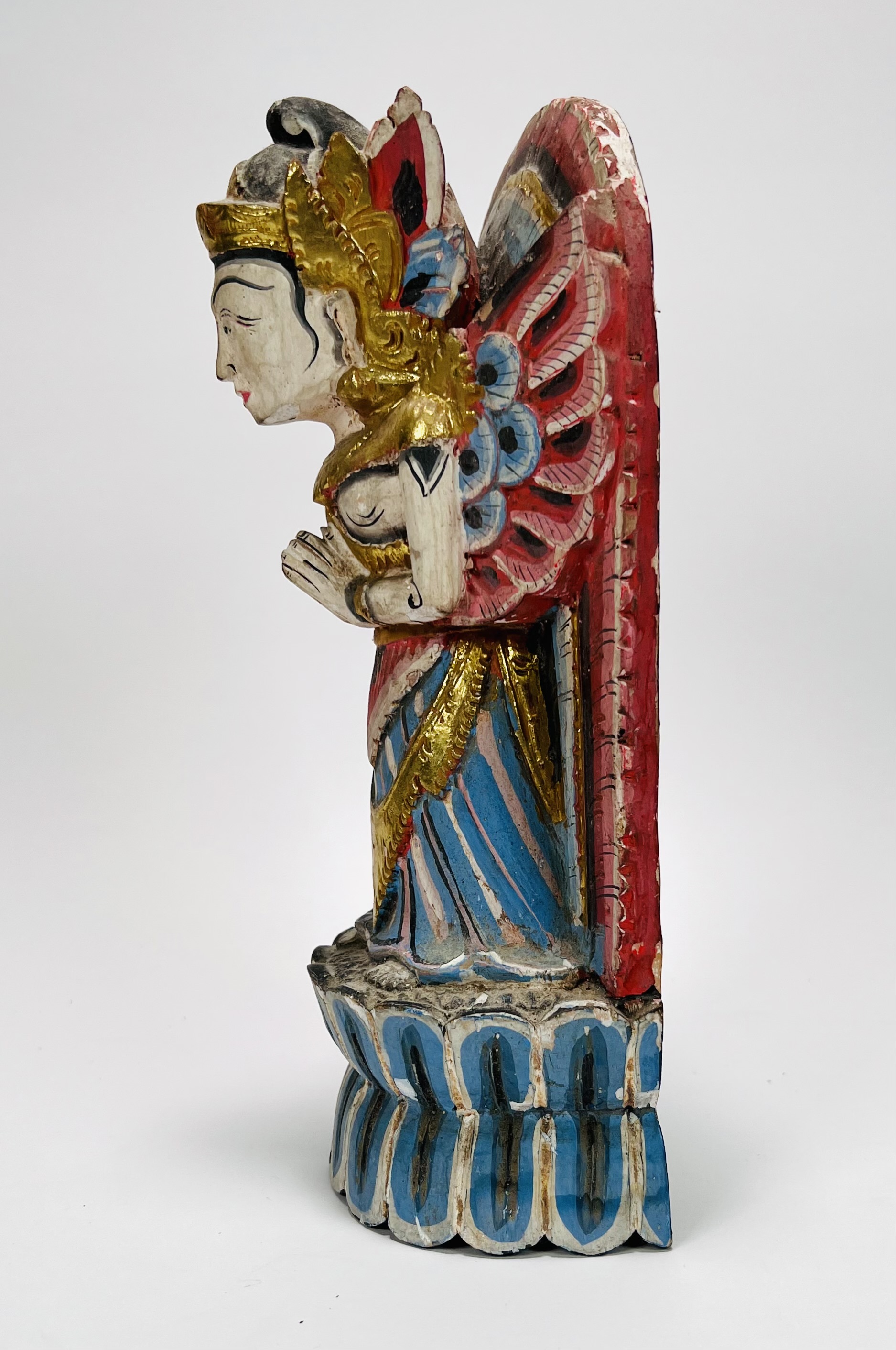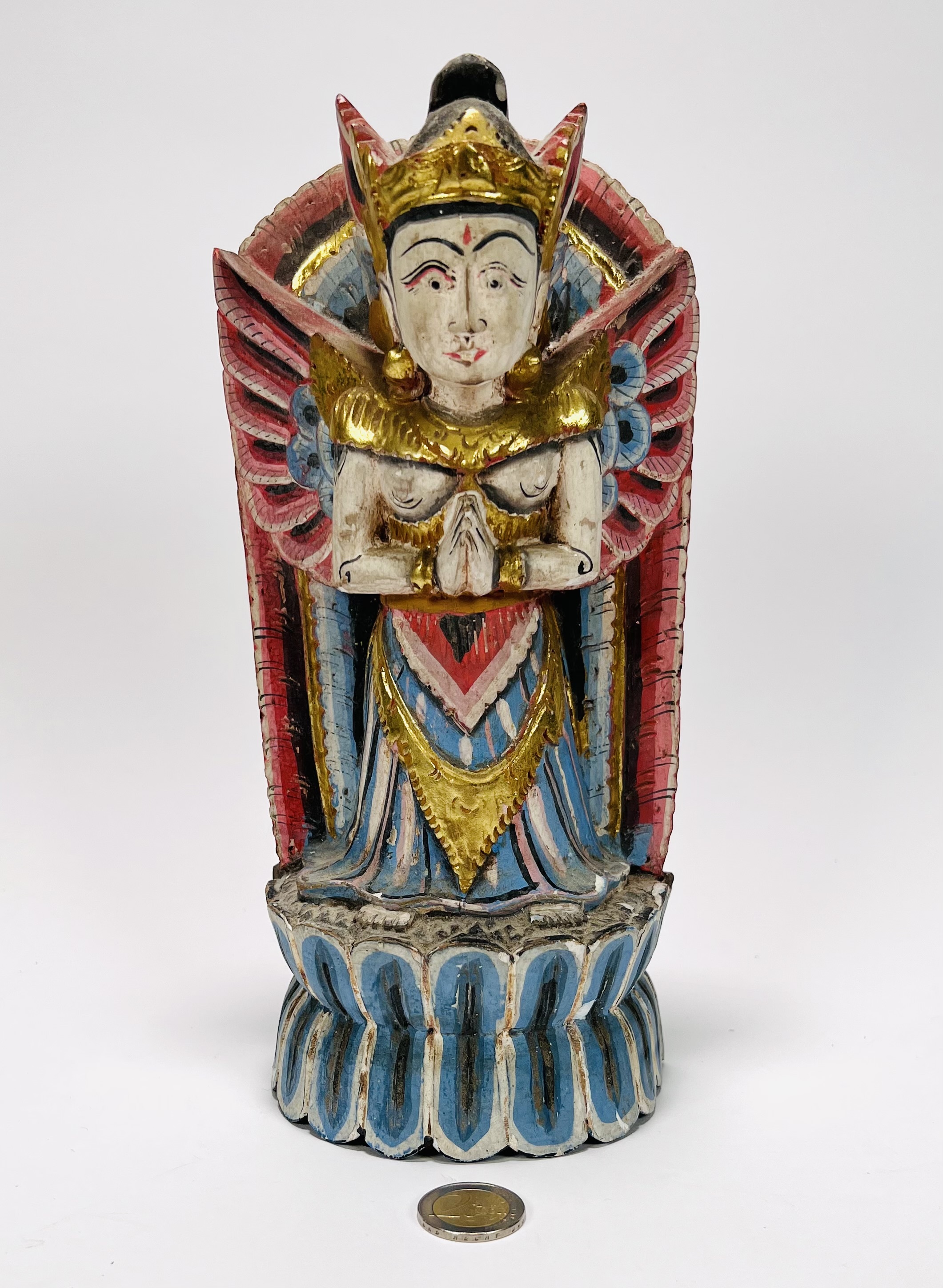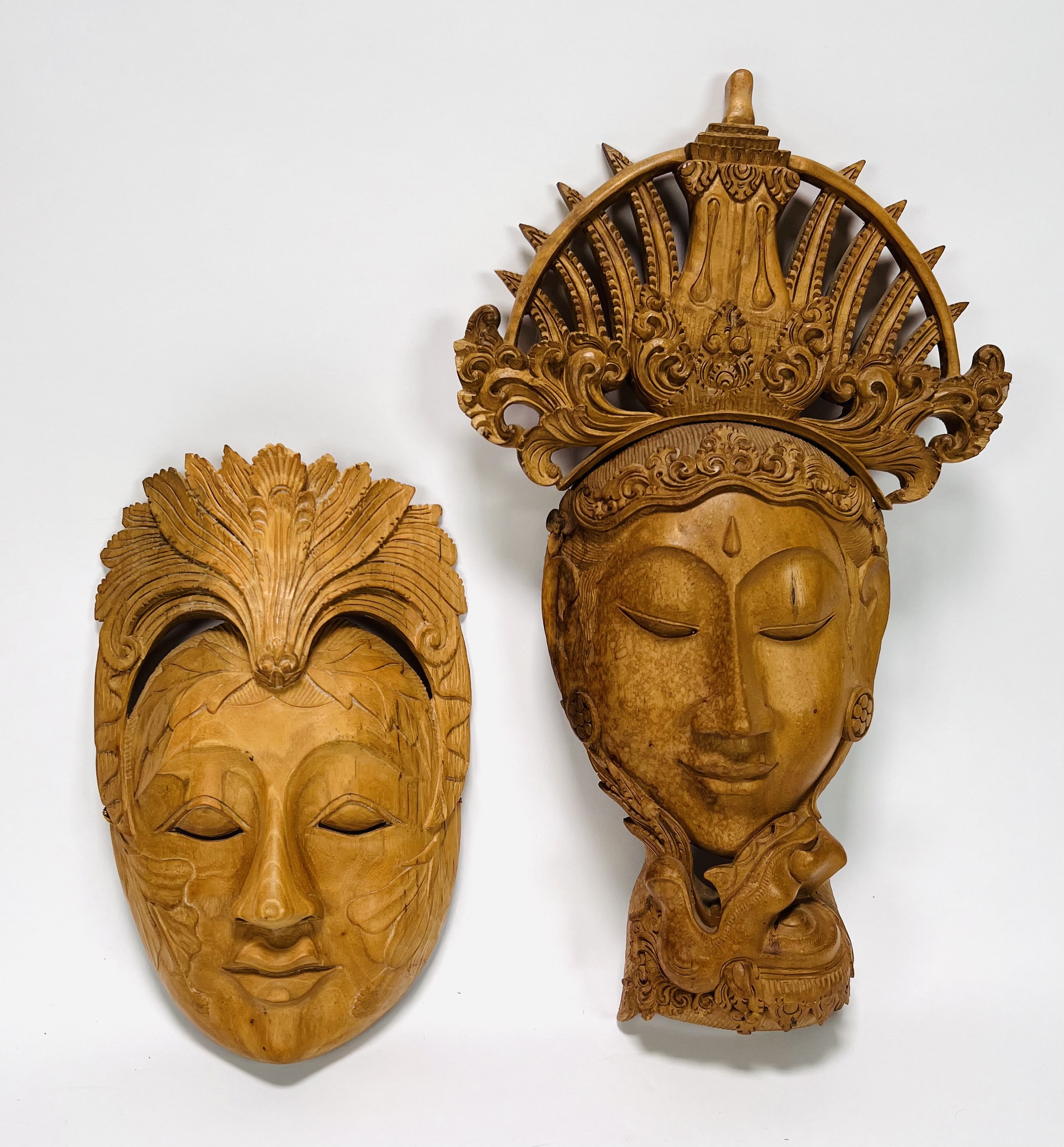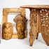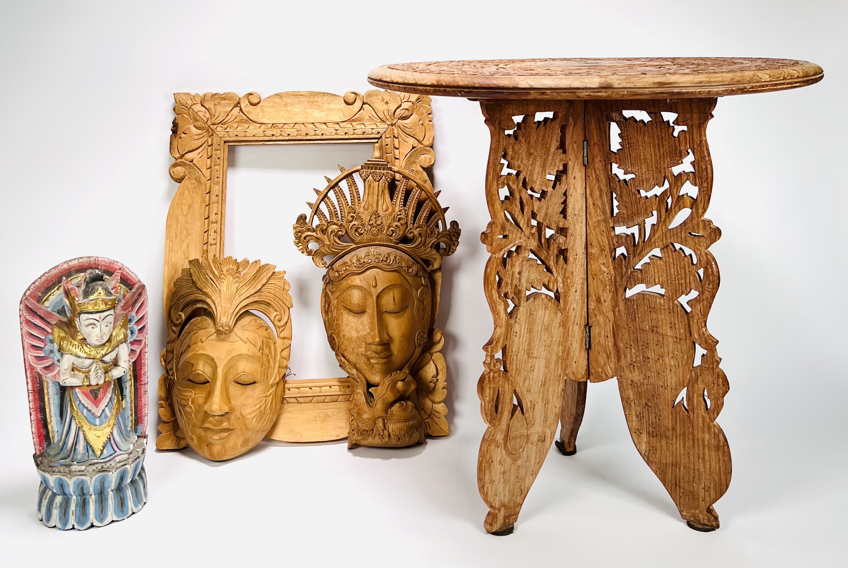 Lot houtsnijwerk met ondermeer twee Balinese wandmaskers, houten bijzettafel, houten lijst en een polychroom beschilderde beeld. 20/21e eeuw. |