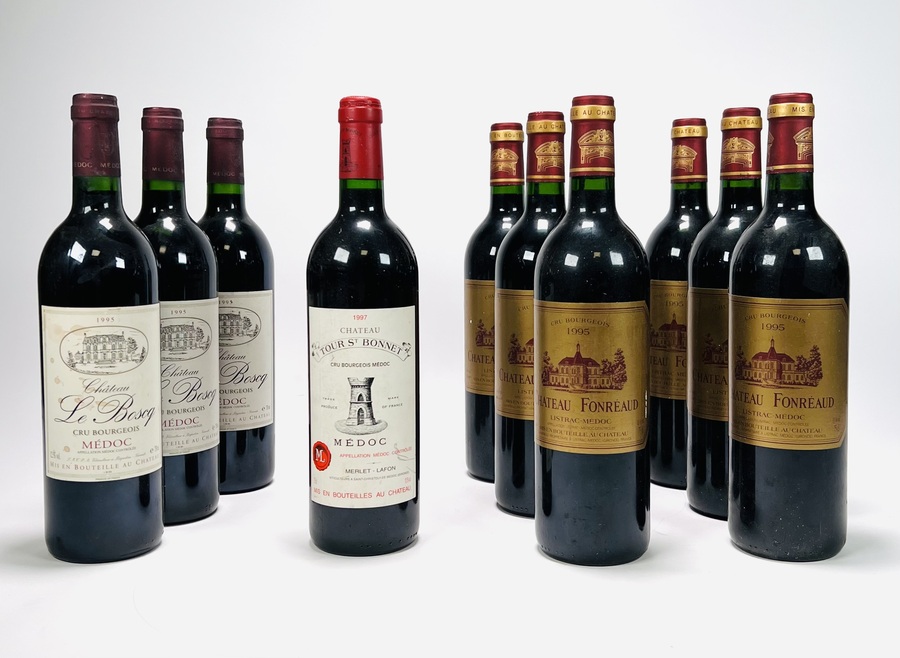 Tien flessen rode Medoc wijn waaronder Château Le Bosq uit 1995, Château Tour St. Bonnet 1997 en Château Fonréaud 1995. |