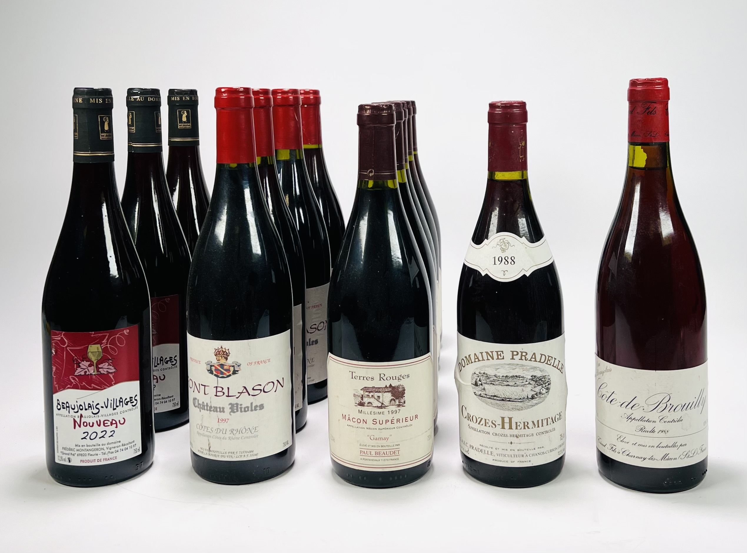 Veertien flessen rode wijn, waaronder Beaujolais Villages, Mont Blason, Macon Superieur Terres Rouge, Domaine Pradelle en Cote de Brouilly. |
